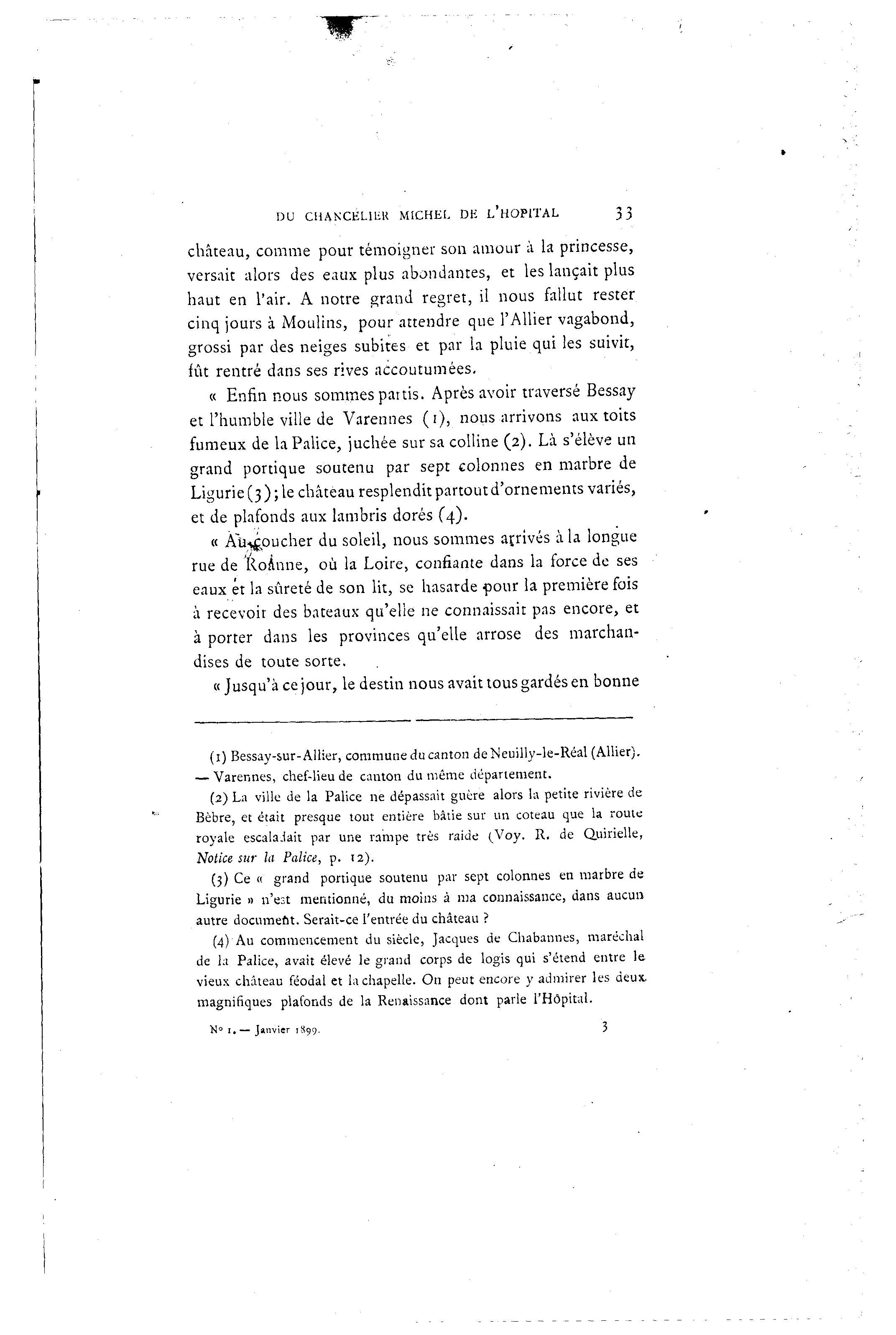 DU CHANCELIER MICHEL DE L'HOPITAL 33 château, comme pour témoigner son amour à la princesse, versait alors des eaux plus abondantes, et les lançait plus haut en l'air. A notre grand regret, il nous fallut rester cinq jours à Moulins, pour attendre que l'Allier vagabond, grossi par des neiges subites et par la pluie qui les suivit, fût rentré dans ses rives accoutumées. « Enfin nous sommes partis. Après avoir traversé Bessay et l'humble ville de Varennes ( i ) , nous arrivons aux toits fumeux de la Palice, juchée sur sa colline (2). Là s'élève un grand portique soutenu par sept colonnes en marbre de Ligurie (3) ; le château resplendit partout d'ornements variés, et de plafonds aux lambris dorés (4). « Àu^jpucher du soleil, nous sommes arjivés à la longue rue de Roanne, où la Loire, confiante dans la force de ses eaux et la sûreté de son lit, se hasarde pour la première fois à recevoir des bateaux qu'elle ne connaissait pas encore, et à porter dans les provinces qu'elle arrose des marchan- dises de toute sorte. « Jusqu'à ce jour, le destin nous avait tous gardés en bonne (1) Bessay-sur-Allier, commune du canton deNeuilly-le-Réal (Allier). — Varennes, chef-lieu de canton du même département. (2) La ville de la Palice ne dépassait guère alors la petite rivière de Bèbre, et était presque tout entière bâtie sur un coteau que la route royale escala.iait par une rampe très raide (.Voy. R. de Quirielle, Notice sur la Palice, p. 12). (3) Ce « grand portique soutenu par sept colonnes en marbre de Ligurie » n'est mentionné, du moins à ma connaissance, dans aucun autre document. Serait-ce l'entrée du château ? (4)'Au commencement du siècle, Jacques de Chabannes, maréchal de la Palice, avait élevé le grand corps de logis qui s'étend entre le vieux château féodal et la chapelle. On peut encore y admirer les deux, magnifiques plafonds de la Renaissance dont parle l'Hôpital. K° 1 . — Janvier 1S99. 3