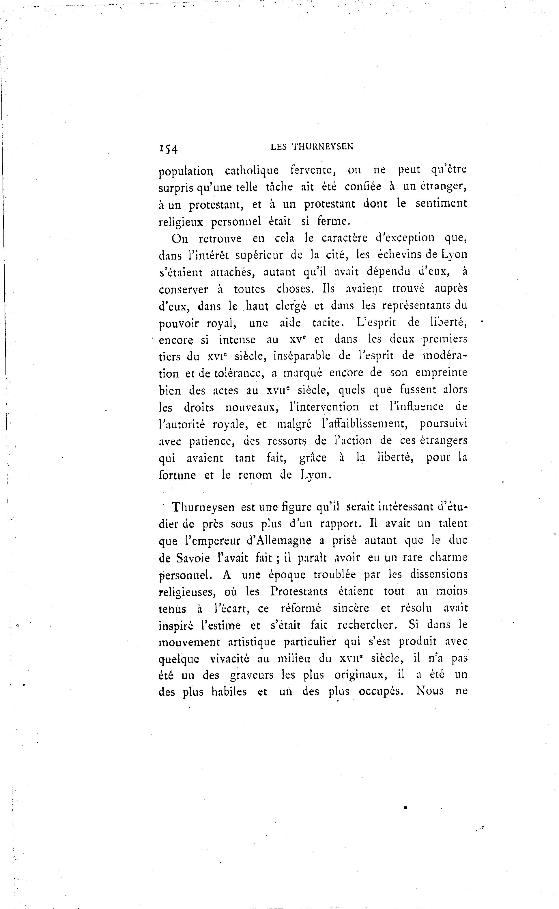 154 LES THURNEYSEN population catholique fervente, on ne peut qu'être surpris qu'une telle tâche ait été confiée à un étranger, à un protestant, et à un protestant dont le sentiment religieux personnel était si ferme. On retrouve en cela le caractère d'exception que, dans l'intérêt supérieur de la cité, les échevins de Lyon s'étaient attachés, autant qu'il avait dépendu d'eux, à conserver à toutes choses. Ils avaient trouvé auprès d'eux, dans le haut clergé et dans les représentants du pouvoir royal, une aide tacite. L'esprit de liberté, encore si intense au xve et dans les deux premiers tiers du xvic siècle, inséparable de l'esprit de modéra- tion et de tolérance, a marqué encore de son empreinte bien des actes au xva e siècle, quels que fussent alors les droits nouveaux, l'intervention et l'influence de l'autorité royale, et malgré l'affaiblissement, poursuivi avec patience, des ressorts de l'action de ces étrangers qui avaient tant fait, grâce à la liberté, pour la fortune et le renom de Lyon. Thurneysen est une figure qu'il serait intéressant d'étu- dier de près sous plus d'un rapport. Il avait un talent que l'empereur d'Allemagne a prisé autant que le duc de Savoie l'avait fait ; il paraît avoir eu un rare charme personnel. A une époque troublée par les dissensions religieuses, où les Protestants étaient tout au moins tenus à l'écart, ce réformé sincère et résolu avait inspiré l'estime et s'était fait rechercher. Si dans le mouvement artistique particulier qui s'est produit avec quelque vivacité au milieu du xvir* siècle, il n'a pas été un des graveurs les plus originaux, il a été un des plus habiles et un des plus occupés. Nous ne