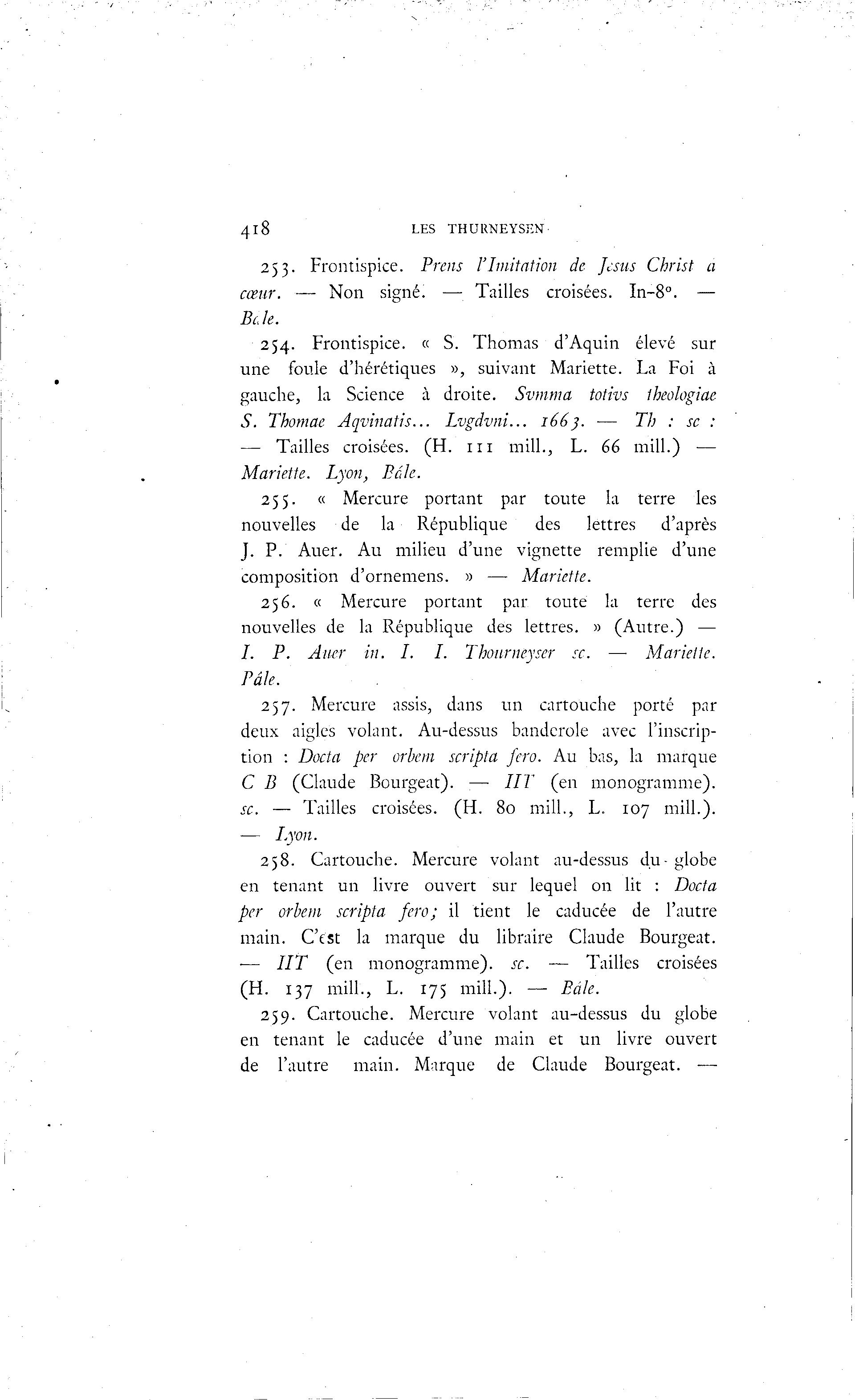 4_l8 LES THURNEYSEN 253. Frontispice. Prens l'Imitation de Jésus Christ a cœur. — Non signé. — Tailles croisées. I11-80. — Bc.le. 254. Frontispice. « S. Thomas d'Aquin élevé sur une foule d'hérétiques », suivant Mariette. La Foi à gauche, la Science à droite. Svmma totivs theologiae S. Thomae Aqvinatis... Lvgdvni... 1663. — Th : se : — Tailles croisées. (H. i n mill., L. 66 mill.) — Mariette. Lyon, Baie. 255. « Mercure portant par toute la terre les nouvelles de la République des lettres d'après J. P. Auer. Au milieu d'une vignette remplie d'une composition d'ornemens. » — Mariette. 256. « Mercure portant par toute la terre des nouvelles de la République des lettres. » (Autre.) — /. P. Auer in. I. I. Thourneyser se. —• Mariette. Pâle. 257. Mercure assis, dans un cartouche porté par deux aigles volant. Au-dessus banderole avec l'inscrip- tion : Docta per orbem scripta fcro. Au bas, la marque C B (Claude Bourgeat). :— HT (en monogramme). se. — Tailles croisées. (H. 80 mill., L. 107 mill.). — Lyon. 258. Cartouche. Mercure volant au-dessus du- globe en tenant un livre ouvert sur lequel on lit : Docta per orbem scripta fero; il tient le caducée de l'autre main. C'est la marque du libraire Claude Bourgeat. •— HT (en monogramme), se. — Tailles croisées (H. 137 mill., L. 175 mill.). — Eâle. 259. Cartouche. Mercure volant au-dessus du globe en tenant le caducée d'une main et un livre ouvert de l'autre main. Marque de Claude Bourgeat. •—