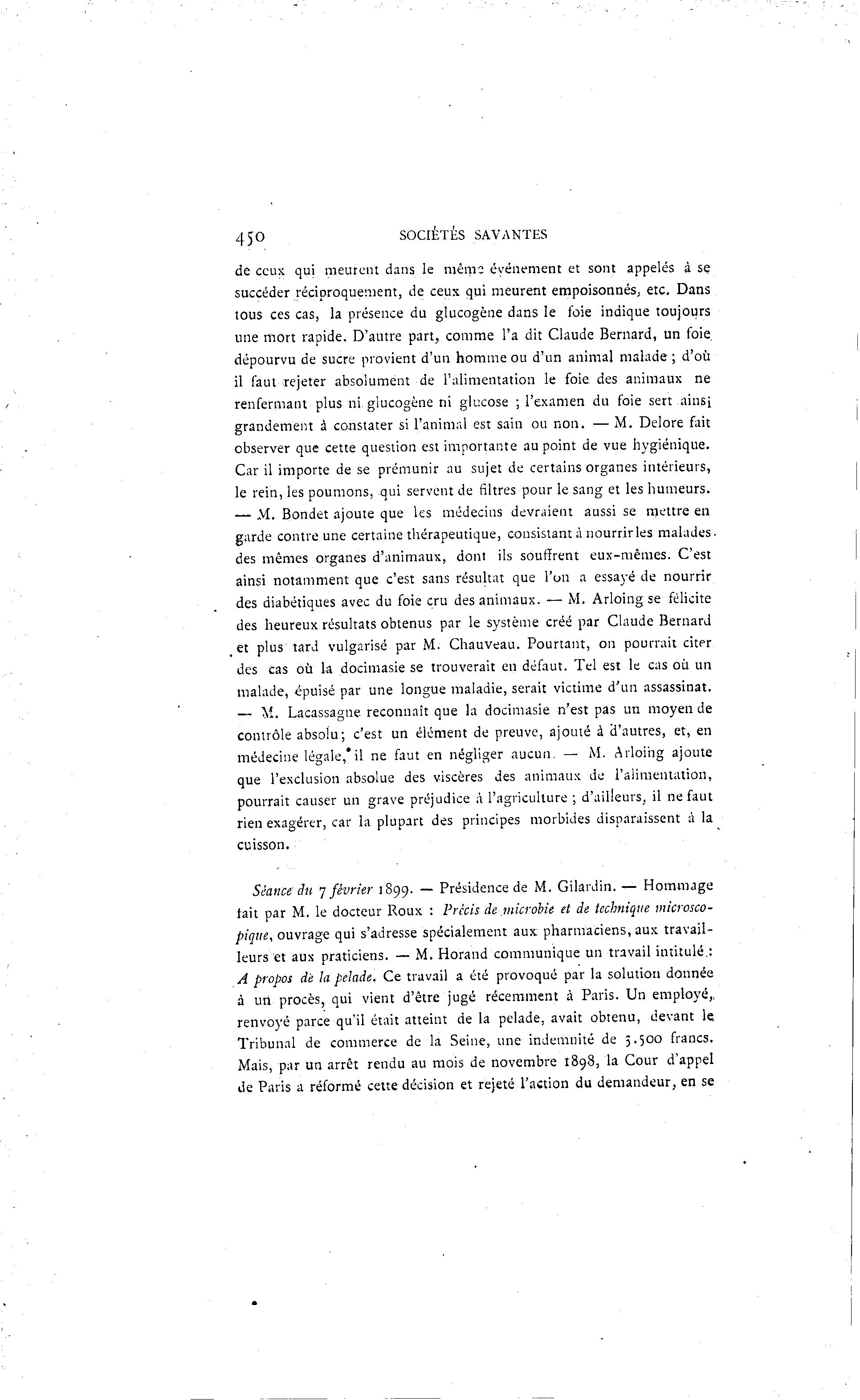 450 SOCIÉTÉS SAVANTES de ceux qui meurent dans le nièmi événement et sont appelés à se succéder réciproquement, de ceux qui meurent empoisonnés, etc. Dans tous ces cas, la présence du glucogène dans le foie indique toujours une mort rapide. D'autre part, comme l'a dit Claude Bernard, un foie, dépourvu de sucre provient d'un homme ou d'un animal malade ; d'où il faut rejeter absolument de l'alimentation le foie des animaux ne renfermant plus ni. glucogène ni glucose ; l'examen du foie sert .ainsi grandement à constater si l'animal est sain ou non. — M. Delore fait observer que cette question est importante au point de vue hygiénique. Car il importe de se prémunir au sujet de certains organes intérieurs, le rein, les poumons, qui servent de filtres pour le sang et les humeurs. — M. Bondet ajoute que les médecins devraient aussi se mettre en garde contre une certaine thérapeutique, consistant à nourrir les malades, des mêmes organes d'animaux, dont ils souffrent eux-mêmes. C'est ainsi notamment que c'est sans résultat que l'on a essayé de nourrir des diabétiques avec du foie cru des animaux. — M. Arloing se félicite des heureux résultats obtenus par le système créé par Claude Bernard _ et plus tard vulgarisé par M. Chauveau. Pourtant, on pourrait citer des cas où la docimasie se trouverait en défaut. Tel est le cas où un malade, épuisé par une longue maladie, serait victime d'un assassinat. — M. Lacassagne reconnaît que la docimasie n'est pas un moyen de contrôle absolu; c'est un élément de preuve, ajouté à d'autres, et, en médecine légale,*il ne faut en négliger aucun, — M. Arloing ajoute que l'exclusion absolue des viscères des animaux de l'alimentation, pourrait causer un grave préjudice à l'agriculture ; d'ailleurs, il ne faut rien exagérer, car la plupart des principes morbides disparaissent à la cuisson. Séance du 7 février 1899. — Présidence de M. Gilardin. — Hommage fait par M. le docteur Roux : Précis de microbie et de technique microsco- pique, ouvrage qui s'adresse spécialement aux pharmaciens, aux travail- leurs et aux praticiens. — M. Horand communique un travail intitulé.: A propos de la pelade. Ce travail a été provoqué par la solution donnée à uti procès, qui vient d'être jugé récemment à Paris. Un employé,, renvoyé parce qu'il était atteint de la pelade, avait obtenu, devant le Tribunal de commerce de la Seine, une indemnité de 5.500 francs. Mais, par un arrêt rendu au mois de novembre 1898, la Cour d'appel de Paris a réformé cette décision et rejeté l'action du demandeur, en se