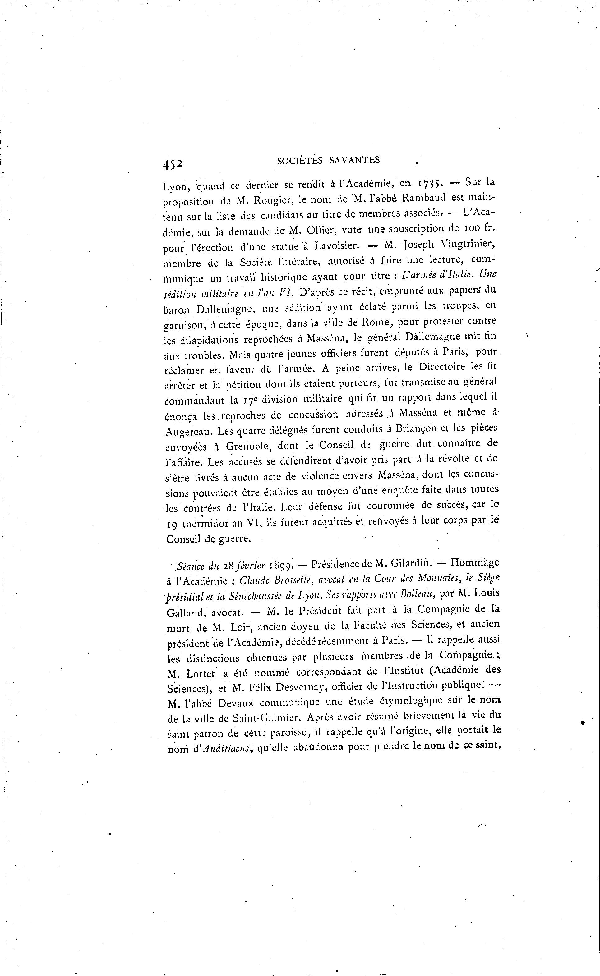 452 SOCIÉTÉS SAVANTES Lyon, quand ce dernier se rendit à l'Académie, en 1735. — Sur la proposition de M. Rougier, le nom de M. l'abbé Rambaud est main- tenu sur la liste des candidats au titre de membres associés, — L'Aca- démie, sur la demande de M. Ollier, vote une souscription de 100 fr. pour l'érection d'une statue à Lavoisier. — M. Joseph Vingtrinier, membre de la Société littéraire, autorisé à faire une lecture, com- munique un travail historique ayant pour titre : L'armée d'Italie. Une; sédition militaire en Tan VI. D'après ce récit, emprunté aux papiers du baron Dallemagne, une sédition ayant éclaté parmi h s troupes, en garnison, à cette époque, dans la ville de Rome, pour protester contre les dilapidations reprochées à Masséna, le général Dallemagne mit fin aux troubles. Mais quatre jeunes officiers furent députés à Paris, pour réclamer en faveur dé l'armée. A peine arrivés, le Directoire les fit arrêter et la pétition dont ils étaient porteurs, fut transmise au général commandant la 17e division militaire qui fit un rapport dans lequel il énonça les.reproches de concussion adressés à Masséna et même à Augereau. Les quatre délégués furent conduits à Briançon et les pièces envoyées à Grenoble, dont le Conseil ds guerre dut connaître de l'affaire. Les accusés se défendirent d'avoir pris part à la révolte et de s'être livrés à aucun acte de violence envers Masséna, dont les concus- sions pouvaient être établies au moyen d'une enquête faite dans toutes les contrées de l'Italie. Leur défense fut couronnée de succès, car le 19 thermidor an VI, ils furent acquittés et renvoyés à leur corps par.le Conseil de guerre. Séance du 28 février 1899. — Présidence de M. Gilardin. — Hommage â l'Académie : Claude Brossettè, avocat en la Cour des Monnaies, le Siège présidial et la Sénéchaussée de Lyon. Ses rapports avec Boileau, par M. Louis Galland, avocat. — M. le Président fait part à la Compagnie de.la mort de M. Loir, ancien doyen de la Faculté des Sciences, et ancien président de l'Académie, décédé récemment à Paris. — Il rappelle aussi les distinctions obtenues par plusieurs membres de la. Compagnie :: M. Lortet a été nommé correspondant de l'Institut (Académie des Sciences), et M. Félix Desvernay, officier de l'Instruction publique. — M. l'abbé Devaux communique une étude étymologique sur lé nom de la ville de Saint-Galrhier. Après avoir résumé brièvement la vie du saint patron de cette paroisse, il rappelle qu'à l'origine, elle portait le nom à 'Auditiacus, qu'elle abandonna pour prendre le nom de ce saint,
