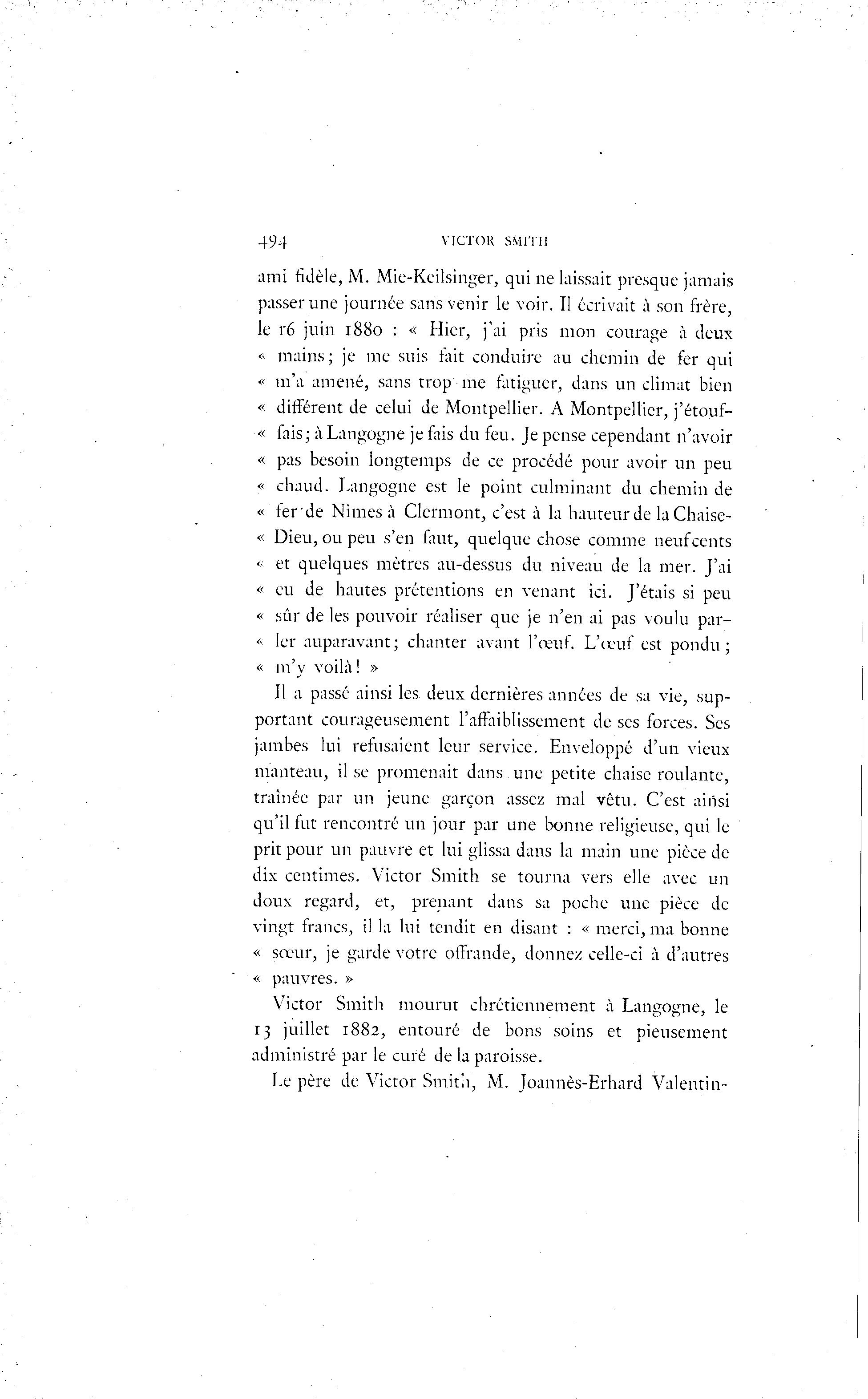 494 VICTOR SMITH ami fidèle, M. Mie-Keilsinger, qui ne laissait presque jamais passer une journée sans venir le voir. Il écrivait à son frère, le r6 juin 1880 : « Hier, j'ai pris mon courage à deux « mains; je me suis fait conduire au chemin de fer qui « m'a amené, sans trop me fatiguer, dans un climat bien « différent de celui de Montpellier. A Montpellier, j'étouf- « fais; à Langogne je fais du feu. Je pense cependant n'avoir « pas besoin longtemps de ce procédé pour avoir un peu « chaud. Langogne est le point culminant du chemin de « fer'de Nîmes à Clennont, c'est à la hauteur de laChaise- « Dieu, ou peu s'en faut, quelque chose comme neuf cents < et quelques mètres au-dessus du niveau de la mer. J'ai • « eu de hautes prétentions en venant ici. J'étais si peu « sûr de les pouvoir réaliser que je n'en ai pas voulu par- <> 1er auparavant; chanter avant l'œuf. L'œuf est pondu; « m'y voilà ! » Il a passé ainsi les deux dernières années de sa vie, sup- portant courageusement l'affaiblissement de ses forces. Ses jambes lui refusaient leur service. Enveloppé d'un vieux manteau, il se promenait dans une petite chaise roulante, traînée par un jeune garçon assez mal vêtu. C'est ainsi qu'il fut rencontré un jour par une bonne religieuse, qui le prit pour un pauvre et lui glissa dans la main une pièce de dix centimes. Victor Smith se tourna vers elle avec un doux regard, et, prenant dans sa poche une pièce de vingt francs, il la lui tendit en disant : « merci, ma bonne « sœur, je garde votre offrande, donnez celle-ci à d'autres « pauvres. » Victor Smith mourut chrétiennement à Langogne, le 13 juillet 1882, entouré de bons soins et pieusement administré par le curé de la paroisse. Le père de Victor Smith, M. Joannès-Erhard Valentin-