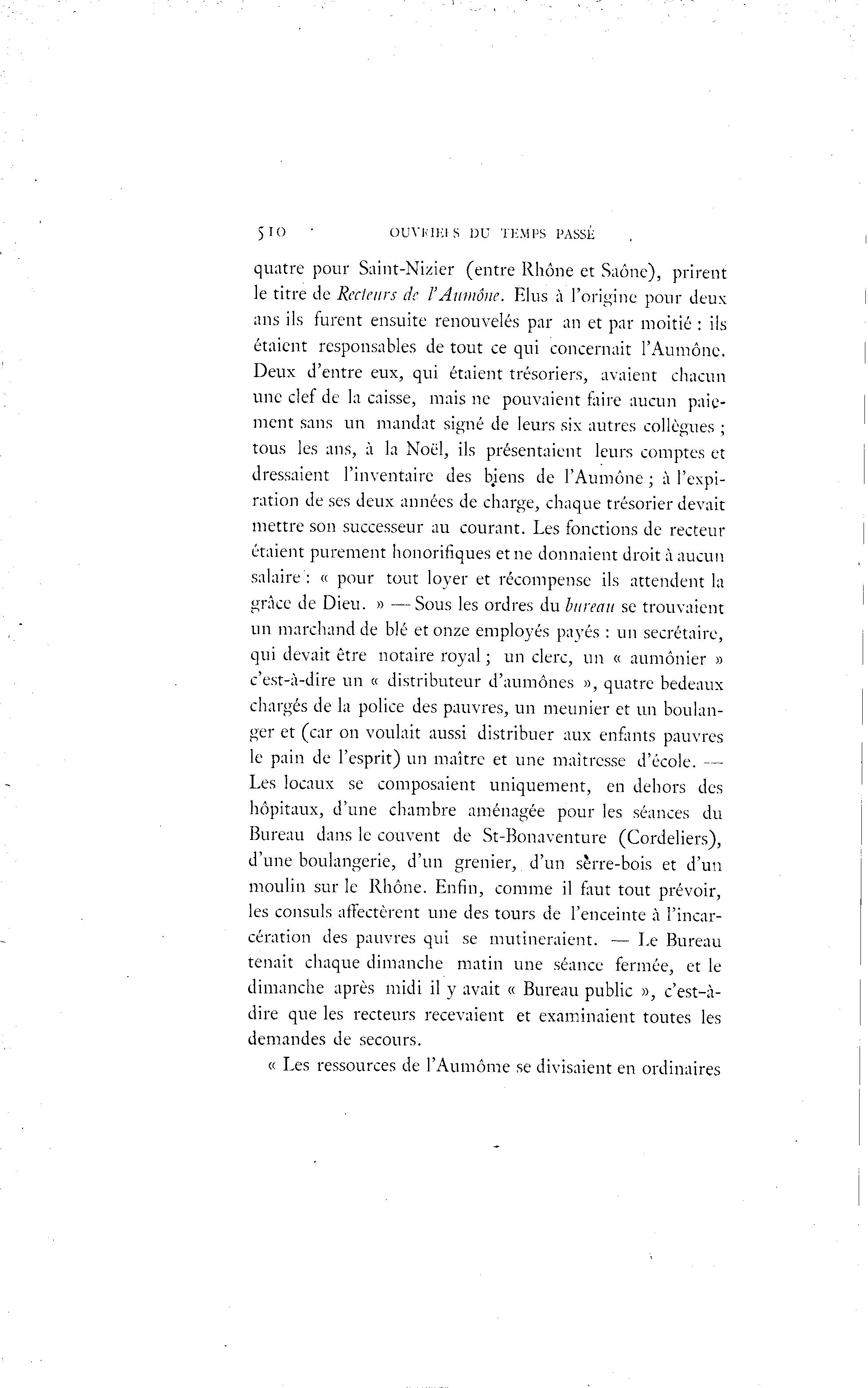 510 • OUVKI1CI S DU TEMPS PASS1- quatre pour Saint-Nizier (entre Rhône et Saône), prirent le titre de Recleiirs de l'Aumône. Elus à l'origine pour deux ans ils furent ensuite renouvelés par an et par moitié : ils étaient responsables de tout ce qui concernait l'Aumône. Deux d'entre eux, qui étaient trésoriers, avaient chacun une clef de la caisse, mais ne pouvaient faire aucun paie- ment sans un mandat signé de leurs six autres collègues ; tous les ans, à la Noël, ils présentaient leurs comptes et dressaient l'inventaire des Mens de l'Aumône ; à l'expi- ration de ses deux années de charge, chaque trésorier devait mettre son successeur au courant. Les fonctions de recteur étaient purement honorifiques et ne donnaient droit à aucun salaire : « pour tout loyer et récompense ils attendent la grâce de Dieu. » —Sous les ordres du bureau se trouvaient un marchand de blé et onze employés payés : un secrétaire, qui devait être notaire royal ; un clerc, un « aumônier » c'est-à -dire un « distributeur d'aumônes », quatre bedeaux chargés de la police des pauvres, un meunier et un boulan- ger et (car on voulait aussi distribuer aux enfants pauvres le pain de l'esprit) un maître et une maîtresse d'école. — Les locaux se composaient uniquement, en dehors des hôpitaux, d'une chambre aménagée pour les séances du Bureau dans le couvent de St-Bonaventure (Cordeliers), d'une boulangerie, d'un grenier, d'un sèrre-bois et d'un moulin sur le Rhône. Enfin, comme il faut tout prévoir, les consuls affectèrent une des tours de l'enceinte à l'incar- cération des pauvres qui se mutineraient. — Le Bureau tenait chaque dimanche matin une séance fermée, et le dimanche après midi il y avait « Bureau public », c'est-à - dire que les recteurs recevaient et examinaient toutes les demandes de secours. « Les ressources de l'Aumôme se divisaient en ordinaires