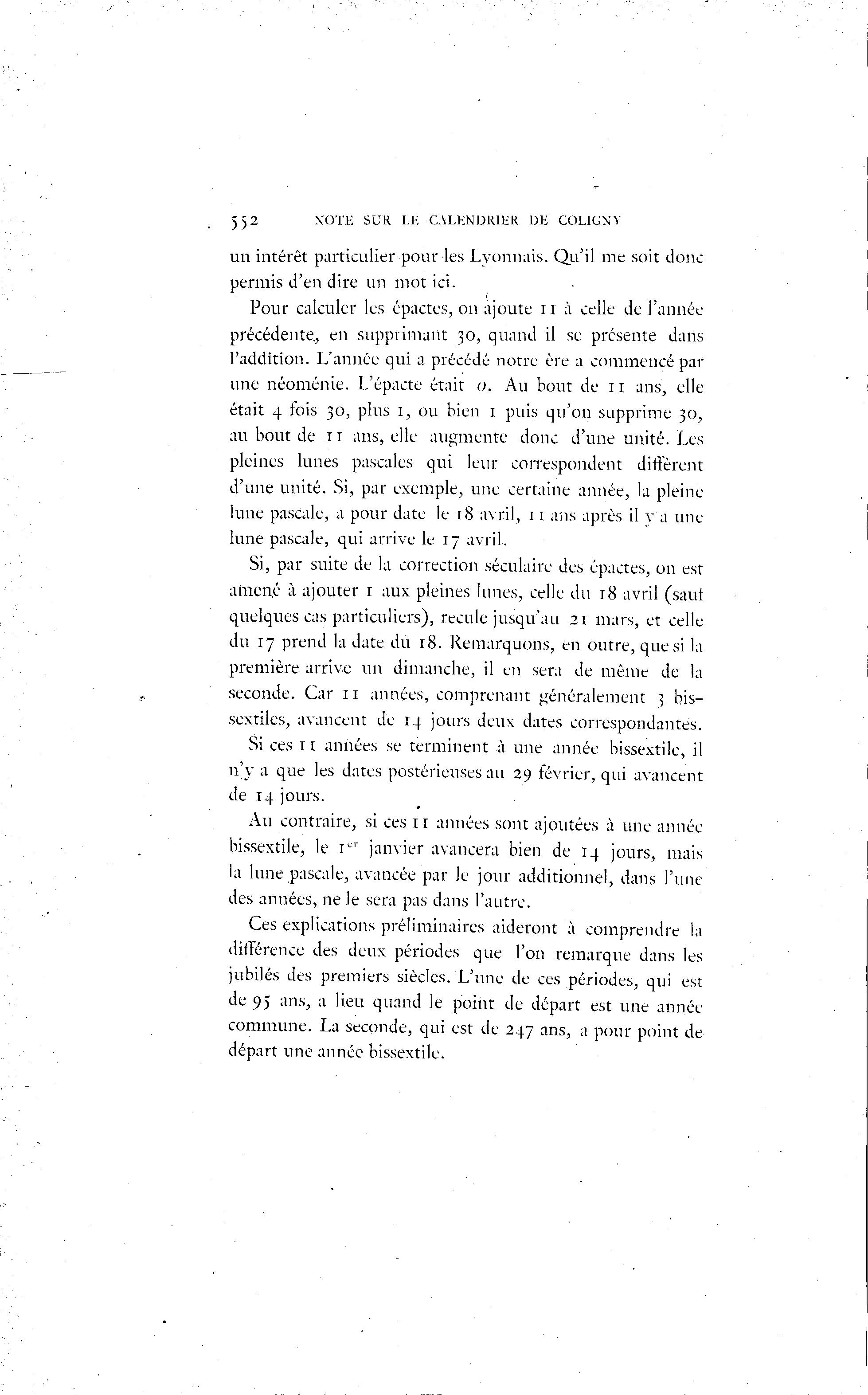 5)2 N'OTK SUR LK CALKNDR1KR DE COL1GNY un intérêt particulier pour les Lyonnais. Qu'il me soit donc permis d'en dire un mot ici. Pour calculer les épactes, on ajoute n à celle de l'année précédente., en supprimant 30, quand il se présente dans l'addition. L'année qui a précédé notre ère a commencé par une néoménie. L'épacte était o. Au bout de 11 ans, elle était 4 fois 30, plus 1, ou bien 1 puis qu'on supprime 30, au bout de n ans, elle augmente donc d'une unité. Les pleines lunes pascales qui leur correspondent diffèrent d'une unité. Si, par exemple, une certaine année, la pleine lune pascale, a pour date le 18 avril, n ans après il y a une lune pascale, qui arrive le 17 avril. Si, par suite de la correction séculaire des épactes, on est amené à ajouter 1 aux pleines lunes, celle du 18 avril (sauf quelques cas particuliers), recule jusqu'au 21 mars, et celle du 17 prend la date du 18. Remarquons, en outre, que si la première arrive un dimanche, il en sera de même de la seconde. Car 11 années, comprenant généralement 3 bis- sextiles, avancent de 14 jours deux dates correspondantes. Si ces n années se terminent à une année bissextile, il n'y a que les dates postérieuses au 29 février, qui avancent de 14 jours. Au contraire, si ces 11 années sont ajoutées à une année bissextile, le icl" janvier avancera bien de 14 jours, mais la lune pascale, avancée par Je jour additionnel, dans l'une des années, ne le sera pas dans l'autre. Ces explications préliminaires aideront à comprendre la différence des deux périodes que l'on remarque dans les jubilés des premiers siècles. L'une de ces périodes, qui est de 95 ans, a lieu quand le point de départ est une année- commune. La seconde, qui est de 247 ans, a pour point de- départ une année bissextile.