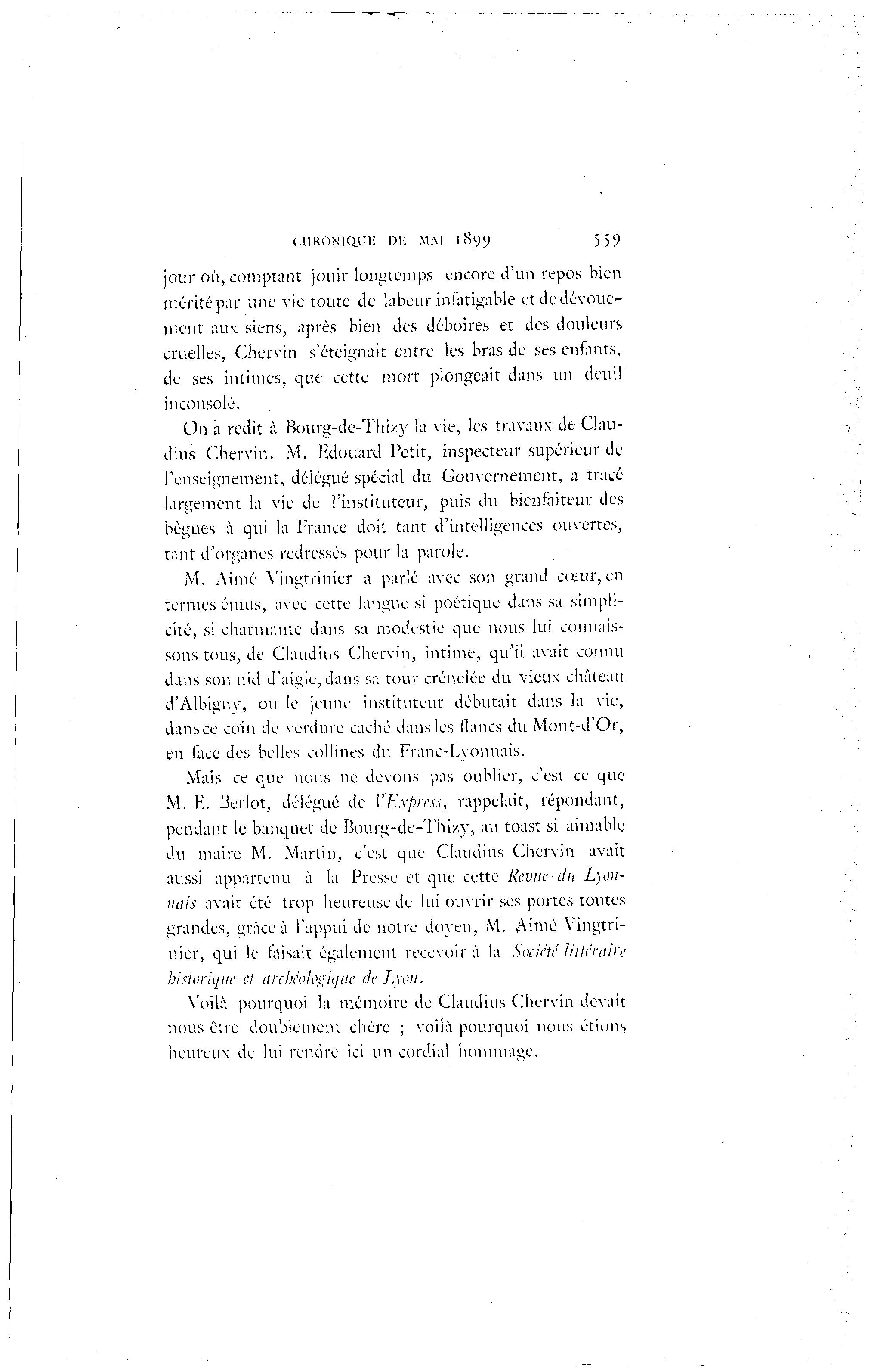 CMRONIQI'K DK MM 1899 559 jour où, comptant jouir longtemps encore d'un repos bien mérité par une vie toute de labeur infatigable et de dévoue- ment aux siens, après bien des déboires et des douleurs cruelles, Chervin s'éteignait entre les bras de ses enfants, de ses intimes, que cette mort plongeait dans un deuil inconsolé. On a redit à Bourg-de-Thizy la vie, les travaux de Clau- dius Chervin. M. Edouard Petit, inspecteur supérieur de l'enseignement, délégué spécial du Gouvernement, a tracé largement la vie de l'instituteur, puis du bienfaiteur des bègues à qui la France doit tant d'intelligences ouvertes, tant d'organes redressés pour la parole. M. Aimé Yingtrinier a parlé avec son grand cœur, en termes émus, avec cette langue si poétique dans sa simpli- cité, si charmante dans sa modestie que nous lui connais- sons tous, de Claudius Chervin, intime, qu'il avait connu dans son nid d'aigle, dans sa tour crénelée du vieux château d'Albigny, où le jeune instituteur débutait dans la vie, dans ce coin de verdure caché dans les flancs du Mont-d'Or, en face des belles collines dit Franc-Lvonnais. Mais ce que nous ne devons pas oublier, c'est ce que M. F'. Berlot, délégué de l'Express, rappelait, répondant, pendant le banquet de Bourg-de-Thizy, au toast si aimable du maire M. Martin, c'est que Claudius Chervin avait aussi appartenu à la Presse et que cette Revue du Lyon- nais avait été trop heureuse de lui ouvrir ses portes toutes grandes, grâce à l'appui de notre doyen, M. Aimé Yingtri- nier, qui le faisait également recevoir à la Société littéraire historique et archéologique de Lyon. Voilà pourquoi la mémoire de Claudius Chervin devait nous être doublement chère ; voila pourquoi nous étions heureux de lui rendre ici un cordial hommage.