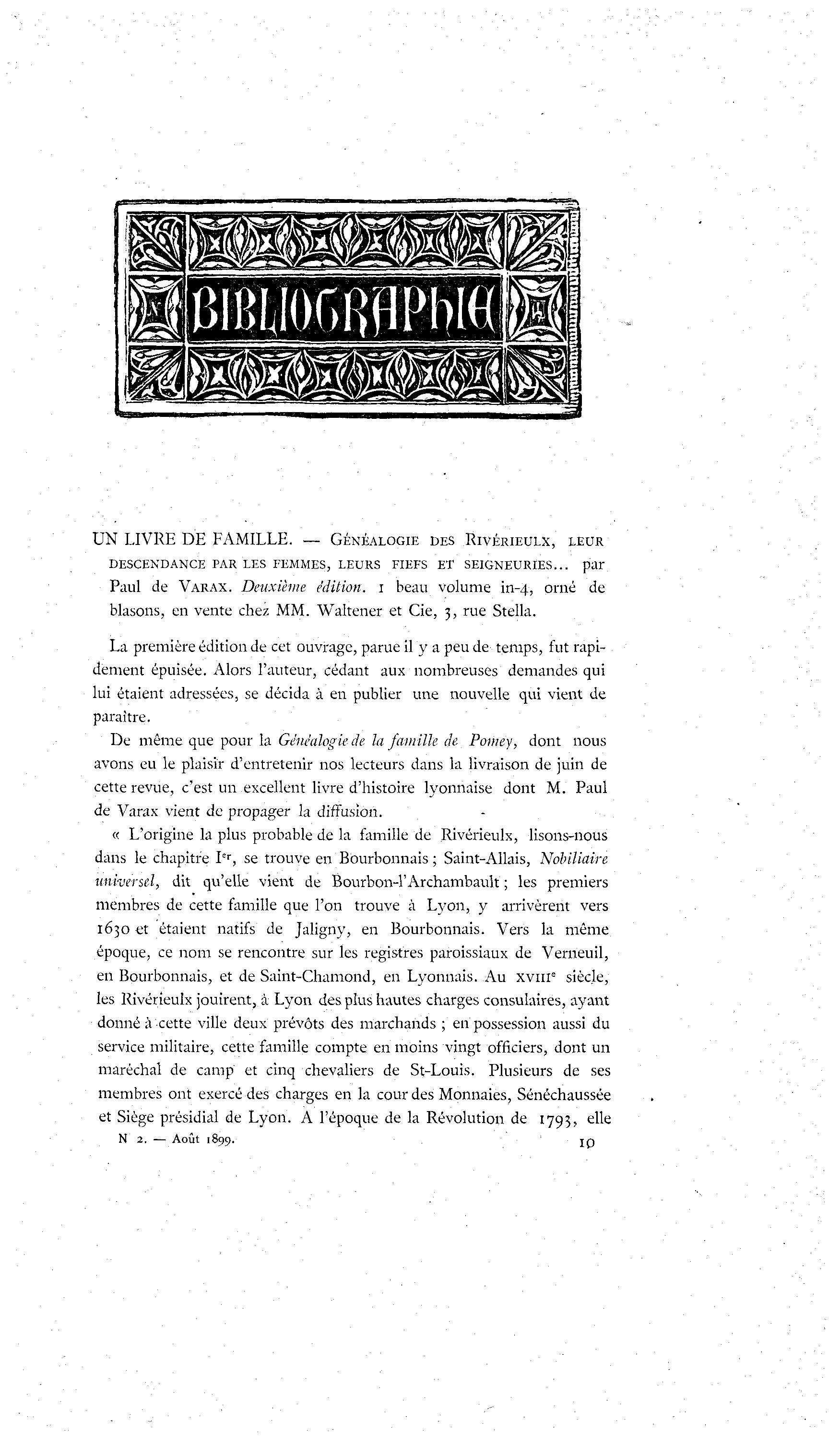 UN LIVRE DE FAMILLE. — GÉNÉALOGIE DES RIVÉRIEULX, LEUR DESCENDANCE PAR LES FEMMES, LEURS FIEFS E T S E I G N E U R I E S . . . p a r Paul de VARAX. Deuxième édition, i beau volume in-4, orné de blasons, en vente chez MM. Waltener et Cie, 3, rue Stella. La première édition de cet ouvrage, parue il y a peu de temps, fut rapi- dement épuisée. Alors l'auteur, cédant aux nombreuses demandes qui lui étaient adressées, se décida à en publier une nouvelle qui vient de paraître. De même que pour la Généalogie de la famille de Pomey, dont nous avons eu le plaisir d'entretenir nos lecteurs dans la livraison de juin de cette revue, c'est un excellent livre d'histoire lyonnaise dont M. Paul de Varax vient de propager la diffusion. « L'origine la plus probable de la famille de Rivérieulx, lisons-nous dans le chapitre I er , se trouve en Bourbonnais ; Saint-Allais, Nobiliaire universel, dit qu'elle vient de Bourbon-1'Archambault ; les premiers membres de cette famille que l'on trouve à Lyon, y arrivèrent vers 1630 et étaient natifs de Jaligny, en Bourbonnais. Vers la même époque, ce nom se rencontre sur les registres paroissiaux de Verneuil, en Bourbonnais, et de Saint-Chamond, en Lyonnais. Au x v n r siècle, les Rivérieulx jouirent, à Lyon des plus hautes charges consulaires, ayant donné à cette ville deux prévôts des marchands ; en possession aussi du service militaire, cette famille compte en moins vingt officiers, dont un maréchal de camp et cinq chevaliers de St-Louis. Plusieurs de ses membres ont exercé des charges en la cour des Monnaies, Sénéchaussée et Siège présidial de Lyon. A l'époque de la Révolution de 1793, elle N 2. — Août 1899. 10