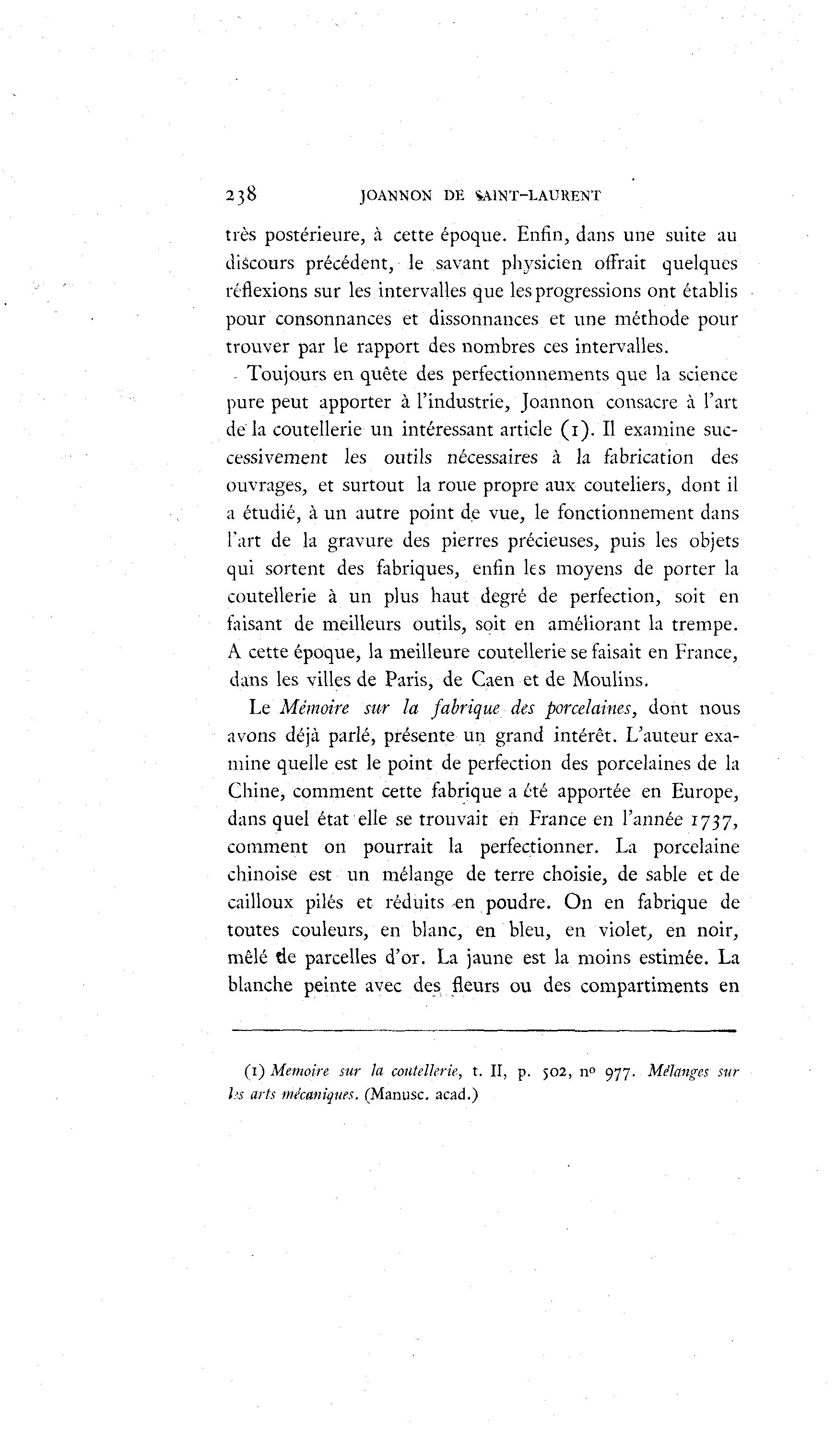 238 JOANNON DE SAINT-LAURENT très postérieure, à cette époque. Enfin, dans une suite au discours précédent, le savant physicien offrait quelques réflexions sur les intervalles que les progressions ont établis pour consonnances et dissonnances et une méthode pour trouver par le rapport des nombres ces intervalles. - Toujours en quête des perfectionnements que la science pure peut apporter à l'industrie, Joannon consacre à l'art dé la coutellerie un intéressant article (1). Il examine suc- cessivement les outils nécessaires à la fabrication des ouvrages, et surtout la roue propre aux couteliers, dont il a étudié, à un autre point de vue, le fonctionnement dans l'art de la gravure des pierres précieuses, puis les objets qui sortent des fabriques, enfin les moyens de porter la coutellerie à un plus haut degré de perfection, soit en faisant de meilleurs outils, soit en améliorant la trempe. A cette époque, la meilleure coutellerie se faisait en France, dans les villes de Paris, de Caen et de Moulins. Le Mémoire sur la fabrique des porcelaines, dont nous avons déjà parlé, présente un grand intérêt. L'auteur exa- mine quelle est le point de perfection des porcelaines de la Chine, comment cette fabrique a été apportée en Europe, dans quel état elle se trouvait eh France en l'année 1737, comment on pourrait la perfectionner. La porcelaine chinoise est un mélange de terre choisie, de sable et de cailloux piles et réduits en poudre. On en fabrique de toutes couleurs, en blanc, en bleu, en violet, en noir, mêlé de parcelles d'or. La jaune est la moins estimée. La blanche peinte avec des fleurs ou des compartiments en (1) Mémoire sur la coutellerie, t. II, p. 502, n° 977. Mélanges sur lis arts mécaniques. (Manusc. acad.)