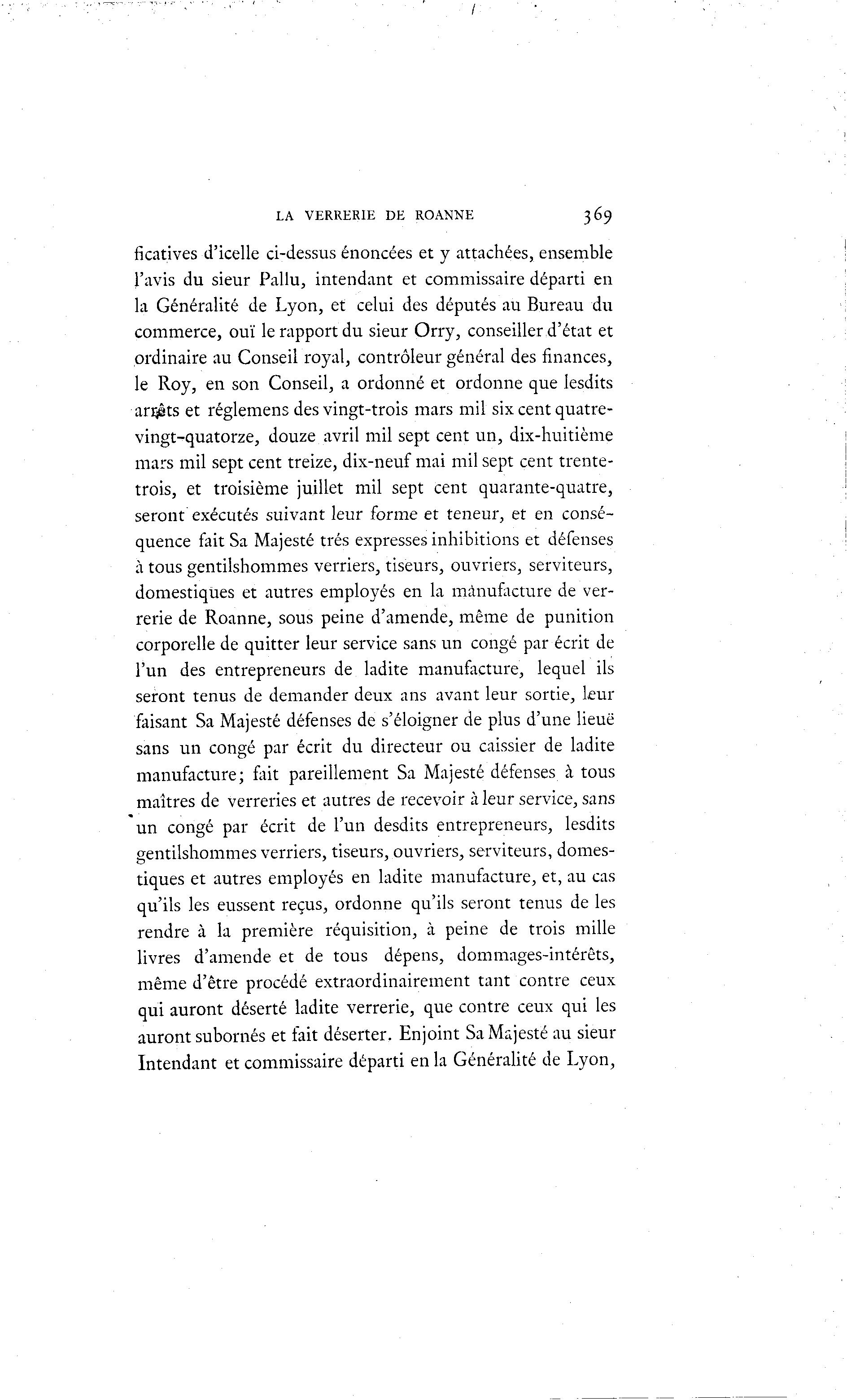 LA VERRERIE DE ROANNE 369 ficatives d'icelle ci-dessus énoncées et y attachées, ensemble l'avis du sieur Pallu, intendant et commissaire départi en la Généralité de Lyon, et celui des députés au Bureau du commerce, ouï le rapport du sieur Orry, conseiller d'état et ordinaire au Conseil royal, contrôleur général des finances, le Roy, en son Conseil, a ordonné et ordonne que lesdits anpts e t réglemens des vingt-trois mars mil six cent quatre- vingt-quatorze, douze avril mil sept cent un, dix-huitième mars mil sept cent treize, dix-neuf mai mil sept cent trente- trois, et troisième juillet mil sept cent quarante-quatre, seront exécutés suivant leur forme et teneur, et en consé- quence fait Sa Majesté très expresses inhibitions et défenses à tous gentilshommes verriers, tiseurs, ouvriers, serviteurs, domestiques et autres employés en la manufacture de ver- rerie de Roanne, sous peine d'amende, même de punition corporelle de quitter leur service sans un congé par écrit de l'un des entrepreneurs de ladite manufacture, lequel ils seront tenus de demander deux ans avant leur sortie, leur faisant Sa Majesté défenses de s'éloigner de plus d'une lieuë sans un congé par écrit du directeur ou caissier de ladite manufacture; fait pareillement Sa Majesté défenses à tous maîtres de verreries et autres de recevoir à leur service, sans un congé par écrit de l'un desdits entrepreneurs, lesdits gentilshommes verriers, tiseurs, ouvriers, serviteurs, domes- tiques et autres employés en ladite manufacture, et, au cas qu'ils les eussent reçus, ordonne qu'ils seront tenus de les rendre à la première réquisition, à peine de trois mille livres d'amende et de tous dépens, dommages-intérêts, même d'être procédé extraordinairement tant contre ceux qui auront déserté ladite verrerie, que contre ceux qui les auront subornés et fait déserter. Enjoint Sa Majesté au sieur Intendant et commissaire départi en la Généralité de Lyon,