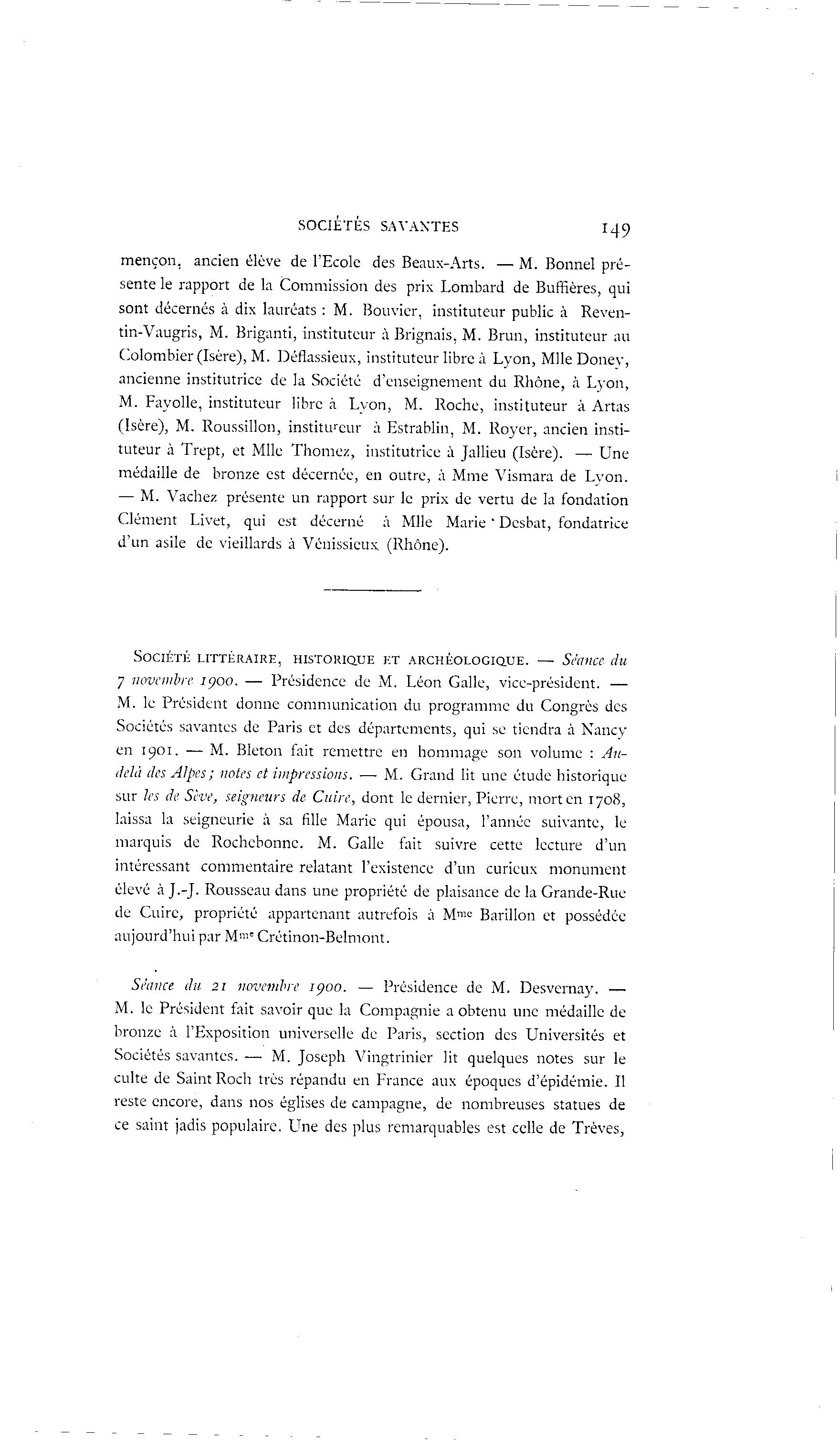 SOCIÉTÉS SAVANTES 149 mençon, ancien élève de l'Ecole des Beaux-Arts. — M. Bonnel pré- sente le rapport de la Commission des prix Lombard de Buffières, qui sont décernés à dix lauréats : M. Bouvier, instituteur public à Reven- tin-Vaugris, M. Briganti, instituteur à Brignais, M. Brun, instituteur au Colombier (Isère), M. Déflassieux, instituteur libre à Lyon, Mlle Donev, ancienne institutrice de la Société d'enseignement du Rhône, à Lyon, M. Fayolle, instituteur libre à Lvon, M. Roche, instituteur à Artas (Isère), M. Roussillon, institu r eur à Estrablin, M. Royer, ancien insti- tuteur à Trept, et Mlle Thomez, institutrice à Jallieu (Isère). — Une médaille de bronze est décernée, en outre, à Mme Vismara de Lyon. — M. Vachez présente un rapport sur le prix de vertu de la fondation Clément Livet, qui est décerné à Mlle Marie ' Desbat, fondatrice d'un asile de vieillards à Vénissieux (Rhône). SOCIÉTÉ LITTÉRAIRE, HISTORIQUE ET ARCHÉOLOGIQUE. — Séance du 7 novembre 1900. — Présidence de M. Léon Galle, vice-président. — M. le Président donne communication du programme du Congrès des Sociétés savantes de Paris et des départements, qui se tiendra à Nancy en 1901. — M. Bleton fait remettre en hommage son volume : Au- delà des Alpes ; notes et impressions. — M. Grand lit une étude historique sur les de Sève, seigneurs de Cuire, dont le dernier, Pierre, mort en 1708, laissa la seigneurie à sa fille Marie qui épousa, l'année suivante, le marquis de Rochcbonnc. M. Galle fait suivre cette lecture d'un intéressant commentaire relatant l'existence d'un curieux monument élevé à J.-J. Rousseau dans une propriété de plaisance de la Grande-Rue de Cuire, propriété appartenant autrefois à M mc Barillon et possédée aujourd'hui par M mc Crétinon-Belmont. Séance du 21 novembre 1900, — Présidence de M. Desvernay. — M. le Président fait savoir que la Compagnie a obtenu une médaille de bronze à l'Exposition universelle de Paris, section des Universités et Sociétés savantes. —• M. Joseph Vingtrinier lit quelques notes sur le culte de Saint Roch très répandu en France aux époques d'épidémie. Il reste encore, dans nos églises de campagne, de nombreuses statues de ce saint jadis populaire. LTne des plus remarquables est celle de Trêves,