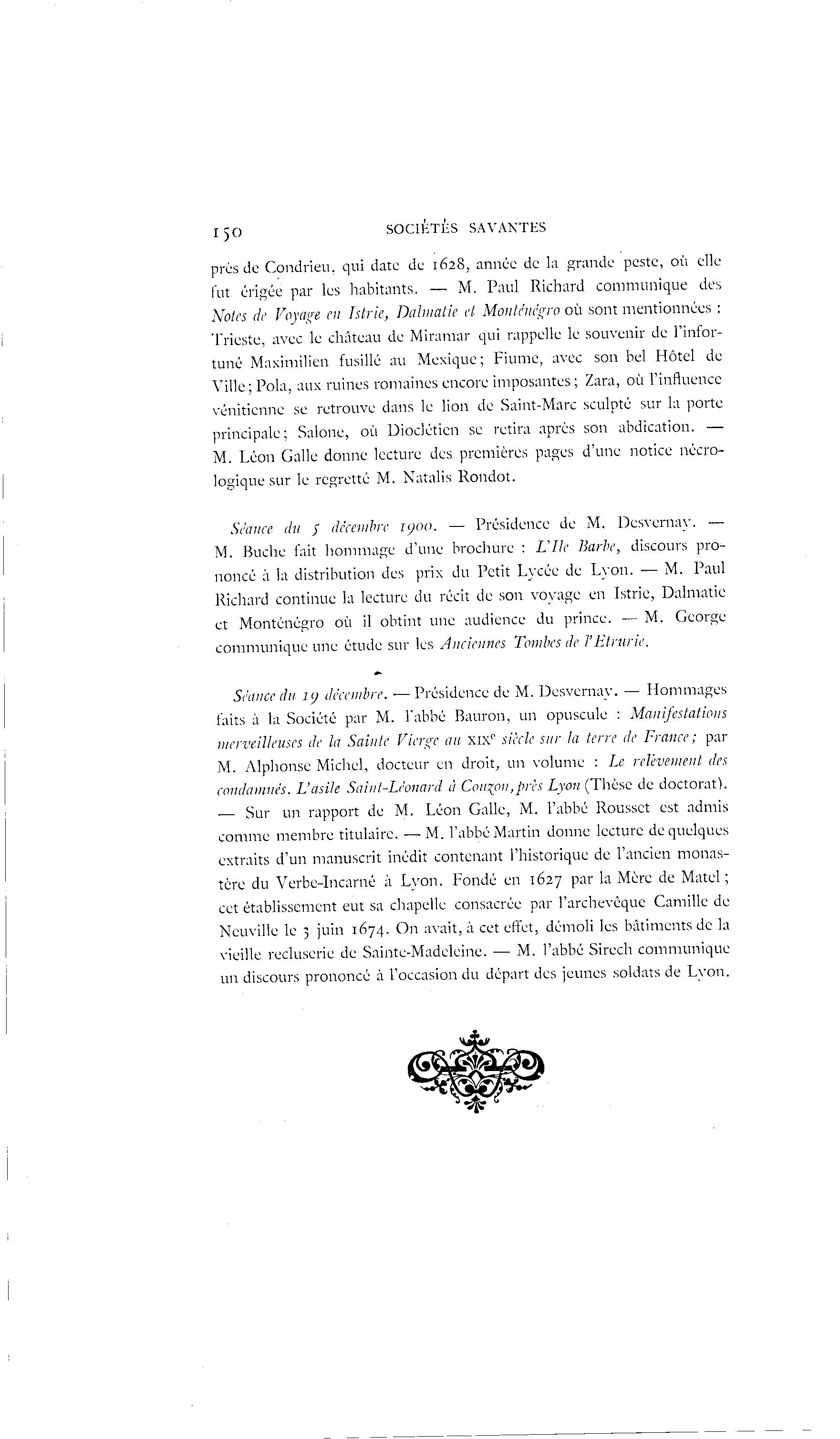150 SOCIÉTÉS SAVANTES prés de Condrieu. qui date de 1628, année de la grande peste, où elle fut érigée par les habitants. — M. Paul Richard communique des Notes île Voyage en Istrie, Dahiialie cl Monténégro où sont mentionnées : Trieste, avec le château de Miramar qui rappelle le souvenir de l'infor- tuné Maximilien fusillé au Mexique ; Fiume, avec son bel Hôtel de Ville ; Pola, aux ruines romaines encore imposantes ; Zara, où l'influence vénitienne se retrouve dans le lion de Saint-Marc sculpté sur la porte principale ; Salone, où Dioelétien se retira après son abdication. — M. Léon Galle donne lecture des premières pages d'une notice nécro- logique sur le regretté M. Natalis Rondot. Séance du y décembre KJOO. — Présidence de M. Desvernav. — M. Bûche fait hommage d'une brochure : L'Ile Barbe, discours pro- noncé à la distribution des prix du Petit Lycée de Lvon. — M. Paul Richard continue la lecture du récit de son voyage en Istrie, Dalmatie et Monténégro où il obtint une audience du prince. — M. George communique une étude sur les Anciennes Tombes de l'Htrurie. Séance du KJ décembre. •— Présidence de M. Desvernav. — Hommages faits à la Société par M. l'abbé Bauron, un opuscule : Manifestations merveilleuses de la Sainte Vierge an xix1" siècle sur la terre de France; par M. Alphonse Michel, docteur en droit, un volume : Le relèvement des condamnés. L'asile Saint-Léonard à Coupon,près Lyon (Thèse de doctorat). — Sur un rapport de M. Léon Galle, M. l'abbé Roussct est admis comme membre titulaire. — M . l'abbé Martin donne lecture de quelques extraits d'un manuscrit inédit contenant l'historique de l'ancien monas- tère du Verbe-Incarné à Lvon. Fondé en 1627 par la Mère de Matel ; cet établissement eut sa chapelle consacrée par l'archevêque Camille de Neuville le 5 juin 1674. On avait, à cet effet, démoli les bâtiments de la vieille recluserie de Sainte-Madeleine. — M. l'abbé Sirech communique un discours prononcé à l'occasion du départ des jeunes soldats de Lvon.