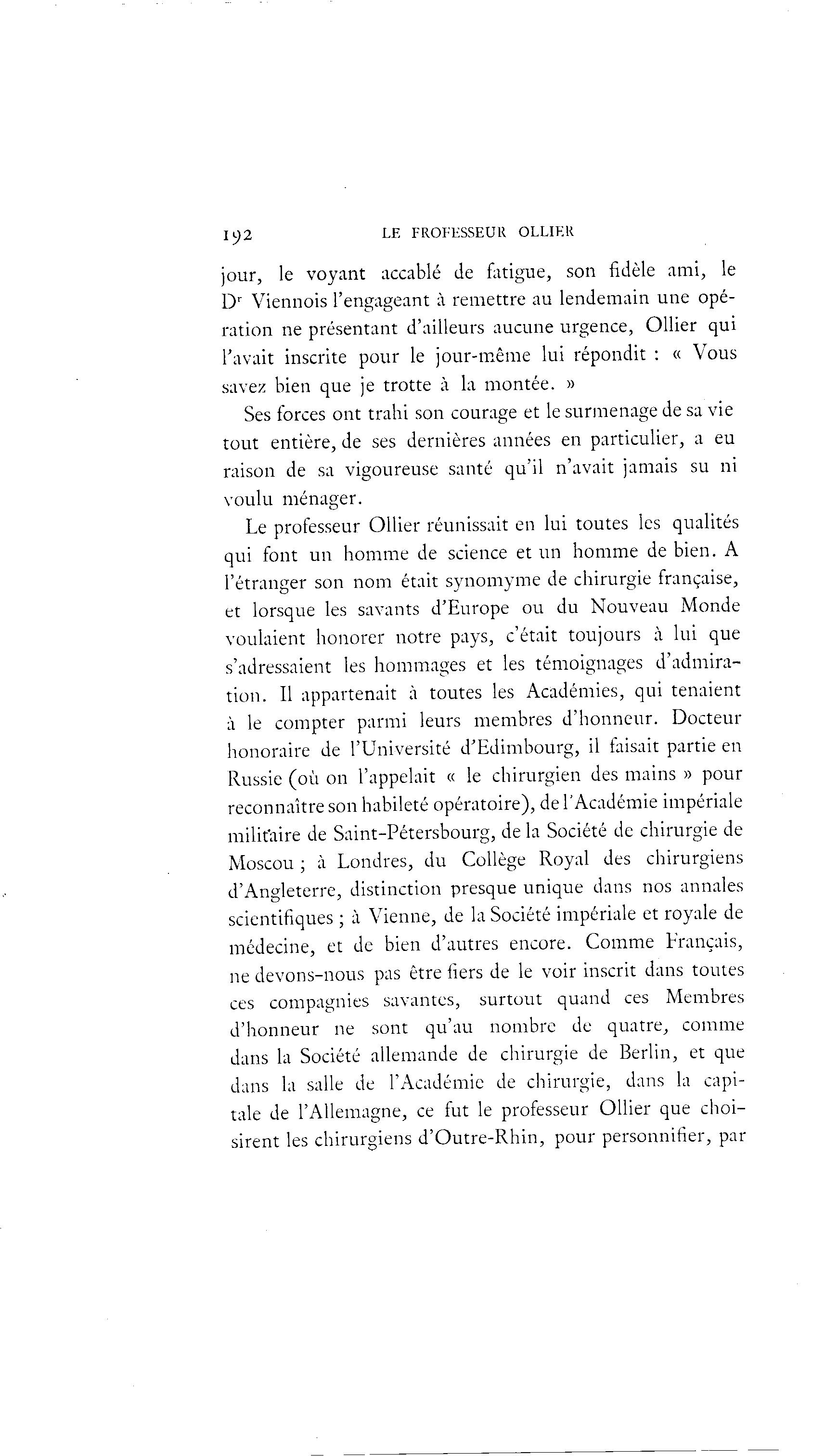 1^2 LE PROFESSEUR OLLIER jour, le voyant accablé de fatigue, son fidèle ami, le D r Viennois l'engageant à remettre au lendemain une opé- ration ne présentant d'ailleurs aucune urgence, Ollier qui l'avait inscrite pour le jour-même lui répondit : « Vous savez bien que je trotte à la montée. » Ses forces ont trahi son courage et le surmenage de sa vie tout entière, de ses dernières années en particulier, a eu raison de sa vigoureuse santé qu'il n'avait jamais su ni voulu ménager. Le professeur Ollier réunissait en lui toutes les qualités qui font un homme de science et un homme de bien. A l'étranger son nom était synomyme de chirurgie française, et lorsque les savants d'Europe ou du Nouveau Monde voulaient honorer notre pays, c'était toujours à lui que s'adressaient les hommages et les témoignages d'admira- tion. Il appartenait à toutes les Académies, qui tenaient à le compter parmi leurs membres d'honneur. Docteur honoraire de l'Université d'Edimbourg, il faisait partie en Russie (où on l'appelait « le chirurgien des mains » pour reconnaître son habileté opératoire), de l'Académie impériale militaire de Saint-Pétersbourg, de la Société de chirurgie de Moscou ; à Londres, du Collège Royal des chirurgiens d'Angleterre, distinction presque unique dans nos annales scientifiques ; à Vienne, de la Société impériale et royale de médecine, et de bien d'autres encore. Comme Français, ne devons-nous pas être fiers de le voir inscrit dans toutes ces compagnies savantes, surtout quand ces Membres d'honneur ne sont qu'au nombre de quatre, comme dans la Société allemande de chirurgie de Berlin, et que dans la salle de l'Académie de chirurgie, dans la capi- tale de l'Allemagne, ce fut le professeur Ollier que choi- sirent les chirurgiens d'Outre-Rhin, pour personnifier, par