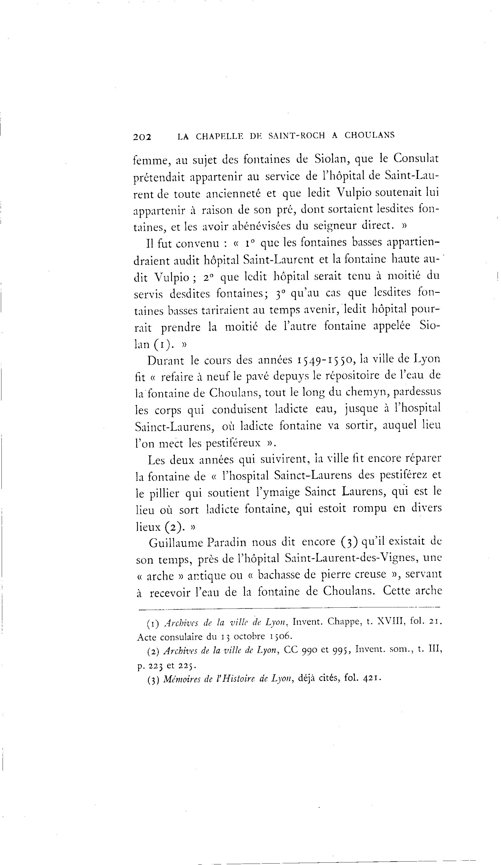 202 LA CHAPELLE DE SAINT-ROCH A CHOULANS femme, au sujet des fontaines de Siolan, que le Consulat prétendait appartenir au service de l'hôpital de Saint-Lau- rent de toute ancienneté et que ledit Vulpio soutenait lui appartenir à raison de son pré, dont sortaient lesdites fon- taines, et les avoir abénévisées du seigneur direct. » Il fut convenu : « i° que les fontaines basses appartien- draient audit hôpital Saint-Laurent et la fontaine haute au- ' dit Vulpio ; 2° que ledit hôpital serait tenu à moitié du servis desdites fontaines; 30 qu'au cas que lesdites fon- taines basses tariraient au temps avenir, ledit hôpital pour- rait prendre la moitié de l'autre fontaine appelée Sio- lan (1). » Durant le cours des années 1549-15 50, la ville de Lyon fit « refaire à neuf le pavé depuys le répositoire de l'eau de la fontaine de Choulans, tout le long du chemyn, pardessus les corps qui conduisent ladicte eau, jusque à l'hospital Sainct-Laurens, où ladicte fontaine va sortir, auquel lieu l'on mect les pestiléreux ». Les deux années qui suivirent, la ville fit encore réparer la fontaine de « l'hospital Sainct-Laurens des pestiférez et le pillier qui soutient l'ymaige Sainct Laurens, qui est le lieu où sort ladicte fontaine, qui estoit rompu en divers lieux (2). » Guillaume Paradin nous dit encore (3) qu'il existait de son temps, près de l'hôpital Saint-Laurent-des-Vignes, une « arche » antique ou « bâchasse de pierre creuse », servant à recevoir l'eau de la fontaine de Choulans. Cette arche (1) Archives de la ville de Lyon. Invent. Chappe, t. XVIII, fol. 21. Acte consulaire du 13 octobre 1506. (2) Archives de la ville de Lyon, CC 990 et 995, Invent, som., t. III, p. 223 et 225. (3) Mémoires de l'Histoire de Lyon, déjà cités, fol. 421.
