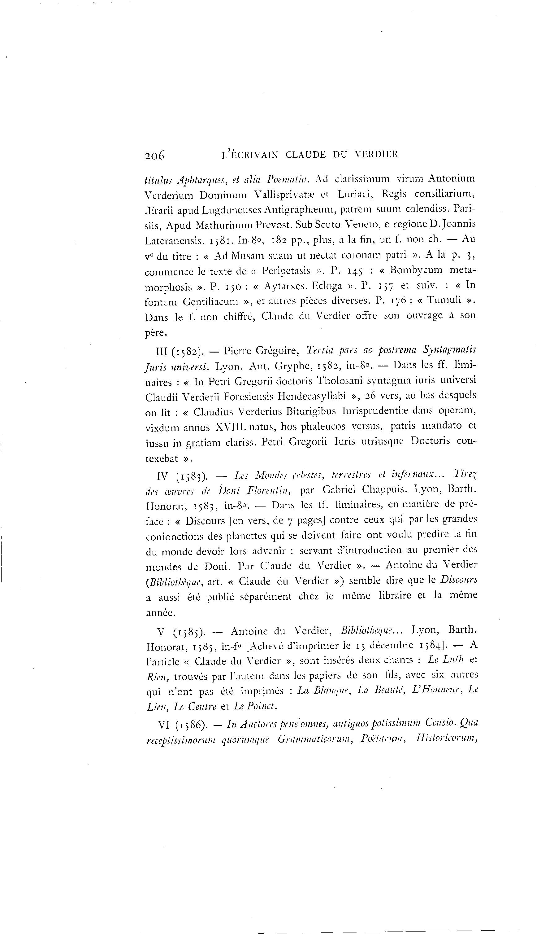 206 L'ÉCRIVAIN CLAUDE DU VERDIER titulus Aphtarques, et alia Poematia. Ad clarissimum virum Antonium Verderium Dominum Vallisprivata: et Luriaci, Régis consiliarium, /Erarii apud Lugduneuses Amigraphasum, patrem suum colendiss. Pari- siis, Apud Mathurinum Prévost. Sub Scuto Veneto, e regioneD.Joannis Lateranensis. 1581. In-8°, 182 pp.. plus, à la fin, un f. non ch. — Au v° du titre : « Ad Musam suam ut nectat coronam patri ». A la p. 3, commence le texte de « Peripetasis ». P. 145 : « Bombycum meta- morphosis ». P. 150 : « Aytarxes. Ecloga ». P. 157 et suiv. : « In fontem Gentiliacum », et autres pièces diverses. P. 176 : « Tumuli ». Dans le f. non chiffré, Claude du Verdier offre son ouvrage à son père. III (1582). — Pierre Grégoire, Ter lia pars ac postrenia Syntagmatis Juris universi. Lyon. Ant. Gryphe, 1582, in-8°. — Dans les ff. limi- naires : « In Pétri Gregorii doctoris Tholosani syntagma iuris universi Claudii Verderii Foresiensis Hendecasyllabi », 26 vers, au bas desquels on lit : « Claudius Verderius Biturigibus Iurisprudentiae dans operam, vixdum annos XVIII. natus, hos phaleucos versus, patris mandato et iussu in gratiam clariss. Pétri Gregorii Iuris utriusque Doctoris con- texebat ». IV (1583). — Les Mondes célestes, terrestres et infernaux... Tire* des œuvres de Doni Florentin, par Gabriel Chappuis. Lyon, Barth. Honorât, 1583, in-80. — Dans les ff. liminaires, en manière de pré- face : « Discours [en vers, de 7 pages] contre ceux qui par les grandes conionctions des planettes qui se doivent faire ont voulu prédire la fin du monde devoir lors advenir : servant dïntroduction au premier des mondes de Doni. Par Claude du Verdier ». — Antoine du Verdier [Bibliothèque, art. « Claude du Verdier ») semble dire que le Discours a aussi été publié séparément chez le même libraire et la même année. V (1585). — Antoine du Verdier, Bibliothèque... Lyon, Barth. Honorât, 1583, in-f" [Achevé d'imprimer le 15 décembre 1584]. — A l'article « Claude du Verdier », sont insérés deux chants : Le Luth et Rien, trouvés par l'auteur dans les papiers de son fils, avec six autres qui n'ont pas été imprimés : La Blanque. La Beauté, L'Honneur, Le Lien, Le Centre et Le Poinct. VI (1586). — In Auctores peneomms, antiquos potissimum Censio. Oua receptissimorum quoriimque Grammaticorum, Poëtarum, Historicorum,