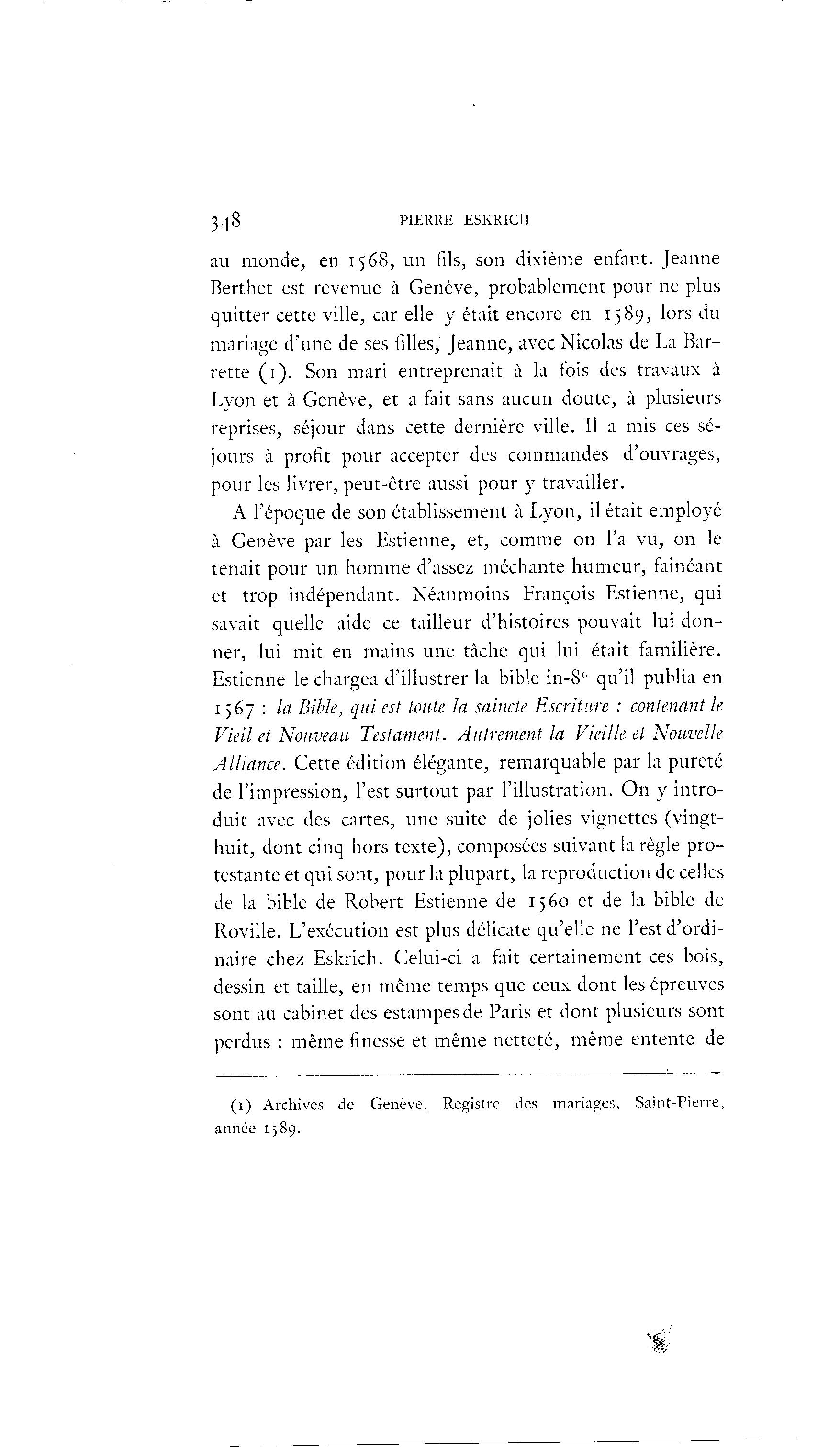 348 PIERRE ESKRICH au monde, en 1568, un fils, son dixième enfant. Jeanne Berthet est revenue à Genève, probablement pour ne plus quitter cette ville, car elle y était encore en 1589, lors du mariage d'une de ses filles, Jeanne, avec Nicolas de La Bar- rette (1). Son mari entreprenait à la fois des travaux à Lyon et à Genève, et a fait sans aucun doute, à plusieurs reprises, séjour dans cette dernière ville. Il a mis ces sé- jours à profit pour accepter des commandes d'ouvrages, pour les livrer, peut-être aussi pour y travailler. A l'époque de son établissement à Lyon, il était employé à Genève par les Estienne, et, comme on l'a vu, on le tenait pour un homme d'assez méchante humeur, fainéant et trop indépendant. Néanmoins François Estienne, qui savait quelle aide ce tailleur d'histoires pouvait lui don- ner, lui mit en mains une tâche qui lui était familière. Estienne le chargea d'illustrer la bible in-8'- qu'il publia en 1567 : la Bible, qui est toute la saincle Escriture : contenant le Vieil et Nouveau Testament. Autrement la Vieille et Nouvelle Alliance. Cette édition élégante, remarquable par la pureté de l'impression, l'est surtout par l'illustration. On y intro- duit avec des cartes, une suite de jolies vignettes (vingt- huit, dont cinq hors texte), composées suivant la règle pro- testante et qui sont, pour la plupart, la reproduction de celles de la bible de Robert Estienne de 1560 et de la bible de Roville. L'exécution est plus délicate qu'elle ne l'est d'ordi- naire chez Eskrich. Celui-ci a fait certainement ces bois, dessin et taille, en même temps que ceux dont les épreuves sont au cabinet des estampes de Paris et dont plusieurs sont perdus : même finesse et même netteté, même entente de (1) Archives de Genève, Registre des mariages, Saint-Pierre, année 1589.
