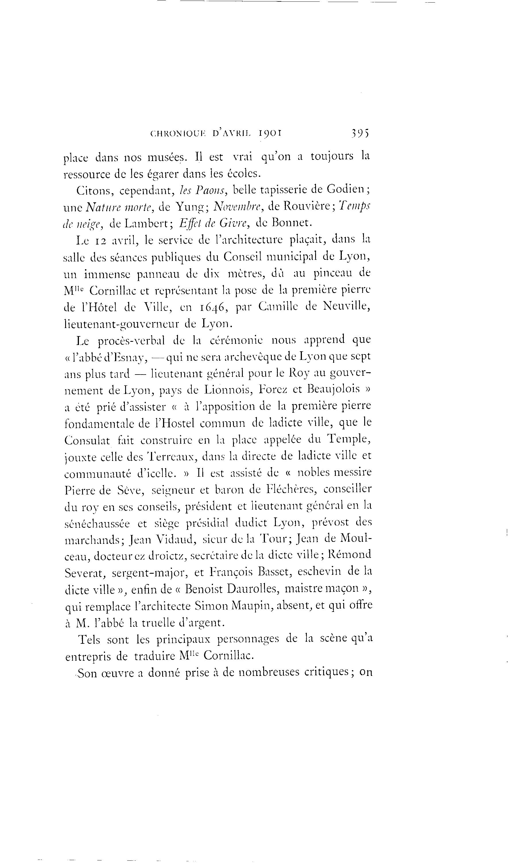 C.HRONIOUK D'AVRIL 19OI 395 place dans nos musées. Il est vrai qu'on a toujours la ressource de les égarer dans les écoles. Citons, cependant, les Paons, belle tapisserie de Godien; une Nature morte, de Yung; Novembre, de Rouvière; Temps de neige, de Lambert; Effet de Givre, de Bonnet. Le 12 avril, le service de l'architecture plaçait, dans la salle des séances publiques du Conseil municipal de Lyon, un immense panneau de dix mètres, dà au pinceau de M"c Cornillac et représentant la pose de la première pierre de l'Hôtel de Ville, en 1646, par Camille de Neuville, lieutenant-gouverneur de Lyon. Le procès-verbal de la cérémonie nous apprend que « l'abbé d'Esnay, — qui ne sera archevêque de Lyon que sept ans plus tard — lieutenant général pour le Roy au gouver- nement de Lyon, pays de Lionnois, Forez et Beaujolois » a été prié d'assister « à l'apposition de la première pierre fondamentale de l'Hostel commun de ladicte ville, que le Consulat fait construire en la place appelée du Temple, jouxte celle des Terreaux, dans la directe de ladicte ville et communauté d'icclle. » Il est assisté de « nobles messire Pierre de Sève, seigneur et baron de Fléchèrcs, conseiller du roy en ses conseils, président et lieutenant général en la sénéchaussée et siège présidial dudict Lyon, prévost des marchands; Jean Vidaud, sieur de la 'Four; Jean de Moul- eeau, docteur ez droietz, secrétaire de la dicte ville; Rémond Severat, sergent-major, et François Basset, eschevin de la dicte ville », enfin de « Benoist Daurolles, maistre maçon », qui remplace l'architecte Simon Maupin, absent, et qui offre à M. l'abbé la truelle d'argent. Tels sont les principaux personnages de la scène qu'a entrepris de traduire M1Ic Cornillac. Son œuvre a donné prise à de nombreuses critiques ; on