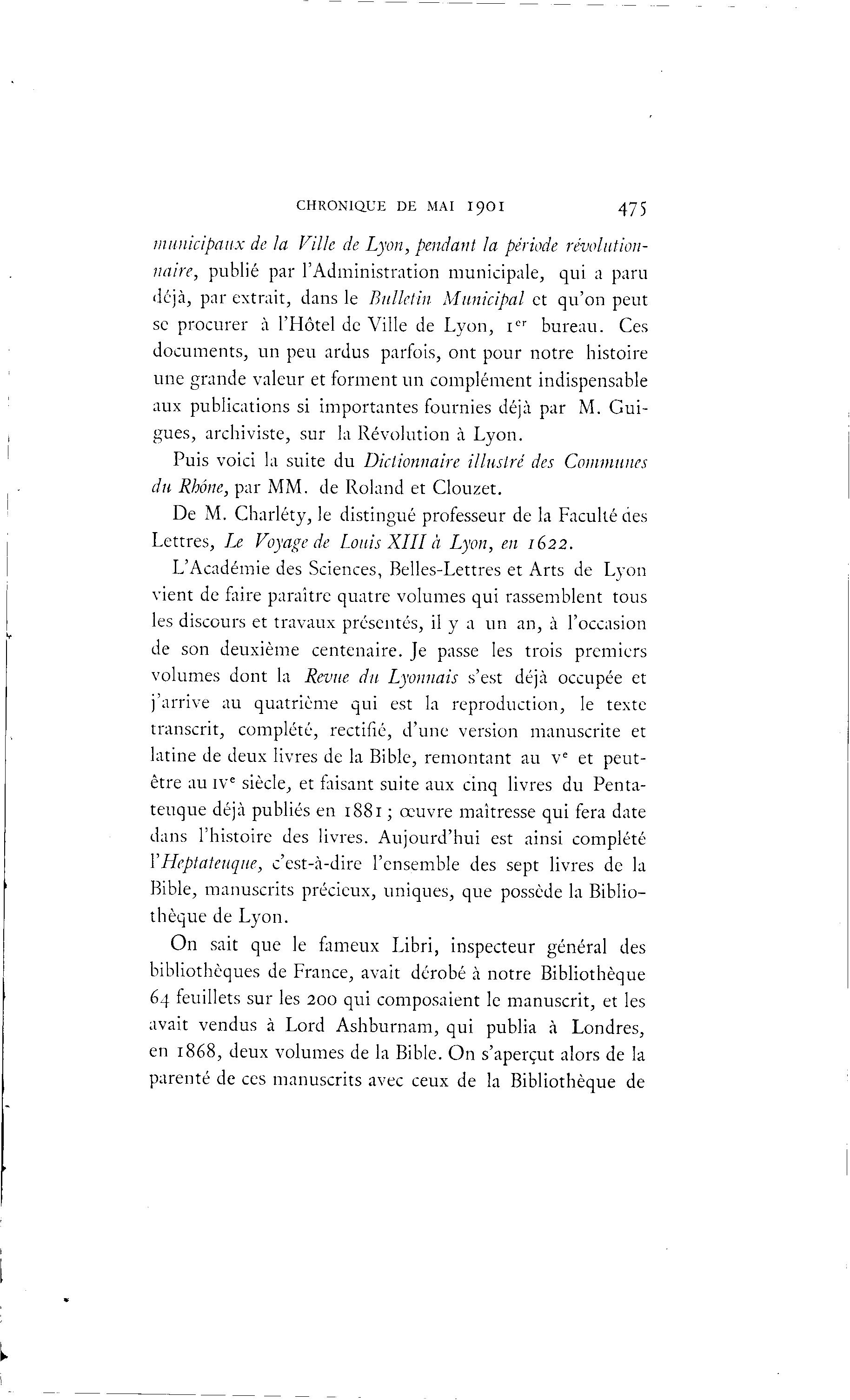 CHRONIQUE DE MAI I 9 O I 475 municipaux de la Ville de Lyon, pendant la période révolution- naire, publié par l'Administration municipale, qui a paru déjà , par extrait, dans le Bulletin Municipal et qu'on peut se procurer à l'Hôtel de Ville de Lyon, i c r bureau. Ces documents, un peu ardus parfois, ont pour notre histoire une grande valeur et forment un complément indispensable aux publications si importantes fournies déjà par M. Gui- gues, archiviste, sur la Révolution à Lyon. Puis voici la suite du Dictionnaire illustré des Communes du Rhône, par MM. de Roland et Clouzet. De M. Charléty, le distingué professeur de la Faculté des Lettres, Z.e Voyage de Louis XIII à Lyon, en 1622. L'Académie des Sciences, Belles-Lettres et Arts de Lyon vient de faire paraître quatre volumes qui rassemblent tous les discours et travaux présentés, il y a un an, à l'occasion de son deuxième centenaire. Je passe les trois premiers volumes dont la Revue du Lyonnais s'est déjà occupée et j'arrive au quatrième qui est la reproduction, le texte transcrit, complété, rectifié, d'une version manuscrite et latine de deux livres de la Bible, remontant au ve et peut- être au iv e siècle, et faisant suite aux cinq livres du Penta- teuque déjà publiés en 1881 ; œuvre maîtresse qui fera date dans l'histoire des livres. Aujourd'hui est ainsi complété YHeptateuque, c'est-à -dire l'ensemble des sept livres de la Bible, manuscrits précieux, uniques, que possède la Biblio- thèque de Lyon. On sait que le fameux Libri, inspecteur général des bibliothèques de France, avait dérobé à notre Bibliothèque 64 feuillets sur les 200 qui composaient le manuscrit, et les avait vendus à Lord Ashburnam, qui publia à Londres, en 1868, deux volumes de la Bible. On s'aperçut alors de la parenté de ces manuscrits avec ceux de la Bibliothèque de