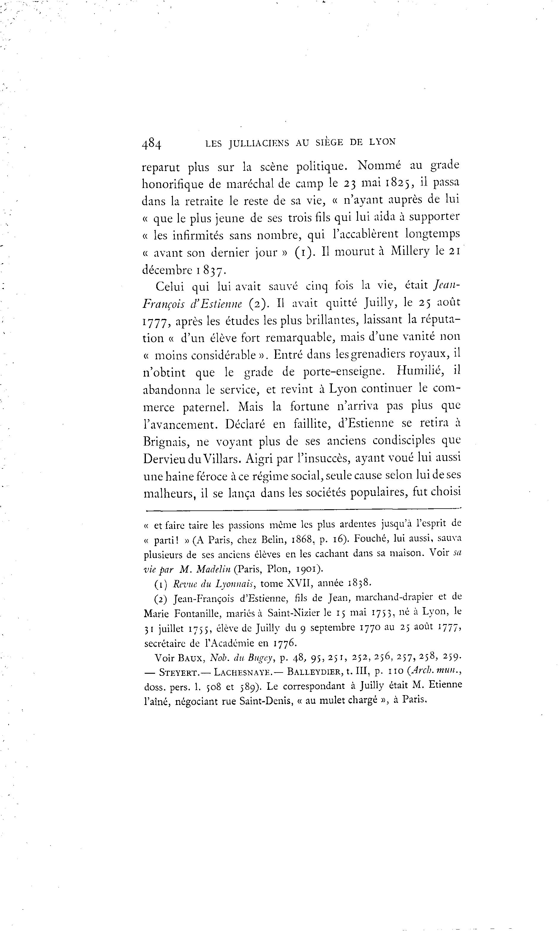 484 LES JULLIACIENS AU SIEGE DE LYON reparut plus sur la scène politique. Nommé au grade honorifique de maréchal de camp le 23 mai 1825, il passa dans la retraite le reste de sa vie, « n'ayant auprès de lui « que le plus jeune de ses trois fils qui lui aida à supporter « les infirmités sans nombre, qui l'accablèrent longtemps « avant son dernier jour » (1). Il mourut à Millery le 21 décembre 1837. Celui qui lui avait sauvé cinq fois la vie, était Jean- François d'Estienne (2). Il avait quitté Juilly, le 25 août 1777, après les études les plus brillantes, laissant la réputa- tion « d'un élève fort remarquable, mais d'une vanité non « moins considérable». Entré dans les grenadiers royaux, il n'obtint que le grade de porte-enseigne. Humilié, il abandonna le service, et revint à Lyon continuer le com- merce paternel. Mais la fortune n'arriva pas plus que l'avancement. Déclaré en faillite, d'Estienne se retira à Brignais, ne voyant plus de ses anciens condisciples que DervieuduVillars. Aigri par l'insuccès, ayant voué lui aussi une haine féroce à ce régime social, seule cause selon lui de ses malheurs, il se lança dans les sociétés populaires, fut choisi « et faire taire les passions même les plus ardentes jusqu'à l'esprit de « parti! » (A Paris, chez Belin, 1868, p. 16). Fouché, lui aussi, sauva plusieurs de ses anciens élèves en les cachant dans sa maison. Voir sa vie par M. Madelin (Paris, Pion, 1901). (1) Revue du Lyonnais, tome XVII, année 1838. (2) Jean-François d'Estienne, fils de Jean, marchand-drapier et de Marie Fontanille, mariés à Saint-Nizier le 15 mai 1753, né à Lyon, le 31 juillet 1755, élève de Juilly du 9 septembre 1770 au 25 août 1777, secrétaire de l'Académie en 1776. Voir BAUX, Nob. du Bugey, p. 48, 95, 251, 252, 256, 257, 258, 259. — STEYERT.— LACHESNAYE.— BALLEYDIER, t. III, p. 110 (Arch. mun., doss. pers. 1. 508 et 589). Le correspondant à Juilly était M. Etienne l'aîné, négociant rue Saint-Denis, « au mulet chargé », à Paris.