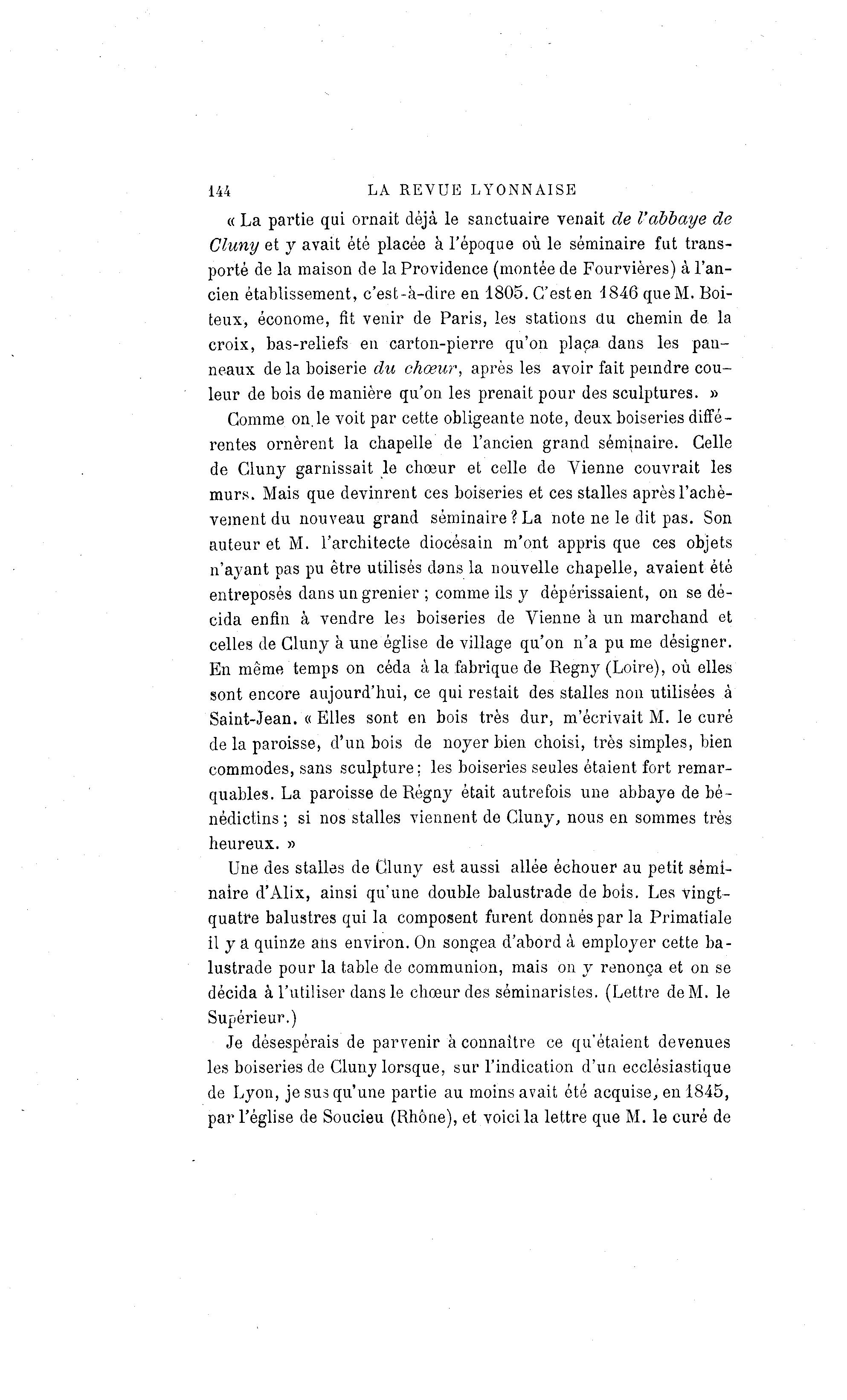144 LA REVUE LYONNAISE « La partie qui ornait déjà le sanctuaire venait de l'abbaye de Cluny et y avait été placée à l'époque où le séminaire fut trans- porté de la maison de la Providence (montée de Fourvières) à l'an- cien établissement, c'est-à -dire en 1805. G'esten 1846 que M. Boi- teux, économe, fit venir de Paris, les stations du chemin de la croix, bas-reliefs en carton-pierre qu'on plaça dans les pan- neaux de la boiserie du chœur, après les avoir fait peindre cou- leur de bois de manière qu'on les prenait pour des sculptures. » Comme on.le voit par cette obligeante note, deux boiseries diffé- rentes ornèrent la chapelle de l'ancien grand séminaire. Celle de Cluny garnissait le chœur et celle de Vienne couvrait les murs. Mais que devinrent ces boiseries et ces stalles après l'achè- vement du nouveau grand séminaire ? La note ne le dit pas. Son auteur et M. l'architecte diocésain m'ont appris que ces objets n'ayant pas pu être utilisés dans la nouvelle chapelle, avaient été entreposés dans un grenier ; comme ils y dépérissaient, on se dé- cida enfin à vendre les boiseries de Vienne à un marchand et celles de Cluny à une église de village qu'on n'a pu me désigner. En même temps on céda à la fabrique de Regny (Loire), où elles sont encore aujourd'hui, ce qui restait des stalles non utilisées à Saint-Jean. « Elles sont en bois très dur, m'écrivait M. le curé de la paroisse, d'un bois de noyer bien choisi, très simples, bien commodes, sans sculpture; les boiseries seules étaient fort remar- quables. La paroisse de Régny était autrefois une abbaye de bé- nédictins ; si nos stalles viennent de Cluny, nous en sommes très heureux. » Une des stalles de Cluny est aussi allée échouer au petit sémi- naire d'Alix, ainsi qu'une double balustrade de bois. Les vingt- quatre balustres qui la composent furent donnés par la Primatiale il y a quinze ans environ. On songea d'abord à employer cette ba- lustrade pour la table de communion, mais on y renonça et on se décida à l'utiliser dans le chœur des séminaristes. (Lettre de M. le Supérieur.) Je désespérais de parvenir à connaître ce qu'étaient devenues les boiseries de Cluny lorsque, sur l'indication d'un ecclésiastique de Lyon, je sus qu'une partie au moins avait été acquise, en 1845, par l'église de Soucieu (Rhône), et voici la lettre que M. le curé de