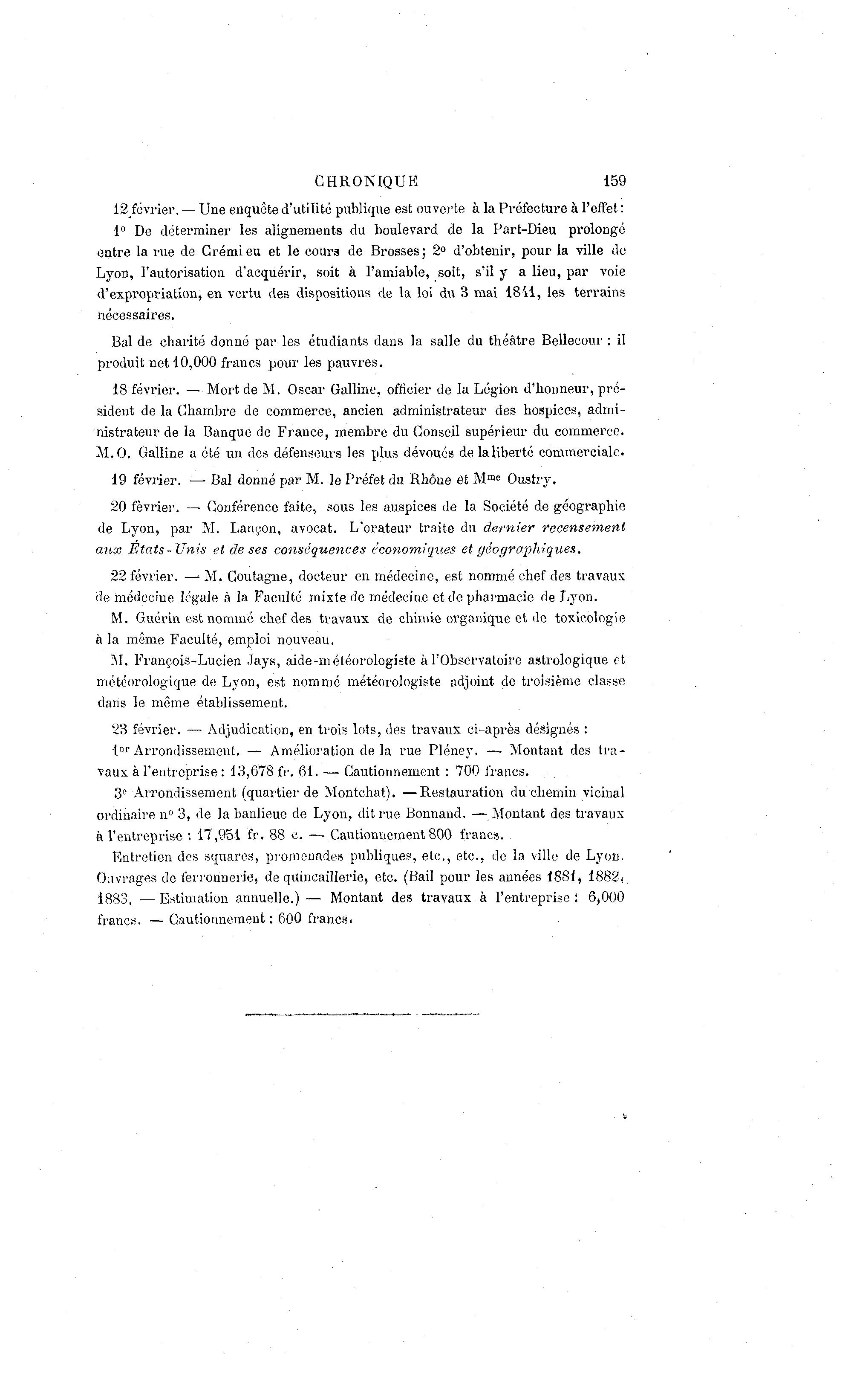 CHRONIQUE 159 12 février. — Une enquête d'utilité publique est ouverte à la Préfecture à l'effet : 1° De déterminer les alignements du boulevard de la Part-Dieu prolongé entre la rue de Grémieu et le cours de Brosses; 2° d'obtenir, pour la ville de Lyon, l'autorisation d'acquérir, soit à l'amiable, soit, s'il y a lieu, par voie d'expropriation, en vertu des dispositions de la loi du 3 mai 1841, les terrains nécessaires. Bal de charité donné par les étudiants dans la salle du théâtre Bellecour : il produit net 10,000 francs pour les pauvres. 18 février. — Mort de M. Oscar Galline, officier de la Légion d'honneur, pré- sident de la Chambre de commerce, ancien administrateur des hospices, admi- nistrateur de la Banque de France, membre du Conseil supérieur du commerce. M.O. Galline a été un des défenseurs les plus dévoués de laliberté commerciale. 19 février. — Bal donné par M. le Préfet du Rhône et Mme Oustry. 20 février. — Conférence faite, sous les auspices de la Société de géographie de Lyon, par M. Lançon, avocat. L'orateur traite du dernier recensement aux Etats-Unis et de ses conséquences économiques et géographiques. 22 février. — M. Coutagne, docteur en médecine, est nommé chef des travaux de médecine légale à la Faculté mixte de médecine et de pharmacie de Lyon. M. Guérin est nommé chef des travaux de chimie organique et de toxicologie à la même Faculté, emploi nouveau. M. François-Lucien Jays, aide-météorologiste à l'Observatoire astrologique et météorologique de Lyon, est nommé météorologiste adjoint de troisième classe dans le même établissement. 23 février. — Adjudication, en trois lots, des travaux ci-après désignés : 1 er Arrondissement. — Amélioration de la rue Pléney. — Montant des tra- vaux à l'entreprise : 13,678 fr. 61. — Cautionnement : 700 francs. 3e Arrondissement (quartier de Montchat). —Restauration du chemin vicinal ordinaire n° 3, de la banlieue de Lyon, dit rue Bonnand. —Montant des travaux à l'entreprise : 17,951 fr. 88 c. — Cautionnement 800 francs. Entretien des squares, promenades publiques, etc., etc., de la ville de Lyon. Ouvrages de ferronnerie, de quincaillerie, etc. (Bail pour les aimées 1881, 1882). 1883. —Estimation annuelle.) — Montant des travaux à l'entreprise! 6,000 francs. — Cautionnement : 600 francs.
