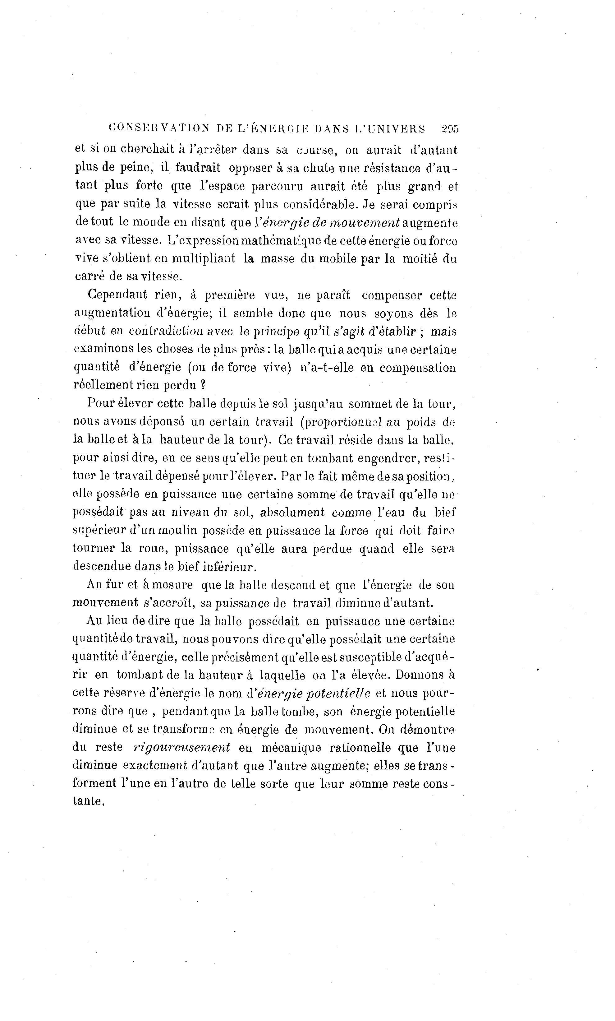 CONSERVATION DE L ' É N E R G I E DANS I / U N I V E R S 295 et si on cherchait à l'arrêter dans sa o u r s e , ou aurait d'autant plus de peine, il faudrait opposer à sa chute une résistance d'au- tant plus forte que l'espace parcouru aurait été plus grand et que par suite la vitesse serait plus considérable. Je serai compris de tout le monde en disant que Y énergie de mouvement augmente avec sa vitesse. L'expression mathématique de cette énergie ou force vive s'obtient en multipliant la masse du mobile par la moitié du carré de sa vitesse. Cependant rien, à première vue, ne paraît compenser cette augmentation d'énergie; il semble donc que nous soyons dès le début en contradiction avec le principe qu'il s'agit d'établir ; mais examinons les choses de plus près : la balle qui a acquis une certaine quantité d'énergie (ou de force vive) n'a-t-elle en compensation réellement rien perdu ? Pour élever cette balle depuis le sol jusqu'au sommet de la tour, nous avons dépensé un certain travail (proportionnel au poids de la balle et à la hauteur de la tour). Ce travail réside dans la balle, pour ainsi dire, en ce sens qu'elle peut en tombant engendrer, resti- tuer le travail dépensé pour l'élever. Parle fait même de sa position, elle possède en puissance une certaine somme de travail qu'elle no possédait pas au niveau du sol, absolument comme l'eau du bief supérieur d'un moulin possède en puissance la force qui doit faire tourner la roue, puissance qu'elle aura perdue quand elle sera descendue dans le bief inférieur. An fur et à mesure que la balle descend et que l'énergie de son mouvement s'accroît, sa puissance de travail diminue d'autant. Au lieu de dire que la balle possédait en puissance une certaine quantité de travail, nous pouvons dire qu'elle possédait une certaine quantité d'énergie, celle précisément qu'elle est susceptible d'acqué- rir en tombant de la hauteur à laquelle on l'a élevée. Donnons à cette réserve d'énergie le nom à 'énergie potentielle et nous pour- rons dire que , pendant que la balle tombe, son énergie potentielle diminue et se transforme en énergie de mouvement. On démontre du reste rigoureusement en mécanique rationnelle que l'une diminue exactement d'autant que l'autre augmente; elles se trans- forment l'une en l'autre de telle sorte que leur somme reste cons- tante,