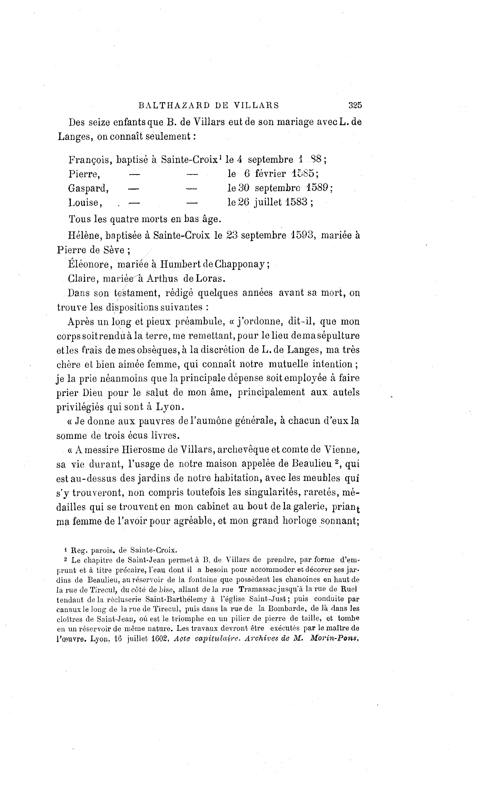 l'oeuvre. Lyon, 16 juillet 1602, Acte capitulaire. Archives de M. Morin-Pons,