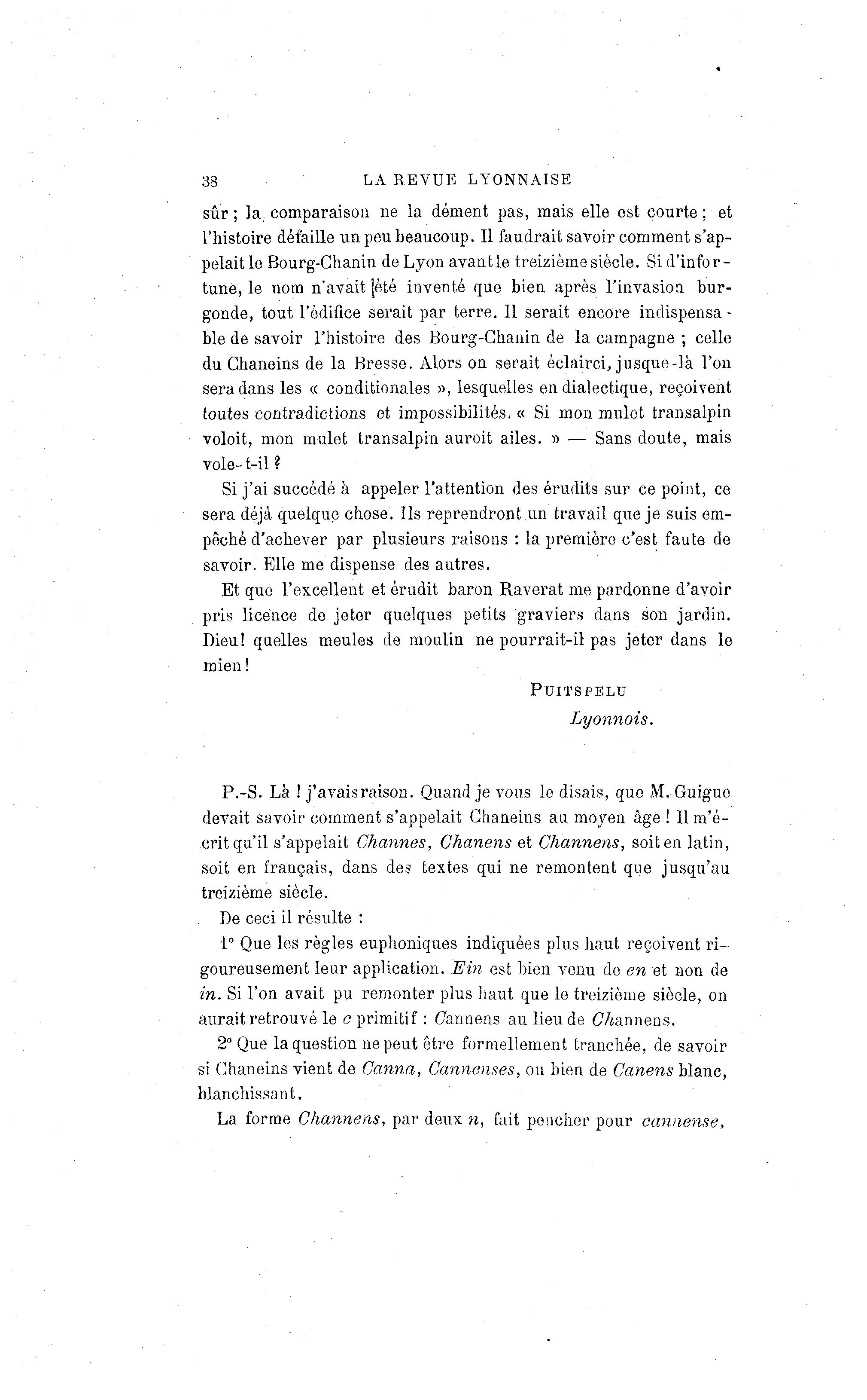 38 LA R E V U E LYONNAISE sûr ; la comparaison ne la dément pas, mais elle est courte ; et l'histoire défaille un peu beaucoup. Il faudrait savoir comment s'ap- pelait le Bourg-Chanin de Lyonavantle treizième siècle. Si d'infor- tune, le nom n'avait {été inventé que bien après l'invasion bur- gonde, tout l'édifice serait par terre. Il serait encore indispensa- ble de savoir l'histoire des Bourg-Chanin de la campagne ; celle du Ghaneins de la Bresse. Alors on serait éclairci, jusque-là l'on sera dans les « conditionales », lesquelles en dialectique, reçoivent toutes contradictions et impossibilités. « Si mon mulet transalpin voloit, mon mulet transalpin auroit ailes. » — Sans doute, mais vole-t-il ? Si j'ai succédé à appeler l'attention des érudits sur ce point, ce sera déjà quelque chose. Ils reprendront .un travail que je suis em- pêché d'achever par plusieurs raisons : la première c'est faute de savoir. Elle me dispense des autres. Et que l'excellent et érudit baron Raverat me pardonne d'avoir pris licence de jeter quelques petits graviers dans son jardin. Dieu! quelles meules de moulin ne pourrait-il pas jeter dans le mien! P U I T S PELU Lyonnais. P.-S. Là ! j'avais raison. Quand je vous le disais, que M. Guigue devait savoir comment s'appelait Ghaneins au moyen âge ! Il m'é- crit qu'il s'appelait Charmes, Chanens et Channens, soit en latin, soit en français, dans des textes qui ne remontent que jusqu'au treizième siècle. De ceci il résulte : 1° Que les règles euphoniques indiquées plus haut reçoivent ri- goureusement leur application. Ein est bien venu de en et non de in. Si l'on avait pu remonter plus haut que le treizième siècle, on aurait retrouvé le o primitif : Cannens au lieu de Channens. 2° Que la question ne peut être formellement tranchée, de savoir si Ghaneins vient de Canna, Cannenses, ou bien de Canens blanc, blanchissant. La forme Channens, par deux n, fait pencher pour cannense,