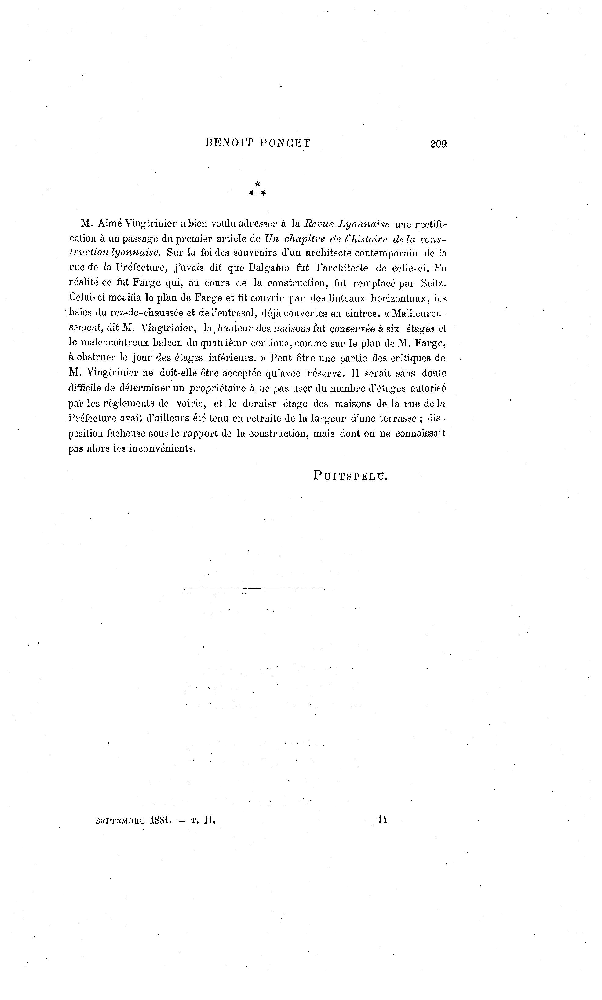 BENOIT PONGET 209 * M. Aimé Vingtrinier a bien voulu adresser à la Revue Lyonnaise une rectifi- cation à un passage du premier article de Un chapitre de Vhistoire de la cons- truction lyonnaise. Sur la foi des souvenirs d'un architecte contemporain de la rue de la Préfecture, j'avais dit que Dalgabio fut l'architecte de celle-ci. En réalité ce fut Farge qui, au cours de la construction, fut remplacé par Scitz. Celui-ci modifia le plan de Farge et fit couvrir par des linteaux horizontaux, les baies du rez-de-chaussée et de l'entresol, déjà couvertes en cintres. « Malheureu- sement, dit M. Vingtrinier, la hauteur des. maisons fut conservée à six étages et le malencontreux balcon du quatrième continua, comme sur le plan de M. Fargo, à obstruer le jour des étages inférieurs. » Peut-être une partie des critiques de M. Vingtrinier ne doit-elle être acceptée qu'avec réserve. 11 serait sans doute difficile de déterminer un propriétaire à ne pas user du nombre d'étages autorisé par les règlements de voirie, et le dernier étage des maisons de la rue de la Préfecture avait d'ailleurs été tenu en retraite de la largeur d'une terrasse ; dis- position fâcheuse sous le rapport de la construction, mais dont on ne connaissait pas alors les inconvénients. PuiTSPELTJ. SErï-EMBiîE 1881. — T. I l , 14