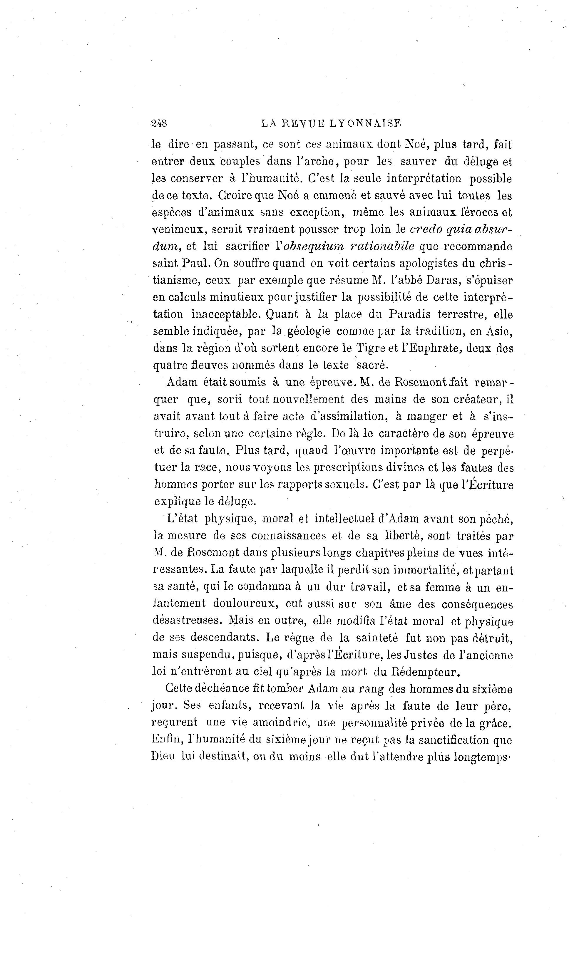 248 LA R E V U E LYONNAISE le dire en passant, ce sont ces animaux dont Noé, plus tard, fait entrer deux couples dans l'arche, pour les sauver du déluge et les conserver à l'humanité. C'est la seule interprétation possible de ce texte. Croire que Noé a emmené et sauvé avec lui toutes les espèces d'animaux sans exception, même les animaux féroces et venimeux, serait vraiment pousser trop loin le credo quia absur- dum, et lui sacrifier Yobsequium rationabile que recommande saint Paul. On souffre quand on voit certains apologistes du chris- tianisme, ceux par exemple que résume M. l'abbé Daras, s'épuiser en calculs minutieux pour justifier la possibilité de cette interpré- tation inacceptable. Quant à la place du Paradis terrestre, elle semble indiquée, par la géologie comme par la tradition, en Asie, dans la région d'où sortent encore le Tigre et l'Euphrate, deux des quatre fleuves nommés dans le texte sacré. Adam était soumis à une épreuve. M. de Rosemontfait remar- quer que, sorti tout nouvellement des mains de son créateur, il avait avant tout à faire acte d'assimilation, à manger et à s'ins- truire, selon une certaine règle. De là le caractère de son épreuve et de sa faute. Plus tard, quand l'œuvre importante est de perpé- tuer la race, nous voyons les prescriptions divines et les fautes des hommes porter sur les rapports sexuels. C'est par là que l'Écriture explique le déluge. L'état physique, moral et intellectuel d'Adam avant son péché, la mesure de ses connaissances et de sa liberté, sont traités par M. de Rosemont dans plusieurs longs chapitres pleins de vues inté- ressantes. La faute par laquelle il perdit son immortalité, et partant sa santé, qui le condamna à un dur travail, et sa femme à un en- fantement douloureux, eut aussi sur son âme des conséquences désastreuses. Mais en outre, elle modifia l'état moral et physique de ses descendants. Le règne de la sainteté fut non pas détruit, mais suspendu, puisque, d'après l'Écriture, les Justes de l'ancienne loi n'entrèrent au ciel qu'après la mort du Rédempteur. Cette déchéance fit tomber Adam au rang des hommes du sixième jour. Ses enfants, recevant la vie après la faute de leur père, reçurent une vie amoindrie, une personnalité privée de la grâce. Enfin, l'humanité du sixième jour ne reçut pas la sanctification que Dieu lui destinait, ou du moins elle dut l'attendre plus longtemps'