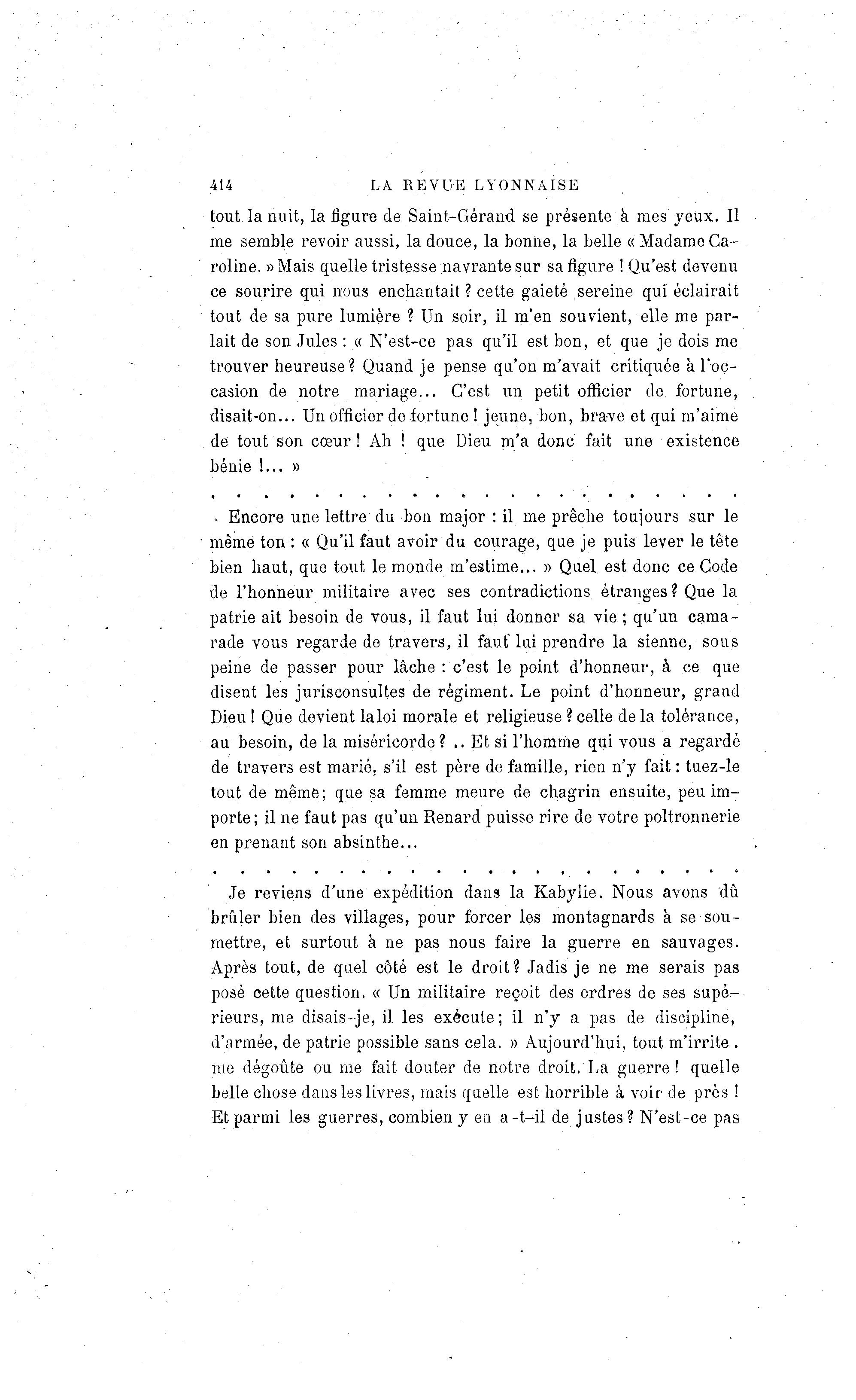 414 LA REVUE LYONNAISE tout la nuit, la figure de Saint-Gérand se présente à mes jeux. Il me semble revoir aussi, la douce, la bonne, la belle « Madame Ca- roline. » Mais quelle tristesse navrante sur sa figure ! Qu'est devenu ce sourire qui nous enchantait ? cette gaieté sereine qui éclairait tout de sa pure lumière ? Un soir, ilm'en souvient, elle me par- lait de son Jules : « N'est-ce pas qu'il est bon, et que je dois me trouver heureuse ? Quand je pense qu'on m'avait critiquée à l'oc- casion de notre mariage... C'est un petit officier de fortune, disait-on... Un officier de fortune ! jeune, bon, brave et qui m'aime de tout son cœur! Ah ! que Dieu m'a donc fait une existence bénie !... » , Encore une lettre du bon major : il me prêche toujours sur le même ton : « Qu'il faut avoir du courage, que je puis lever le tête bien haut, que tout le monde m'estime... » Quel est donc ce Code de l'honneur militaire avec ses contradictions étranges? Que la patrie ait besoin de vous, il faut lui donner sa vie ; qu'un cama- rade vous regarde de travers, il faut'lui prendre la sienne, sous peine de passer pour lâche : c'est le point d'honneur, à ce que disent les jurisconsultes de régiment. Le point d'honneur, grand Dieu ! Que devient laloi morale et religieuse ? celle de la tolérance, au besoin, de la miséricorde? .. Et si l'homme qui vous a regardé de travers est marié, s'il est père de famille, rien n'y fait : tuez-le tout de même; que sa femme meure de chagrin ensuite, peu im- porte; il ne faut pas qu'un Renard puisse rire de votre poltronnerie en prenant son absinthe... Je reviens d'une expédition dans la Kabylie. Nous avons dû brûler bien des villages, pour forcer les montagnards à se sou- mettre, et surtout à ne pas nous faire la guerre en sauvages. Après tout, de quel côté est le droit? Jadis je ne me serais pas posé cette question. « Un militaire reçoit des ordres de ses supé- rieurs, me disais-je, il les exécute; il n'y a pas de discipline, d'armée, de patrie possible sans cela. » Aujourd'hui, tout m'irrite . me dégoûte ou me fait douter de notre droit. La guerre ! quelle belle chose dans les livres, mais quelle est horrible à voir de près ! Et parmi les guerres, combien y en a-t-il de justes ? N'est-ce pas
