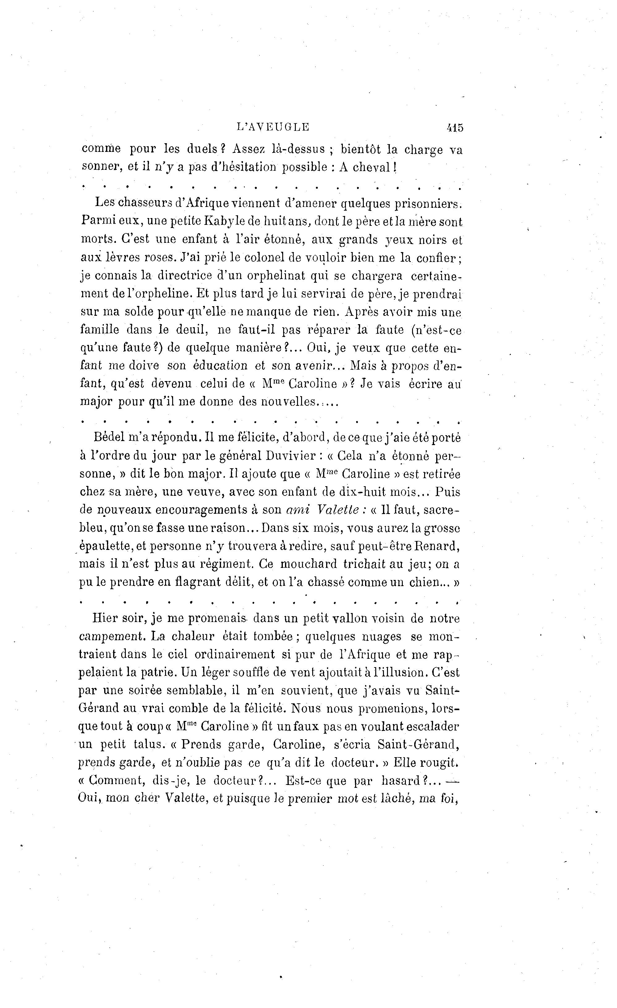 L'AVEUGLE 415 comme pour les duels ? Assez là -dessus ; bientôt la charge va sonner, et il n'y a pas d'hésitation possible : A cheval ! Les chasseurs d'Afrique viennent d'amener quelques prisonniers. Parmi eux, une petite Kabyle de huit ans, dont le père et la mère sont morts. C'est une enfant à l'air étonné, aux grands yeux noirs et aux lèvres roses. J'ai prié le colonel de vouloir bien me la confier; je connais la directrice d'un orphelinat qui se chargera certaine- ment de l'orpheline. Et plus tard je lui servirai de père, je prendrai sur ma solde pour qu'elle ne manque de rien. Après avoir mis une famille dans le deuil, ne faut-il pas réparer la faute (n'est-ce qu'une faute?) de quelque manière?... Oui, je veux que cette en- fant me doive son éducation et son avenir... Mais à propos d'en- fant, qu'est devenu celui de « Mme Caroline »? Je vais écrire au major pour qu'il me donne des nouvelles.:... Bédel m'arépondu. Il me félicite, d'abord, deceque j'aie été porté à l'ordre du jour par le général Duvivier : « Cela n'a étonné per- sonne, » dit le bon major. Il ajoute que « Mme Caroline » est retirée chez sa mère, une veuve, avec son enfant de dix-huit mois... Puis de nouveaux encouragements à son ami Valette : « Il faut, sacre- bleu, qu'on se fasse une raison... Dans six mois, vous aurez la grosse épaulette,et personne n'y trouvera à redire, sauf peut-être Renard, mais il n'est plus au régiment. Ce mouchard trichait au jeu; on a pu le prendre en flagrant délit, et on l'a chassé comme un chien... » Hier soir, je me promenais- dans un petit vallon voisin de notre campement. La chaleur était tombée ; quelques nuages se mon- traient dans le ciel ordinairement si pur de l'Afrique et me rap- pelaient la patrie. Un léger souffle de vent ajoutait à l'illusion. C'est par une soirée semblable, il m'en souvient, que j'avais vu Saint- Gérand au vrai comble de la félicité. Nous nous promenions, lors- que tout à coup « Mnw Caroline » fit un faux pas en voulant escalader un petit talus. « Prends garde, Caroline, s'écria Saint-Gérand, prends garde, et n'oublie pas ce qu'a dit le docteur. » Elle rougit. «Comment, dis-je, le docteur?... Est-ce que par hasard?...— Oui, mon cher Valette, et puisque Je premier mot est lâché, ma foi,