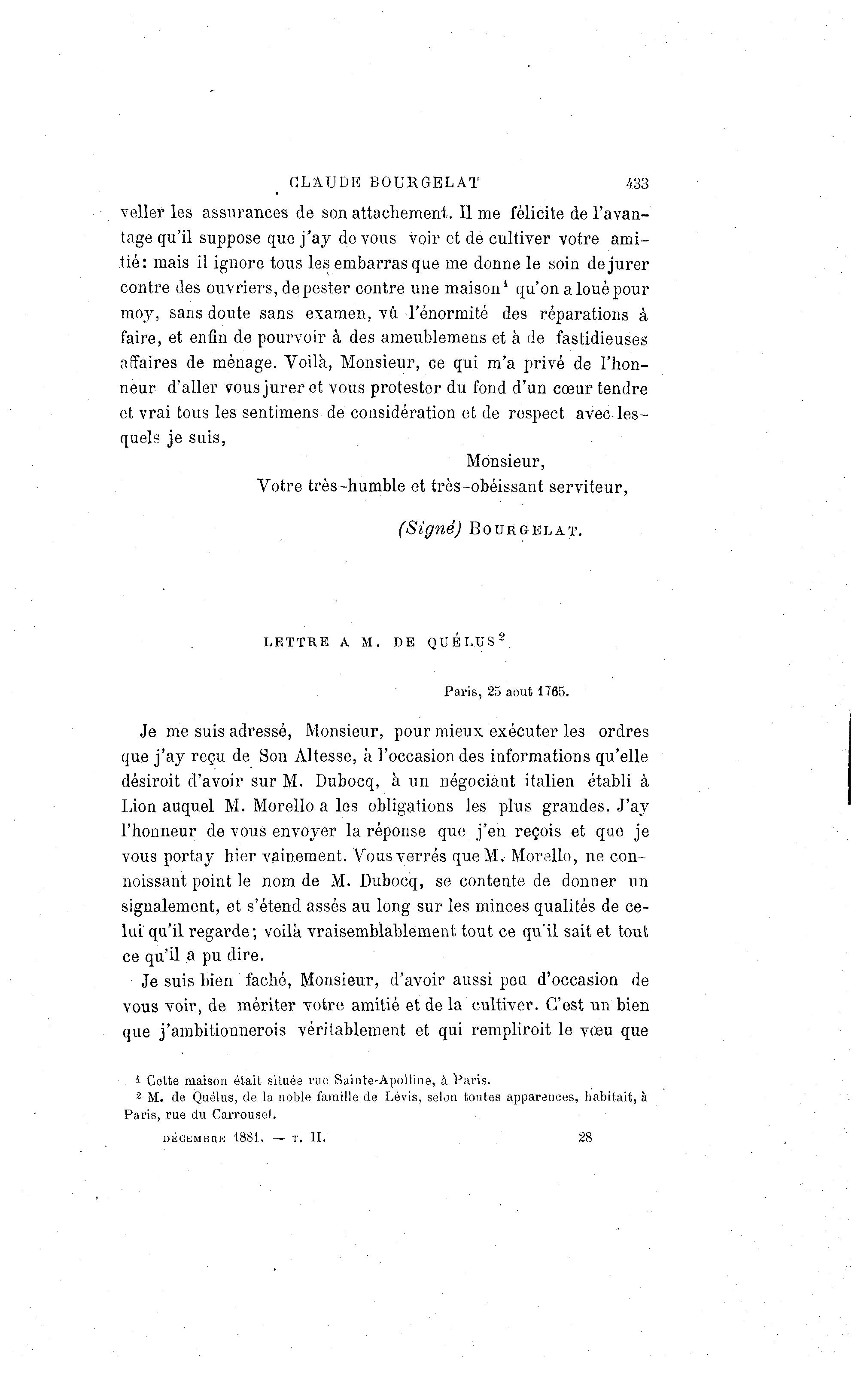 CLAUDE BOURGELAT 433 veller les assurances de son attachement. Il me félicite de l'avan- tage qu'il suppose que j'ay de vous voir et de cultiver votre ami- tié: mais il ignore tous les embarras que me donne le soin de jurer contre des ouvriers, de pester contre une maison1 qu'on a loué pour moy, sans doute sans examen, vu Ténormité des réparations à faire, et enfin de pourvoir à des ameublemens et à de fastidieuses affaires de ménage. Voilà , Monsieur, ce qui m'a privé de l'hon- neur d'aller vous jurer et vous protester du fond d'un coeur tendre et vrai tous les sentimens de considération et de respect avec les- quels je suis, Monsieur, Votre très-humble et très-obéissant serviteur, (Signé) BOURGELAT. L E T T R E A M. DE Q U E L U S 2 Paris, 25 août 1765. Je me suis adressé, Monsieur, pour mieux exécuter les ordres que j'ay reçu de Son Altesse, à l'occasion des informations qu'elle désiroit d'avoir sur M. Dubocq, à un négociant italien établi à Lion auquel M. Morello a les obligations les plus grandes. J'ay l'honneur de vous envoyer la réponse que j'en reçois et que je vous portay hier vainement. Vous verres que M. Morello, ne con- noissant point le nom de M. Dubocq, se contente de donner un signalement, et s'étend assés au long sur les minces qualités de ce- lui qu'il regarde; voilà vraisemblablement tout ce qu'il sait et tout ce qu'il a pu dire. Je suis bien fâché, Monsieur, d'avoir aussi peu d'occasion de vous voir, de mériter votre amitié et de la cultiver. C'est un bien que j'ambitionnerois véritablement et qui remplirait le vœu que i Cette maison était située rue Sainte-Apolline, à Paris. 2 M. de Quélus, de la noble famille de Lévis, selon toutes apparences, habitait), à Paris, rue du Carrousel. DÉCEMBRE 1881. — T. I I . 28
