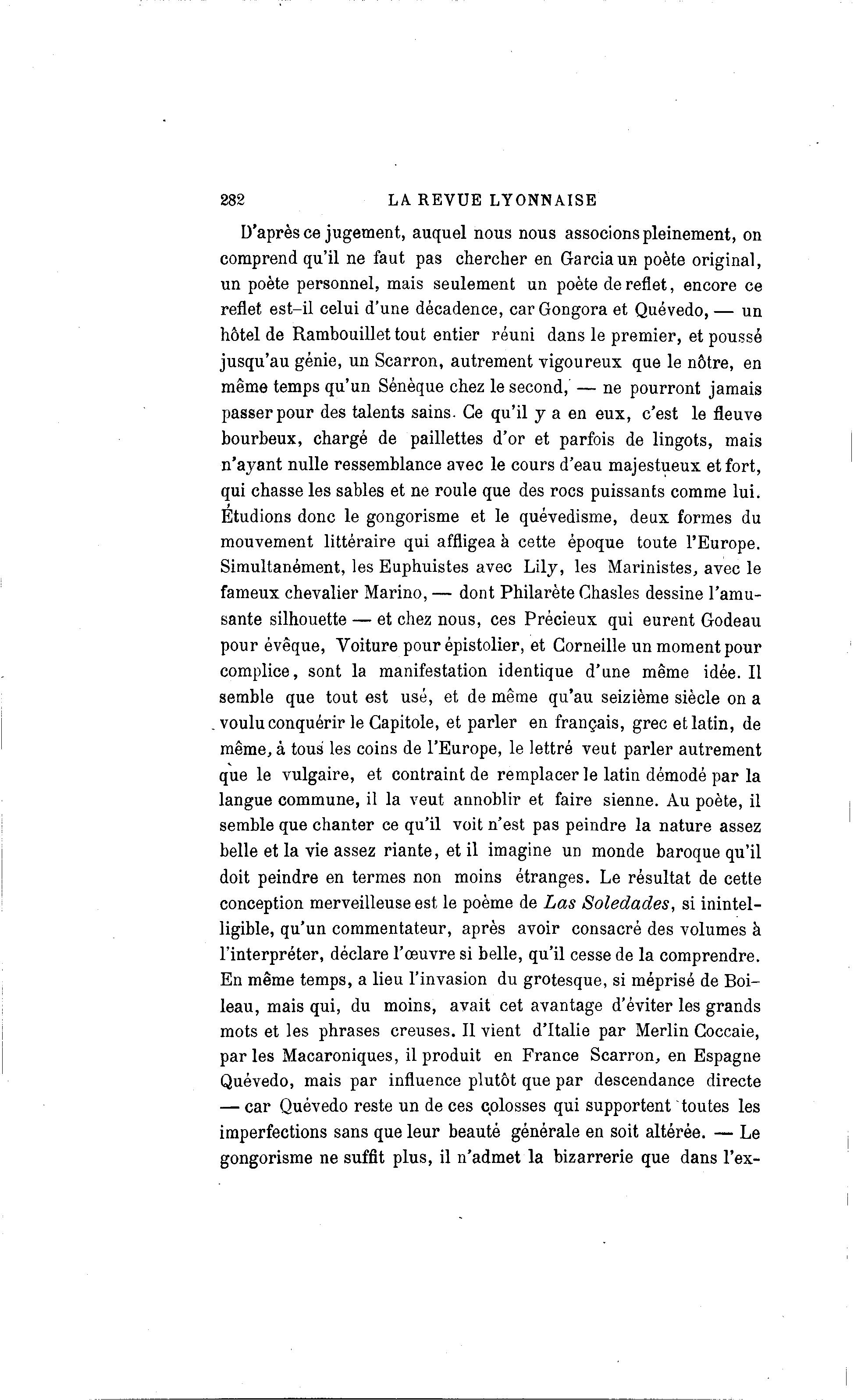 282 LA REVUE LYONNAISE D'après ce jugement, auquel nous nous associons pleinement, on comprend qu'il ne faut pas chercher en Garcia un poète original, un poète personnel, mais seulement un poète de reflet, encore ce reflet est-il celui d'une décadence, car Gongora et Quévedo, — un hôtel de Rambouillet tout entier réuni dans le premier, et poussé jusqu'au génie, un Scarron, autrement vigoureux que le nôtre, en même temps qu'un Sénèque chez le second, — ne pourront jamais passer pour des talents sains. Ce qu'il y a en eux, c'est le fleuve bourbeux, chargé de paillettes d'or et parfois de lingots, mais n'ayant nulle ressemblance avec le cours d'eau majestueux et fort, qui chasse les sables et ne roule que des rocs puissants comme lui. Etudions donc le gongorisme et le quévedisme, deux formes du mouvement littéraire qui affligea à cette époque toute l'Europe. Simultanément, les Euphuistes avec Lily, les Marinistes, avec le fameux chevalier Marino, — dont Philarète Chasles dessine l'amu- sante silhouette — et chez nous, ces Précieux qui eurent Godeau pour évêque, Voiture pour épistolier, et Corneille un moment pour complice, sont la manifestation identique d'une même idée. Il semble que tout est usé, et de même qu'au seizième siècle on a voulu conquérir le Gapitole, et parler en français, grec et latin, de même, à tous les coins de l'Europe, le lettré veut parler autrement que le vulgaire, et contraint de remplacer le latin démodé par la langue commune, il la veut annoblir et faire sienne. Au poète, il semble que chanter ce qu'il voit n'est pas peindre la nature assez belle et la vie assez riante, et il imagine un monde baroque qu'il doit peindre en termes non moins étranges. Le résultat de cette conception merveilleuse est le poème de Las Soledades, si inintel- ligible, qu'un commentateur, après avoir consacré des volumes à l'interpréter, déclare l'œuvre si belle, qu'il cesse de la comprendre. En même temps, a lieu l'invasion du grotesque, si méprisé de Boi- leau, mais qui, du moins, avait cet avantage d'éviter les grands mots et les phrases creuses. Il vient d'Italie par Merlin Goccaie, parles Macaroniques, il produit en France Scarron, en Espagne Quévedo, mais par influence plutôt que par descendance directe — car Quévedo reste un de ces colosses qui supportent toutes les imperfections sans que leur beauté générale en soit altérée. — Le gongorisme ne suffit plus, il n'admet la bizarrerie que dans l'ex-