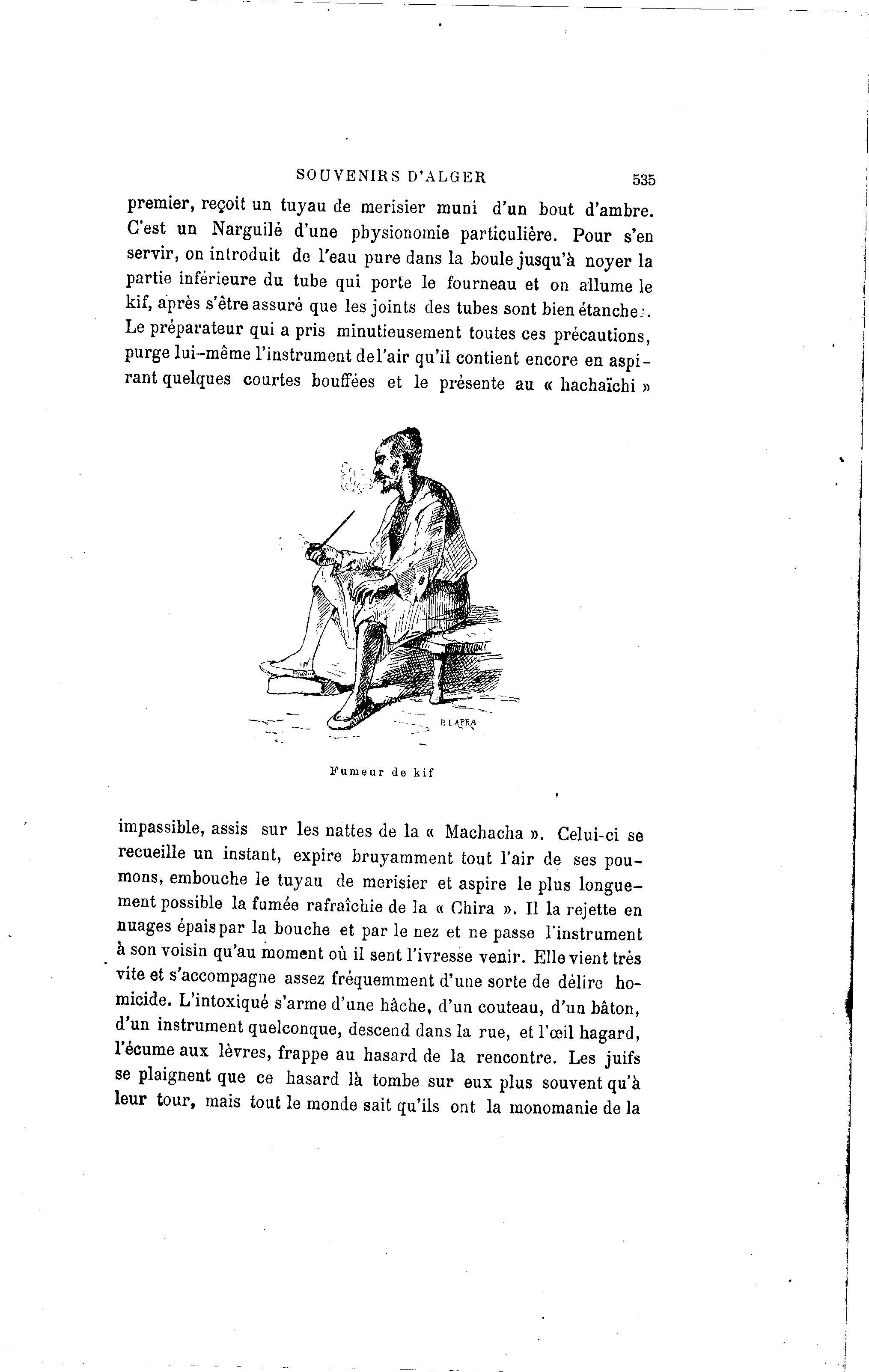 SOUVENIRS D'ALGER 535 premier, reçoit un tuyau de merisier muni d'un bout d'ambre. C'est un Narguile d'une physionomie particulière. Pour s'en servir, on introduit de l'eau pure dans la boule jusqu'à noyer la partie inférieure du tube qui porte le fourneau et on allume le kif, après s'être assuré que les joints des tubes sont bienétanche.;. Le préparateur qui a pris minutieusement toutes ces précautions, purge lui-même l'instrument de l'air qu'il contient encore en aspi- rant quelques courtes bouffées et le présente au « hachaïchi » impassible, assis sur les nattes de la a Machacha ». Celui-ci se recueille un instant, expire bruyamment tout l'air de ses pou- mons, embouche le tuyau de merisier et aspire le plus longue- ment possible la fumée rafraîchie de la « Chira ». Il la rejette en nuages épais par la bouche et par le nez et ne passe l'instrument à son voisin qu'au moment où il sent l'ivresse venir. Elle vient très vite et s'accompagne assez fréquemment d'une sorte de délire ho- micide. L'intoxiqué s'arme d'une hache, d'un couteau, d'un bâton, d'un instrument quelconque, descend dans la rue, et l'œil hagard, l'écume aux lèvres, frappe au hasard de la rencontre. Les juifs se plaignent que ce hasard là tombe sur eux plus souvent qu'à leur tour, mais tout le monde sait qu'ils ont la monomanie de la