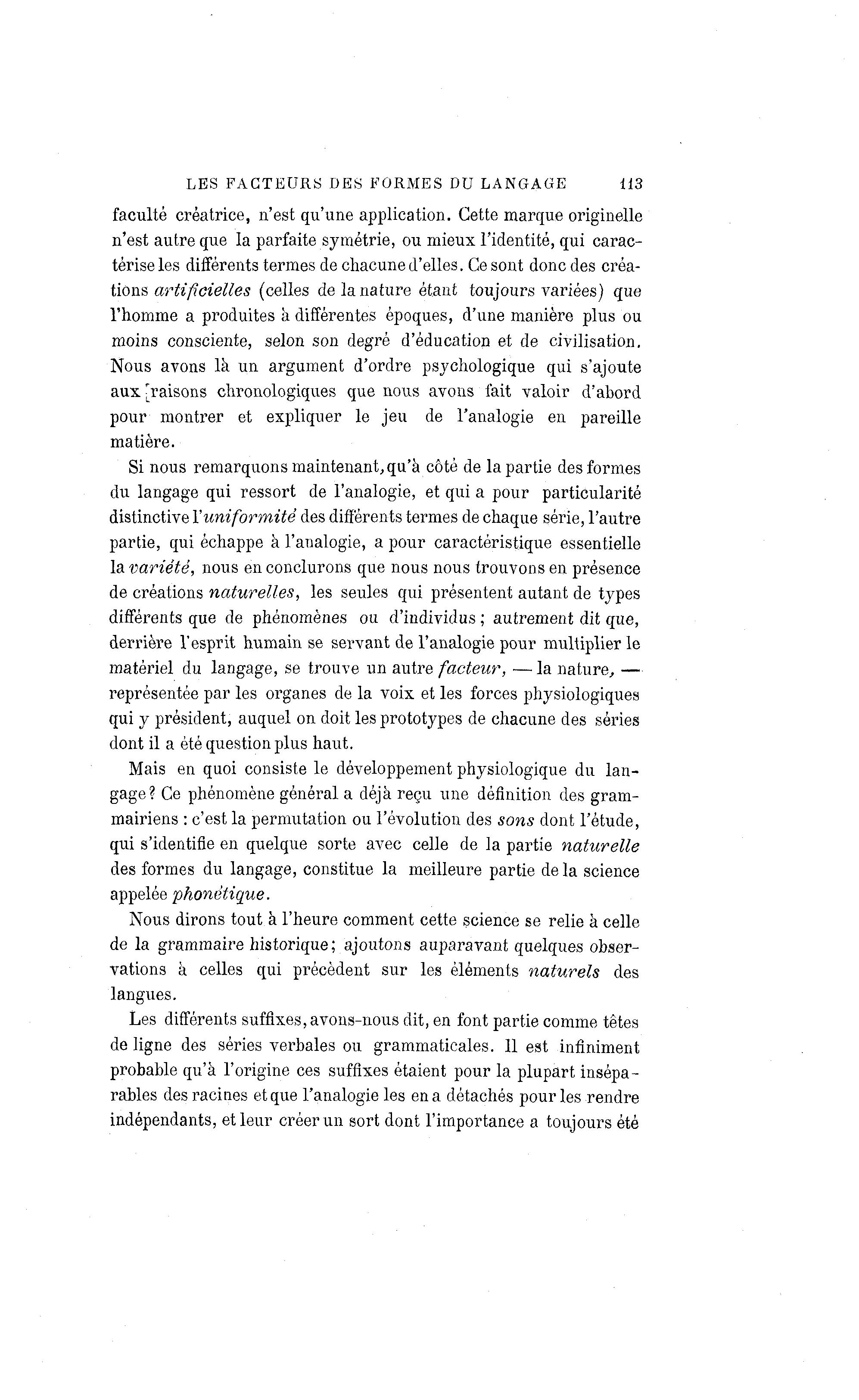 LES FACTEURS DES FORMES DU LANGAGE 113 faculté créatrice, n'est qu'une application. Cette marque originelle n'est autre que la parfaite symétrie, ou mieux l'identité, qui carac- térise les différents termes de chacune d'elles. Ce sont donc des créa- tions artificielles (celles de la nature étant toujours variées) que l'homme a produites à différentes époques, d'une manière plus ou moins consciente, selon son degré d'éducation et de civilisation. Nous avons là un argument d'ordre psychologique qui s'ajoute aux [raisons chronologiques que nous avons fait valoir d'abord pour montrer et expliquer le jeu de l'analogie en pareille matière. Si nous remarquons maintenant, qu'à côté de la partie des formes du langage qui ressort de l'analogie, et qui a pour particularité distinctive Y uniformité des différents termes de chaque série, l'autre partie, qui échappe à l'analogie, a pour caractéristique essentielle la variété, nous en conclurons que nous nous trouvons en présence de créations naturelles, les seules qui présentent autant de types différents que de phénomènes ou d'individus ; autrement dit que, derrière l'esprit humain se servant de l'analogie pour multiplier le matériel du langage, se trouve un autre facteur, —la nature, — représentée par les organes de la voix et les forces physiologiques qui y président, auquel on doit les prototypes de chacune des séries dont il a été question plus haut. Mais en quoi consiste le développement physiologique du lan- gage? Ce phénomène général a déjà reçu une définition des gram- mairiens : c'est la permutation ou l'évolution des sons dont l'étude, qui s'identifie en quelque sorte avec celle de la partie naturelle des formes du langage, constitue la meilleure partie delà science appelée phonétique. Nous dirons tout à l'heure comment cette science se relie à celle de la grammaire historique; ajoutons auparavant quelques obser- vations à celles qui précèdent sur les éléments naturels des langues. Les différents suffixes, avons-nous dit, en font partie comme têtes de ligne des séries verbales ou grammaticales. Il est infiniment probable qu'à l'origine ces suffixes étaient pour la plupart insépa- rables des racines et que l'analogie les en a détachés pour les rendre indépendants, et leur créer un sort dont l'importance a toujours été