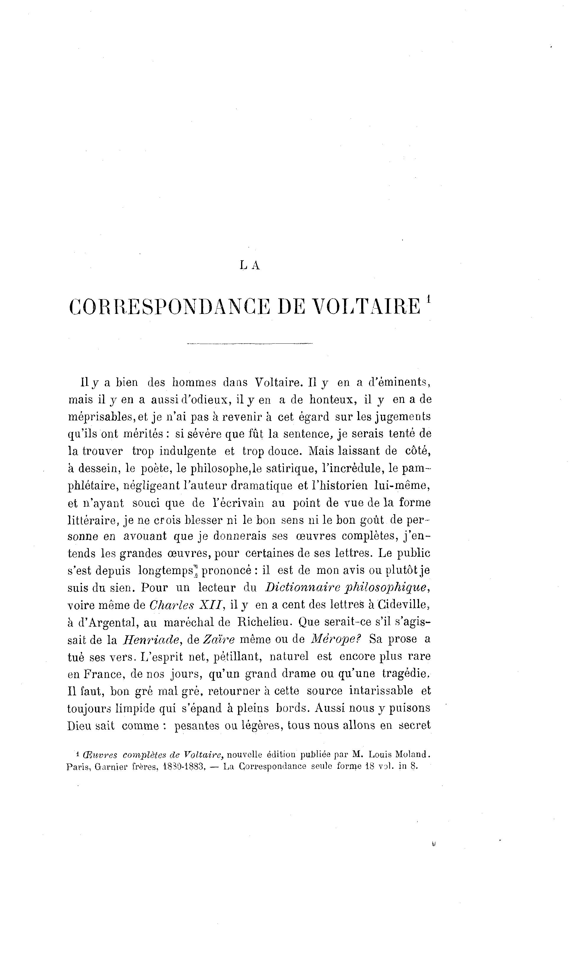 LA CORRESPONDANCE DE VOLTAIRE l 11 y a bien des hommes dans Voltaire. Il y en a d'éminents, mais il y en a aussi d'odieux, il y en a de honteux, il y en a de méprisables,et je n'ai pas à revenir à cet égard sur les jugements qu'ils ont mérités : si sévère que fût la sentence, je serais tenté de la trouver trop indulgente et trop douce. Mais laissant de côté, a dessein, le poète, le philosophe,le satirique, l'incrédule, le pam- phlétaire, négligeant l'auteur dramatique et l'historien lui-même, et n'ayant souci que de l'écrivain au point de vue de la forme littéraire, je ne crois blesser ni le bon sens ni le bon goût de per- sonne en avouant que je donnerais ses œuvres complètes, j'en- tends les grandes œuvres, pour certaines de ses lettres. Le public s'est depuis longtemps^ prononcé : il est de mon avis ou plutôt je suis du sien. Pour un lecteur du Dictionnaire philosophique, voire même de Charles XII, il y en a cent des lettres à Cideville, à d'Argental, au maréchal de Richelieu. Que serait-ce s'il s'agis- sait de la Henriade, de Zaïre même ou de Mèrope? Sa prose a tué ses vers. L'esprit net, pétillant, naturel est encore plus rare en France, de nos jours, qu'un grand drame ou qu'une tragédie, Il faut, bon gré mal gré, retourner à cette source intarissable et toujours limpide qui s'épand à pleins bords. Aussi nous y puisons Dieu sait comme : pesantes ou légères, tous nous allons en secret i Œuvres complètes de Voltaire, nouvelle édition publiée par M. Louis Moland. Paris, Garnier frères, 1830-1883, — La Correspondance seule forme 18 vol. in 8.