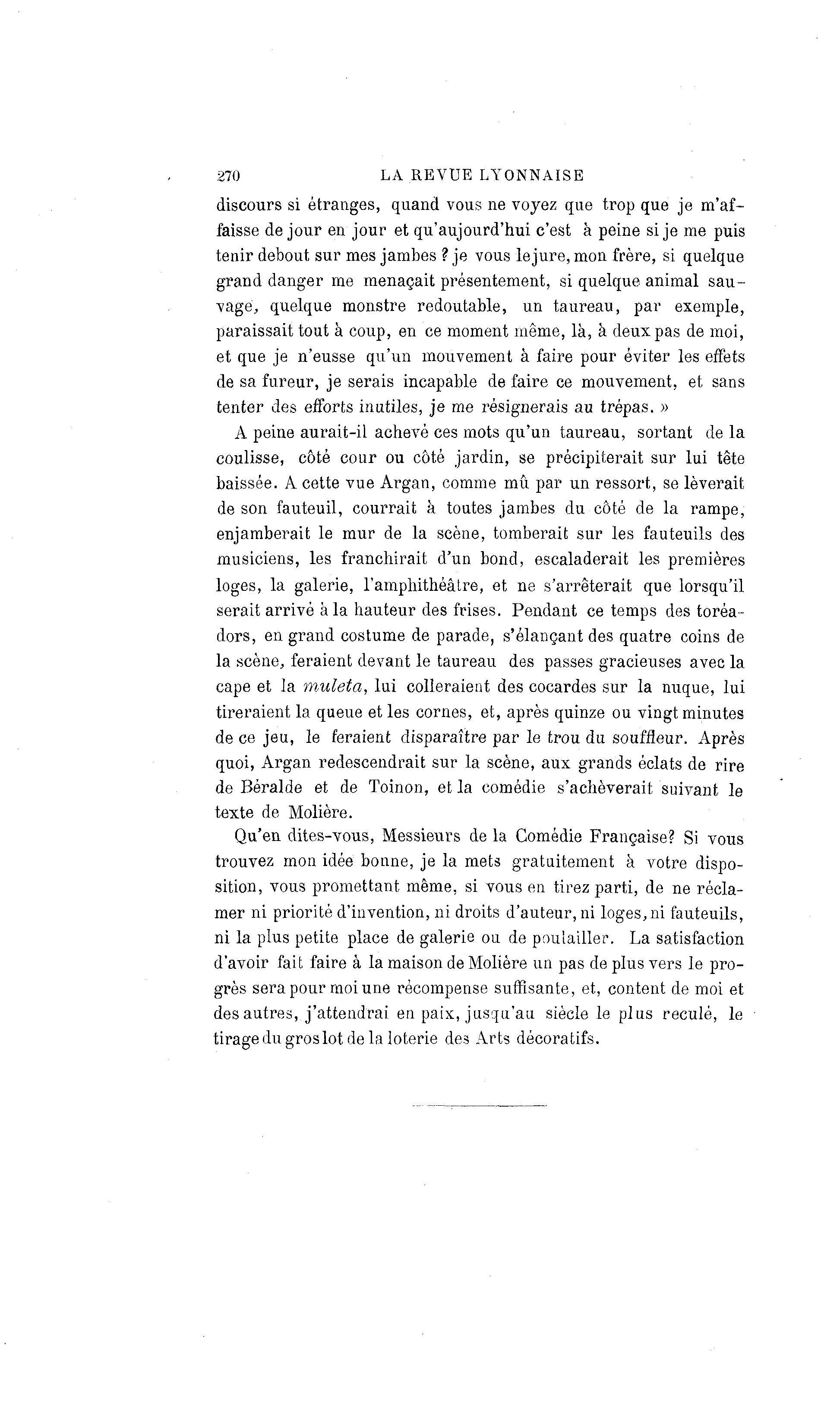 270 LA REVUE LYONNAISE discours si étranges, quand vous ne voyez que trop que je m'af- faisse de jour en jour et qu'aujourd'hui c'est à peine si je me puis tenir debout sur mes jambes ? je vous lejure,mon frère, si. quelque grand danger me menaçait présentement, si quelque animal sau- vage, quelque monstre redoutable, un taureau, par exemple, paraissait tout à coup, en ce moment même, là , à deux pas de moi, et que je n'eusse qu'un mouvement à faire pour éviter les effets de sa fureur, je serais incapable de faire ce mouvement, et sans tenter des efforts inutiles, je me résignerais au trépas. » A peine aurait-il achevé ces mots qu'un taureau, sortant de la coulisse, côté cour ou côté jardin, se précipiterait sur lui tête baissée. A cette vue Argan, comme mû par un ressort, se lèverait de son fauteuil, courrait à toutes jambes du côté de la rampe, enjamberait le mur de la scène, tomberait sur les fauteuils des musiciens, les franchirait d'un bond, escaladerait les premières loges, la galerie, l'amphithéâtre, et ne s'arrêterait que lorsqu'il serait arrivé à la hauteur des frises. Pendant ce temps des toréa- dors, en grand costume de parade, s'élançant des quatre coins de la scène, feraient devant le taureau des passes gracieuses avec la cape et la muleta, lui colleraient des cocardes sur la nuque, lui tireraient la queue et les cornes, et, après quinze ou vingt minutes de ce jeu, le feraient disparaître par le trou du souffleur. Après quoi, Argan redescendrait sur la scène, aux grands éclats de rire de Béralde et de Toinon, et la comédie s'achèverait suivant le texte de Molière. Qu'en dites-vous, Messieurs de la Comédie Française? Si vous trouvez mon idée bonne, je la mets gratuitement à votre dispo- sition, vous promettant même, si vous en tirez parti, de ne récla- mer ni priorité d'invention, ni droits d'auteur, ni loges,ni fauteuils, ni la plus petite place de galerie ou de poulailler. La satisfaction d'avoir fait faire à la maison de Molière un pas de plus vers le pro- grès sera pour moi une récompense suffisante, et, content de moi et des autres, j'attendrai en paix, jusqu'au siècle le plus reculé, le tirage du gros lot de la loterie des Arts décoratifs.