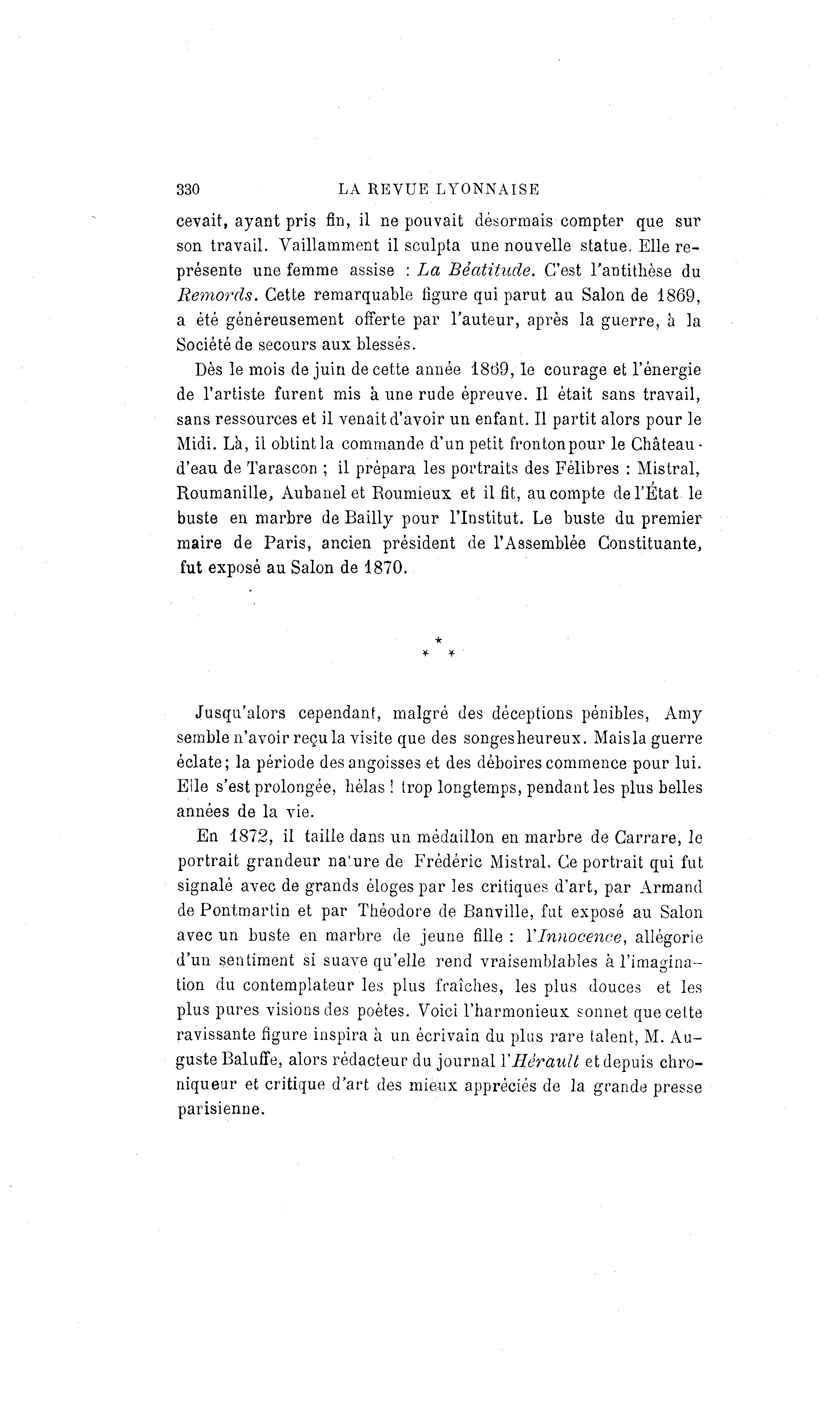 330 LA REVUE LYONNAISE cevait, ayant pris fin, il ne pouvait désormais compter que sur son travail. Vaillamment il sculpta une nouvelle statue. Elle re- présente une femme assise : La Béatitude. C'est l'antithèse du Remords. Cette remarquable figure qui parut au Salon de 1869, a été généreusement offerte par l'auteur, après la guerre, à la Société de secours aux blessés. Dès le mois de juin de cette année 18d9, le courage et l'énergie de l'artiste furent mis à une rude épreuve. Il était sans travail, sans ressources et il venait d'avoir un enfant. Il partit alors pour le Midi. Là , il obtint la commande d'un petit frontonpour le Château - d'eau de Tarascon ; il prépara les portraits des Félibres : Mistral, Roumanille, Aubanelet Roumieux et il fit, au compte de l'Etat le buste en marbre de Bailly pour l'Institut. Le buste du premier maire de Paris, ancien président de l'Assemblée Constituante, fut exposé au Salon de 1870. Jusqu'alors cependant, malgré des déceptions pénibles, Amy semblen'avoir recula visite que des songesheureux. Maisla guerre éclate; la période des angoisses et des déboires commence pour lui. Elle s'est prolongée, hélas! trop longtemps, pendant les plus belles années de la vie. En 1872, il taille dans un médaillon en marbre de Carrare, le portrait grandeur na'ure de Frédéric Mistral. Ce portrait qui fut signalé avec de grands éloges par les critiques d'art, par Armand de Pontmartin et par Théodore de Banville, fut exposé au Salon avec un buste en marbre de jeune fille : l'Innocence, allégorie d'un sentiment si suave qu'elle rend vraisemblables à l'imagina- tion du contemplateur les plus fraîches, les plus douces et les plus pures visions des poètes. Voici l'harmonieux sonnet que cette ravissante figure inspira à un écrivain du plus rare talent, M. Au- guste Baluffe, alors rédacteur du journal l'Hérault et depuis chro- niqueur et critique d'art des mieux appréciés de la grande presse parisienne.