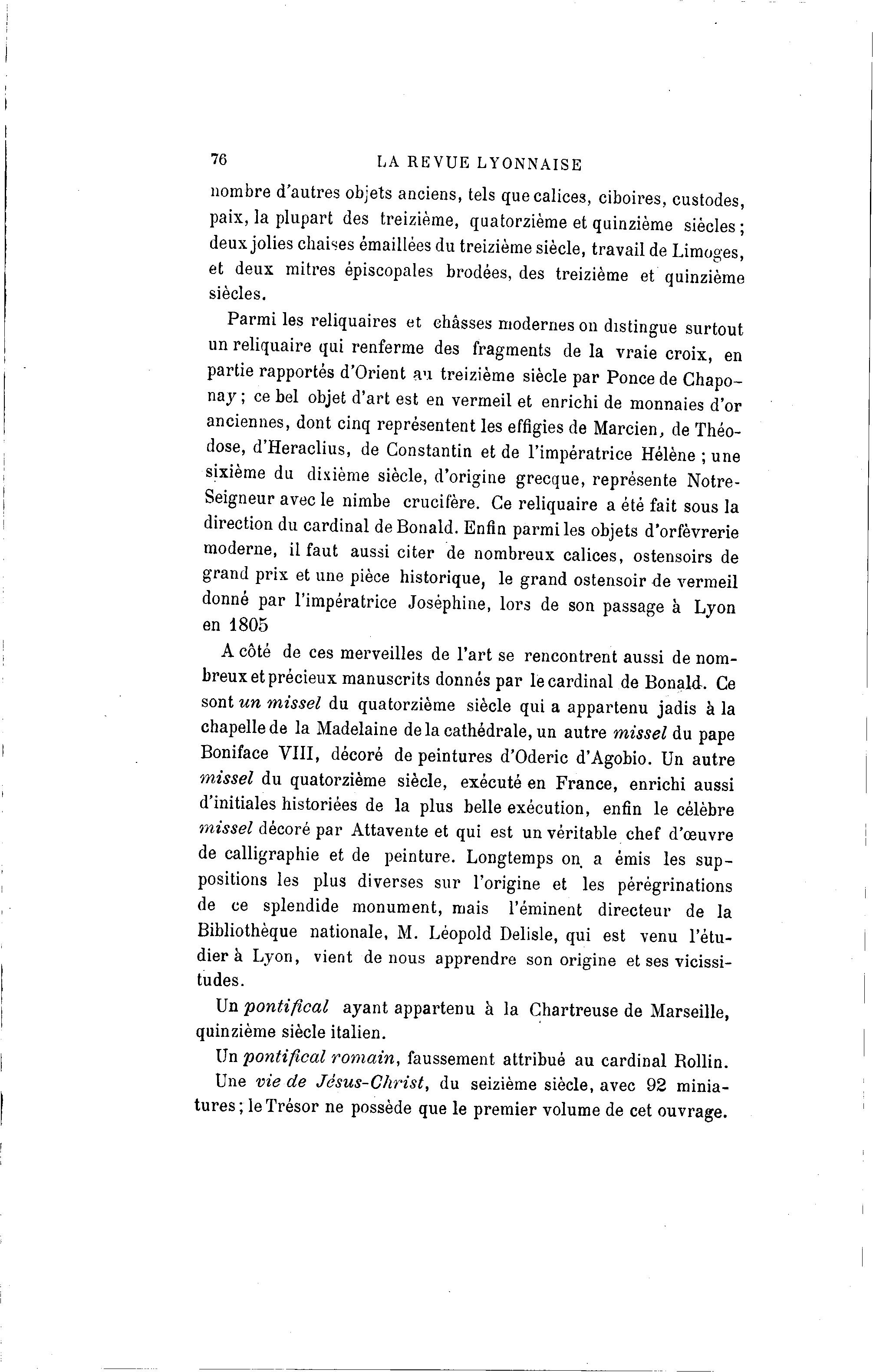 76 LA REVUE LYONNAISE nombre d'autres objets anciens, tels que calices, ciboires, custodes, paix, la plupart des treizième, quatorzième et quinzième siècles ; deux jolies chaises émaillées du treizième siècle, travail de Limoges, et deux mitres episcopales brodées, des treizième et quinzième siècles. Parmi les reliquaires et châsses modernes on distingue surtout un reliquaire qui renferme des fragments de la vraie croix, en partie rapportés d'Orient au treizième siècle par Ponce de Chapo- nay ; ce bel objet d'art est en vermeil et enrichi de monnaies d'or anciennes, dont cinq représentent les effigies de Marcien, de Théo- dose, d'Heraclius, de Constantin et de l'impératrice Hélène ; une sixième du dixième siècle, d'origine grecque, représente Notre- Seigneur avec le nimbe crucifère. Ce reliquaire a été fait sous la direction du cardinal deBonald. Enfin parmi les objets d'orfèvrerie moderne, il faut aussi citer de nombreux calices, ostensoirs de grand prix et une pièce historique, le grand ostensoir de vermeil donné par l'impératrice Joséphine, lors de son passage à Lyon en 1805 A côté de ces merveilles de l'art se rencontrent aussi de nom- breux et précieux manuscrits donnés par le cardinal de Bonald. Ce sont un missel du quatorzième siècle qui a appartenu jadis à la chapelle de la Madelaine de la cathédrale, un autre missel du pape Boniface VIII, décoré de peintures d'Oderic d'Agobio. Un autre missel du quatorzième siècle, exécuté en France, enrichi aussi d'initiales historiées de la plus belle exécution, enfin le célèbre missel décoré par Attavente et qui est un véritable chef d'oeuvre de calligraphie et de peinture. Longtemps on a émis les sup- positions les plus diverses sur l'origine et les pérégrinations de ce splendide monument, mais l'éminent directeur de la Bibliothèque nationale, M. Léopold Delisle, qui est venu l'étu- dier à Lyon, vient de nous apprendre son origine et ses vicissi- tudes. Un pontifical ayant appartenu à la Chartreuse de Marseille, quinzième siècle italien. Un pontifical romain, faussement attribué au cardinal Bollin. Une vie de Jésus-Christ, du seizième siècle, avec 92 minia- tures ; le Trésor ne possède que le premier volume de cet ouvrage.
