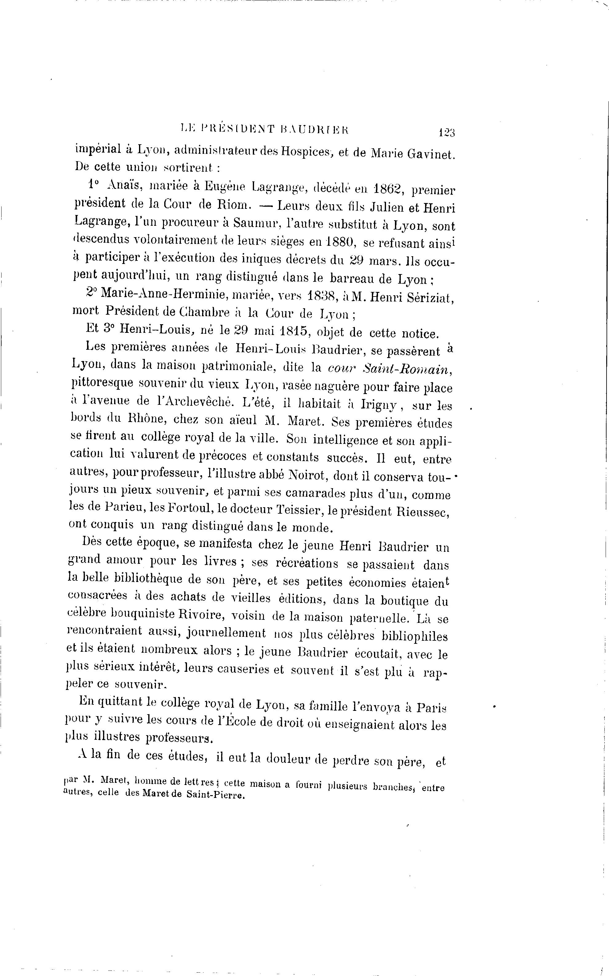 LK l ' K E S I D K X T B A U D K r U K 123 impérial à Lyon, administrateur des Hospices, et de Marie Gavinet. De cette union sortirent : 1° Anaïs, mariée à Eugène Lagrange, décédé en 1862, premier président de la Cour de Riom. — Leurs deux fils Julien et Henri Lagrange, l'un procureur à Saumur, l'autre substitut à Lyon, sont descendus volontairement de leurs sièges en 1880, se refusant ainsi h participer à l'exécution des iniques décrets du 29 mars. Us occu- pent aujourd'hui, un rang distingué dans le barreau de Lyon ; 2° Marie-Anne-Herminie, mariée, vers 1838, ;'iM. Henri Sériziat, mort Président de Chambre à la Cour de Lyon ; Et 3° Henri-Louis, né le 29 mai 1815, objet de cette notice. Les premières années de Henri-Louis Baudrier, se passèrent a Lyon, dans la maison patrimoniale, dite la cour Saint-Romain, pittoresque souvenir du vieux Lyon, rasée naguère pour faire place il l'avenue de l'Archevêché. L'été, il habitait à Irigny, sur les bords du Rhône, chez son aïeul M. Maret. Ses premières études se tirent au collège royal de la ville. Son intelligence et son appli- cation lui valurent de précoces et constants succès. Il eut, entre autres, pour professeur, l'illustre abbé Noirot, dont il conserva tou- • jours un pieux souvenir, et parmi ses camarades plus d'un, comme les de Parieu, les Fortoul, le docteur Teissier, le président Rieussec, ont conquis un rang distingué dans le monde. Dès cette époque, se manifesta chez le jeune Henri Baudrier un grand amour pour les livres ; ses récréations se passaient dans la belle bibliothèque de sou père, et ses petites économies étaient consacrées h des achats de vieilles éditions, dans la boutique du célèbre bouquiniste Rivoire, voisin de la maison paternelle. Là se rencontraient aussi, journellement nos plus célèbres bibliophiles et ils étaient nombreux alors ; le jeune Baudrier écoutait, avec le plus sérieux intérêt, leurs causeries et souvent il s'est plu à rap- peler ce souvenir. En quittant le collège royal de Lyon, sa famille l'envoya à Paris pour y suivre les cours de l'Ecole de droit où enseignaient alors les plus illustres professeurs. A la fin de ces études, il eut la douleur de perdre son père, et par M. Maret, homme de lettres j cette maison a fourni plusieurs branches) "entre autres, celle des Maret de Saint-Pierre.