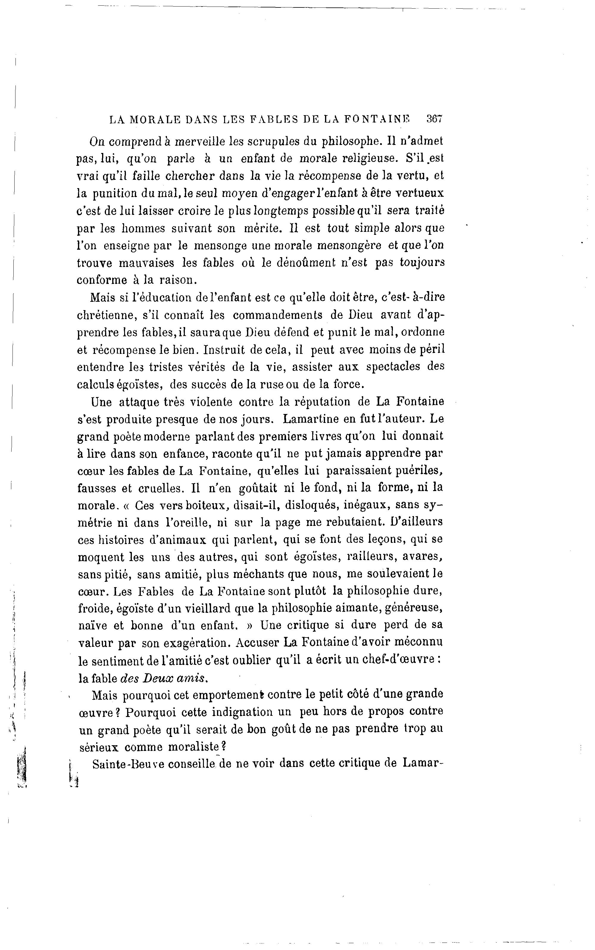 LA MORALE DANS LES FABLES DE LA F O N T A I N E 367 On comprend à merveille les scrupules du philosophe. Il n'admet pas, lui, qu'on parle à un enfant de morale religieuse. S'il.est vrai qu'il faille chercher dans la vie la récompense de la vertu, et la punition du mal, le seul moyen d'engager l'enfant à être vertueux c'est de lui laisser croire le plus longtemps possible qu'il sera traité par les hommes suivant son mérite. Il est tout simple alors que l'on enseigne par le mensonge une morale mensongère et que l'on trouve mauvaises les fables où le dénoûment n'est pas toujours conforme à la raison. Mais si l'éducation de l'enfant est ce qu'elle doit être, c'est- à -dire chrétienne, s'il connaît les commandements de Dieu avant d'ap- prendre les fables, il saura que Dieu défend et punit le mal, ordonne et récompense le bien. Instruit décela, il peut avec moins de péril entendre Ie3 tristes vérités de la vie, assister aux spectacles des calculs égoïstes, des succès de la ruse ou de la force. Une attaque très violente contre la réputation de La Fontaine s'est produite presque de nos jours. Lamartine en fut l'auteur. Le grand poète moderne parlant des premiers livres qu'on lui donnait à lire dans son enfance, raconte qu'il ne put jamais apprendre par cœur les fables de La Fontaine, qu'elles lui paraissaient puériles, fausses et cruelles. Il n'en goûtait ni le fond, ni la forme, ni la morale. « Ces vers boiteux, disait-il, disloqués, inégaux, sans sy- métrie ni dans l'oreille, ni sur la page me rebutaient. D'ailleurs ces histoires d'animaux qui parlent, qui se font des leçons, qui se moquent les uns des autres, qui sont égoïstes, railleurs, avares, sans pitié, sans amitié, plus méchants que nous, me soulevaient le cœur. Les Fables de La Fontaine sont plutôt la philosophie dure, froide, égoïste d'un vieillard que la philosophie aimante, généreuse, naïve et bonne d'un enfant. » Une critique si dure perd de sa valeur par son exagération. Accuser La Fontaine d'avoir méconnu le sentiment de l'amitié c'est oublier qu'il a écrit un chef-d'œuvre : la fable des Deux amis. Mais pourquoi cet emportement contre le petit côté d'une grande œuvre ? Pourquoi cette indignation un peu hors de propos contre un grand poète qu'il serait de bon goût de ne pas prendre trop au sérieux comme moraliste? Sainte-Beuve conseille de ne voir dans cette critique de Lamar- 1