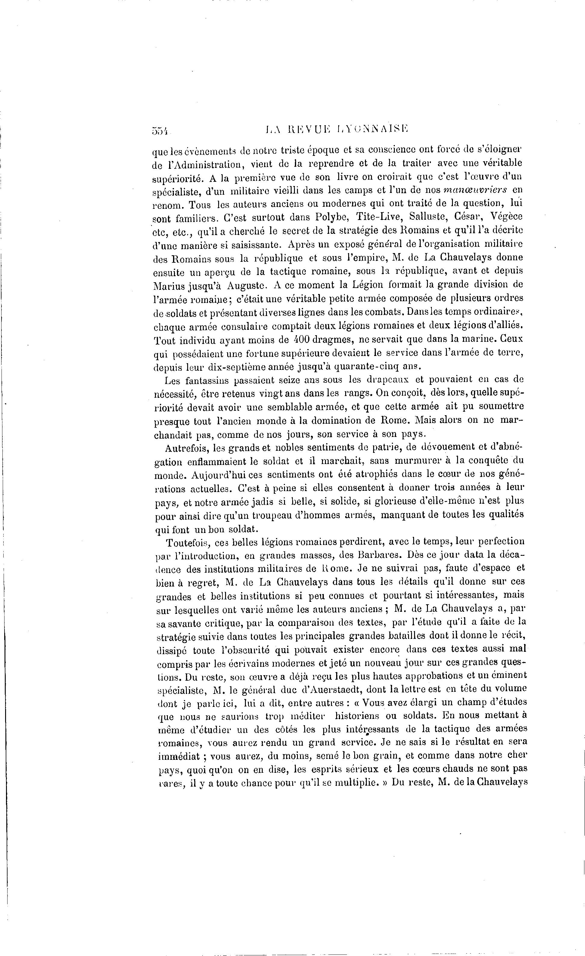 55'i LA U K V U K 1, Vc;NiN AISI-: que les événements de notre triste époque et sa conscience ont forcé de s'éloigner de l'Administration, vient de la reprendre et de la traiter avec une véritable supériorité. A la première vue do son livre on croirait que c'est l'œuvre d'un spécialiste, d'un militaire vieilli dans les camps et l'un de nos manœuvriers en renom. Tous les auteurs anciens ou modernes qui ont traité de la question, lui sont familiers. C'est surtout dans Polybe, Tite-Live, Salluste, César, Végèce ctc, etc., qu'il a cherché le secret de la stratégie des Romains et qu'il l'a décrite d'une manière si saisissante. Après un exposé géne'ral de l'organisation militaire des Romains sous la république et sous l'empire, M. de La Chauvelays donne ensuite un aperçu de la tactique romaine, sous la république, avant et depuis Marius jusqu'à Auguste. A ce moment la Légion formait la grande division de l'armée romaijie ; c'était une véritable petite armée composée de plusieurs ordres de soldats et présentant diverses lignes dans les combats. Dans les temps ordinaire:--, chaque armée consulaire comptait deux légions romaines et deux légions d'alliés. Tout individu ayant moins de 400 dragmes, ne servait que dans la marine. Ceux qui possédaient une fortune supérieure devaient le service dans l'armée de terre, depuis leur dix-septième année jusqu'à quarante-cinq ans. Les fantassins passaient seize ans sous les drapeaux et pouvaient en cas de nécessité, être retenus vingt ans dans les rangs. On conçoit, dès lors, quelle supé- riorité devait avoir une semblable armée, et que cette armée ait pu soumettre presque tout l'ancien monde à la domination de Rome. Mais alors on no mar- chandait pas, comme de nos jours, son service à son pays. Autrefois, les grands et nobles sentiments do patrie, de dévouement et d'abné- gation enflammaient le soldat et il marchait, sans murmurer à la conquête du monde. Aujourd'hui ces sentiments ont élé atrophiés dans le cœur de nos géné- rations actuelles. C'est à peine si elles consentent à donner trois années à leur pays, et notre armée jadis si belle, si solide, si glorieuse d'elle-même n'est plus pour ainsi dire qu'un troupeau d'hommes armés, manquant de toutes les qualités qui font un bon soldat. Toutefois, ces belles légions romaines perdirent, avec le temps, leur perfection par l'introduction, en grandes masses, des Barbares. Dès ce jour data la déca- dence des institutions militaires de Rome. Je ne suivrai pas, faute d'espace et bien à regret, M. de La Chauvelays dans tous les détails qu'il donne sur ces grandes et belles institutions si peu connues et pourtant si intéressantes, mais sur lesquelles ont varié même les auteurs anciens ; M. de La Chauvelays a, par sa savante critique, par la comparaison des textes, par l'étude qu'il a faite de la stratégie suivie dans toutes les principales grandes batailles dont il donne le récit, dissipé toute l'obscurité qui pouvait exister encore dans ces textes aussi mal compris par les écrivains modernes et jeté un nouveau jour sur ces grandes ques- tions. Du reste, son œuvre a déjà reçu les plus hautes approbations et un éminent spécialiste, M. le général duc d'Auerstaedt, dont la lettre est en tête du volume dont je parle ici, lui a dit, entre autres : « Vous avez élargi un champ d'études que nous ne saurions trop méditer historiens ou soldats. En nous mettant à même d'étudier un des côtés les plus intéressants de la tactique des armées romaines, vous aurez rendu un grand service. Je ne sais si le résultat en sera immédiat ; vous aurez, du moins, semé le bon grain, et comme dans notre cher pays, quoi qu'on on en dise, les esprits sérieux et les cœurs chauds ne sont pas rares, il y a toute chance pour qu'il se multiplie. » Du reste, M. de la Chauvelays