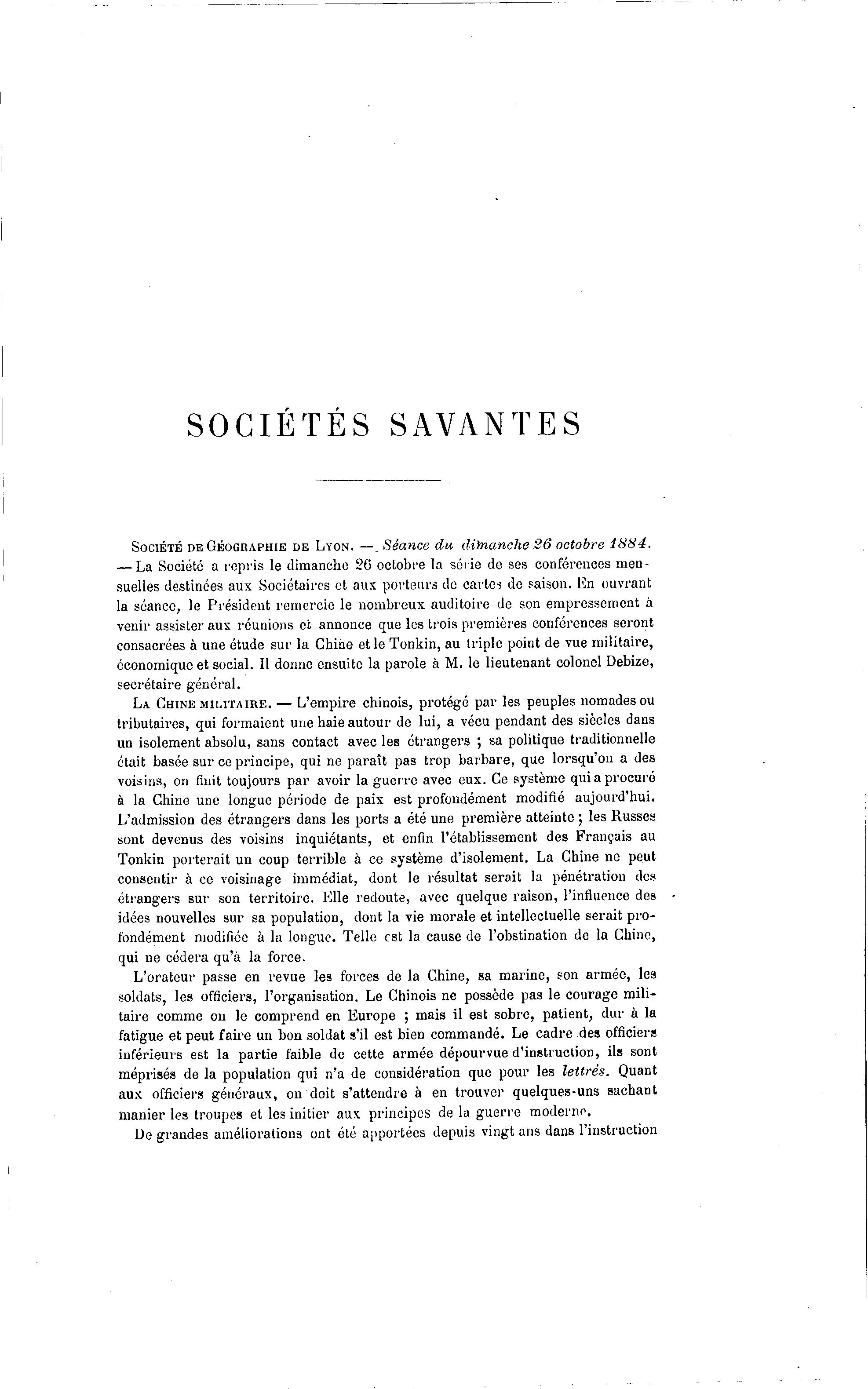 SOCIETES SAVANTES SOCIÉTÉ DE GÉOGRAPHIE DE LYON. —. Séance du dilnanche 26 octobre 1884. — La Société a repris le dimanche 26 octobre la série de ses conférences men- suelles destinées aux Sociétaires et aux porteurs de cartes de saison. En ouvrant la séance, le Président remercie le nombreux auditoire de son empressement à venir assister aux réunions et annonce que les trois premières conférences seront consacrées à une étude sur la Chine et le Tonkin, au triple point de vue militaire, économique et social. Il donne ensuite la parole à M. le lieutenant colonel Debize, secrétaire général. LA. CHINE MILITAIRE. — L'empire chinois, protégé par les peuples nomades ou tributaires, qui formaient une haie autour de lui, a vécu pendant des siècles dans un isolement absolu, sans contact avec les étrangers ; sa politique traditionnelle était basée sur ce principe, qui ne paraît pas trop barbare, que lorsqu'on a des voisins, on finit toujours par avoir la guerre avec eux. Ce système qui a procuré à la Chine une longue période de paix est profondément modifié aujourd'hui. L'admission des étrangers dans les ports a été une première atteinte ; les Russes sont devenus des voisins inquiétants, et enfin l'établissement des Français au Tonkin porterait un coup terrible à ce système d'isolement. La Chine ne peut consentir à ce voisinage immédiat, dont le résultat serait la pénétration des étrangers sur son territoire. Elle redoute, avec quelque raison, l'influence des idées nouvelles sur sa population, dont la vie morale et intellectuelle serait pro- fondément modifiée à la longue. Telle est la cause de l'obstination de la Chine, qui ne cédera qu'à la force. L'orateur passe en revue les forces de la Chine, sa marine, son armée, les soldats, les officiers, l'organisation. Le Chinois ne possède pas le courage mili- taire comme on le comprend en Europe ; mais il est sobre, patient, dur à la fatigue et peut faire un bon soldat s'il est bien commandé. Le cadre des officiers inférieurs est la partie faible de cette armée dépourvue d'instruction, ils sont méprisés de la population qui n'a de considération que pour les lettrés. Quant aux officiers généraux, on doit s'attendre à en trouver quelques-uns sachant manier les troupes et les initier aux principes de la guerre moderne. De grandes améliorations ont été apportées depuis vingt ans dans l'instruction