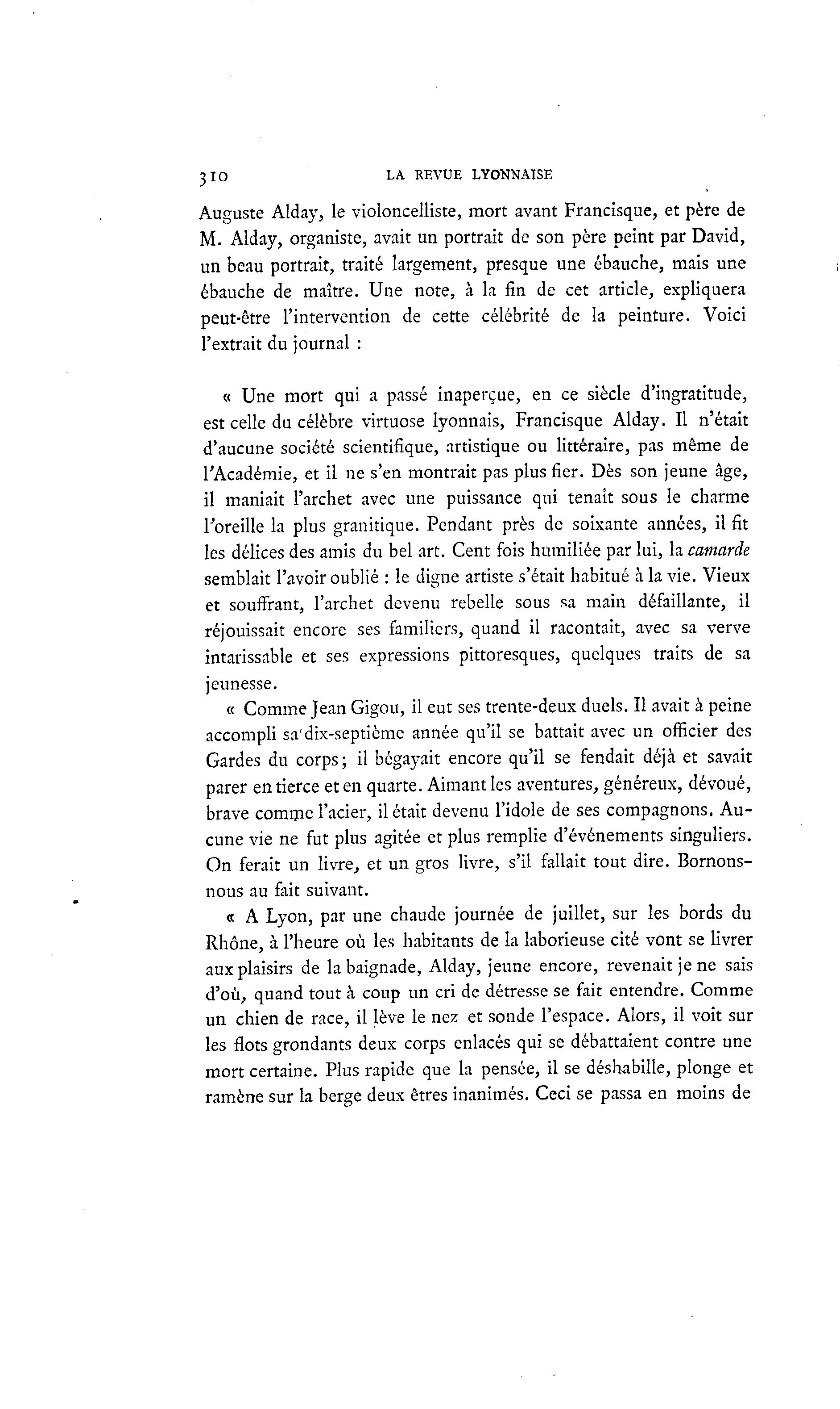 310 LA REVUE LYONNAISE Auguste Alday, le violoncelliste, mort avant Francisque, et père de M. Alday, organiste, avait un portrait de son père peint par David, un beau portrait, traité largement, presque une ébauche, mais une ébauche de maître. Une note, à la fin de cet article, expliquera peut-être l'intervention de cette célébrité de la peinture. Voici l'extrait du journal : « Une mort qui a passé inaperçue, en ce siècle d'ingratitude, est celle du célèbre virtuose lyonnais, Francisque Alday. Il n'était d'aucune société scientifique, artistique ou littéraire, pas même de l'Académie, et il ne s'en montrait pas plus fier. Dès son jeune âge, il maniait l'archet avec une puissance qui tenait sous le charme l'oreille la plus granitique. Pendant près de soixante années, il fit les délices des amis du bel art. Cent fois humiliée par lui, la camarde semblait l'avoir oublié : le digne artiste s'était habitué à la vie. Vieux et souffrant, l'archet devenu rebelle sous sa main défaillante, il réjouissait encore ses familiers, quand il racontait, avec sa verve intarissable et ses expressions pittoresques, quelques traits de sa jeunesse. « Comme Jean Gigou, il eut ses trente-deux duels. Il avait à peine accompli sa'dix-septième année qu'il se battait avec un officier des Gardes du corps; il bégayait encore qu'il se fendait déjà et savait parer en tierce et en quarte. Aimant les aventures, généreux, dévoué, brave comme l'acier, il était devenu l'idole de ses compagnons. Au- cune vie ne fut plus agitée et plus remplie d'événements singuliers. On ferait un livre, et un gros livre, s'il fallait tout dire. Bornons- nous au fait suivant. « A Lyon, par une chaude journée de juillet, sur les bords du Rhône, à l'heure où les habitants de la laborieuse cité vont se livrer aux plaisirs de la baignade, Alday, jeune encore, revenait je ne sais d'où, quand tout à coup un cri de détresse se fait entendre. Comme un chien de race, il lève le nez et sonde l'espace. Alors, il voit sur les flots grondants deux corps enlacés qui se débattaient contre une mort certaine. Plus rapide que la pensée, il se déshabille, plonge et ramène sur la berge deux êtres inanimés. Ceci se passa en moins de