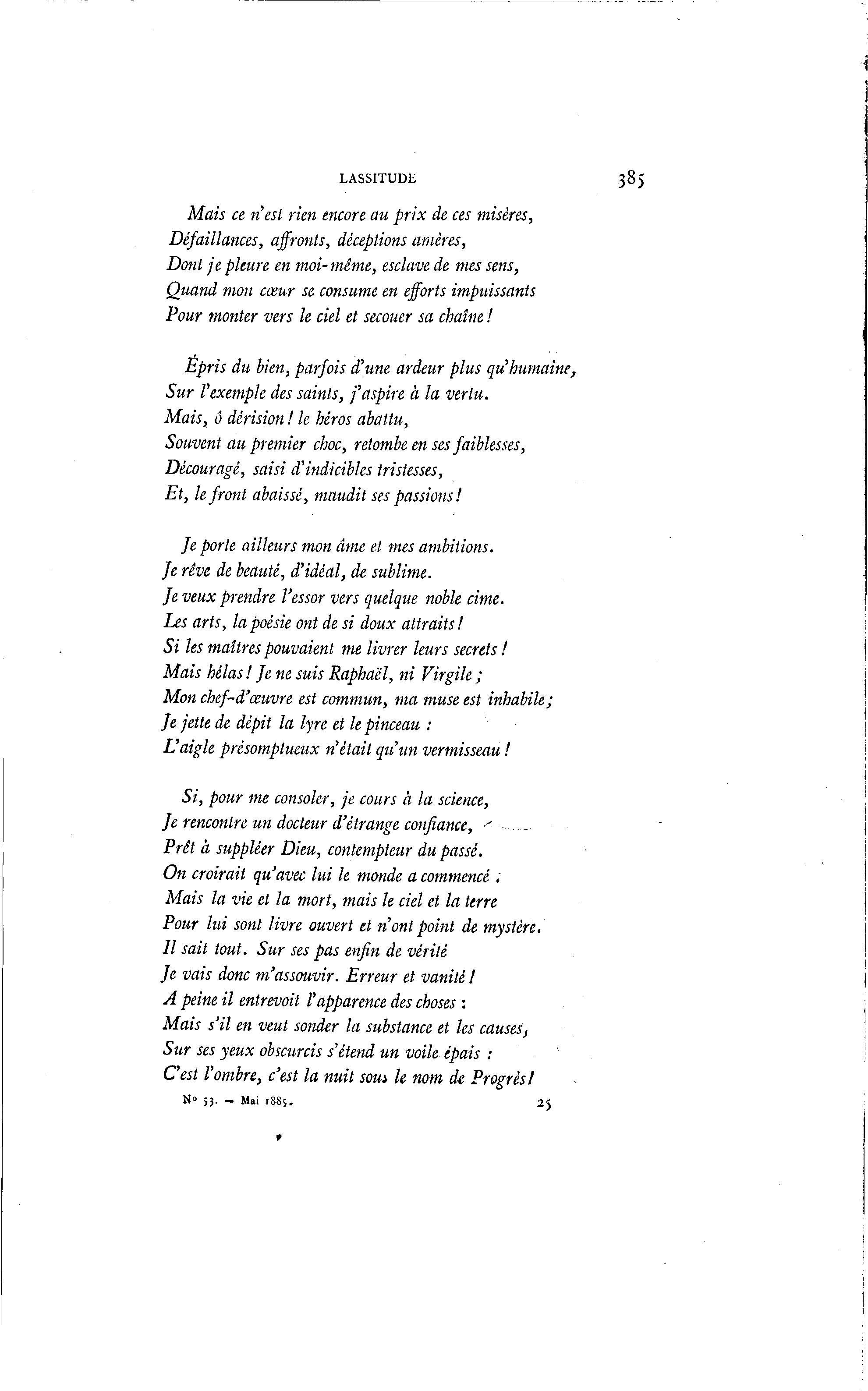 LASSITUDE 385 Mais ce n'est rien encore au prix de ces misères, Défaillances, affronts, déceptions arrières, Dont je pleure en moi-même, esclave de mes sens, Quand mon cœur se consume en efforts impuissants Pour monter vers le ciel et secouer sa chaîne ! Épris du bien, parfois d'une ardeur plus qu'humaine, Sur l'exemple des saints, j'aspire à la vertu. Mais, ô dérision ! le héros abattu, Souvent au premier choc, retombe en ses faiblesses, Découragé, saisi d'indicibles tristesses, Et, le front abaissé, maudit ses passions! fe porte ailleurs mon âme et mes ambitions. Je rêve de beauté, d'idéal, de sublime. Je veux prendre l'essor vers quelque noble cime. Les arts, la poésie ont de si doux attraits! Si les maîtres pouvaient me livrer leurs secrets ! Mais hélas! Je ne suis Raphaël, ni Virgile ; Mon chef-d'œuvre est commun, ma muse est inhabile; Je jette de dépit la lyre et le pinceau : L'aigle présomptueux n'était qu'un vermisseau ! Si, pour me consoler, je cours à la science, Je rencontre un docteur d'étrange confiance, •' - Prêt à suppléer Dieu, contempteur du passé. On croirait qu'avec lui le monde a commencé . Mais la vie et la mort, mais le ciel et la terre Pour lui sont livre ouvert et n'ont point de mystère. Il sait tout. Sur ses pas enfin de vérité Je vais donc m'assouvir. Erreur et vanité ! A peine il entrevoit V apparence des choses : Mais s'il en veut sonder la substance et les causes, Sur ses yeux obscurcis s'étend un voile épais : C'est l'ombre, c'est la nuit sous, h nom de Progrès! N° 53. - Mai 138;. 2J