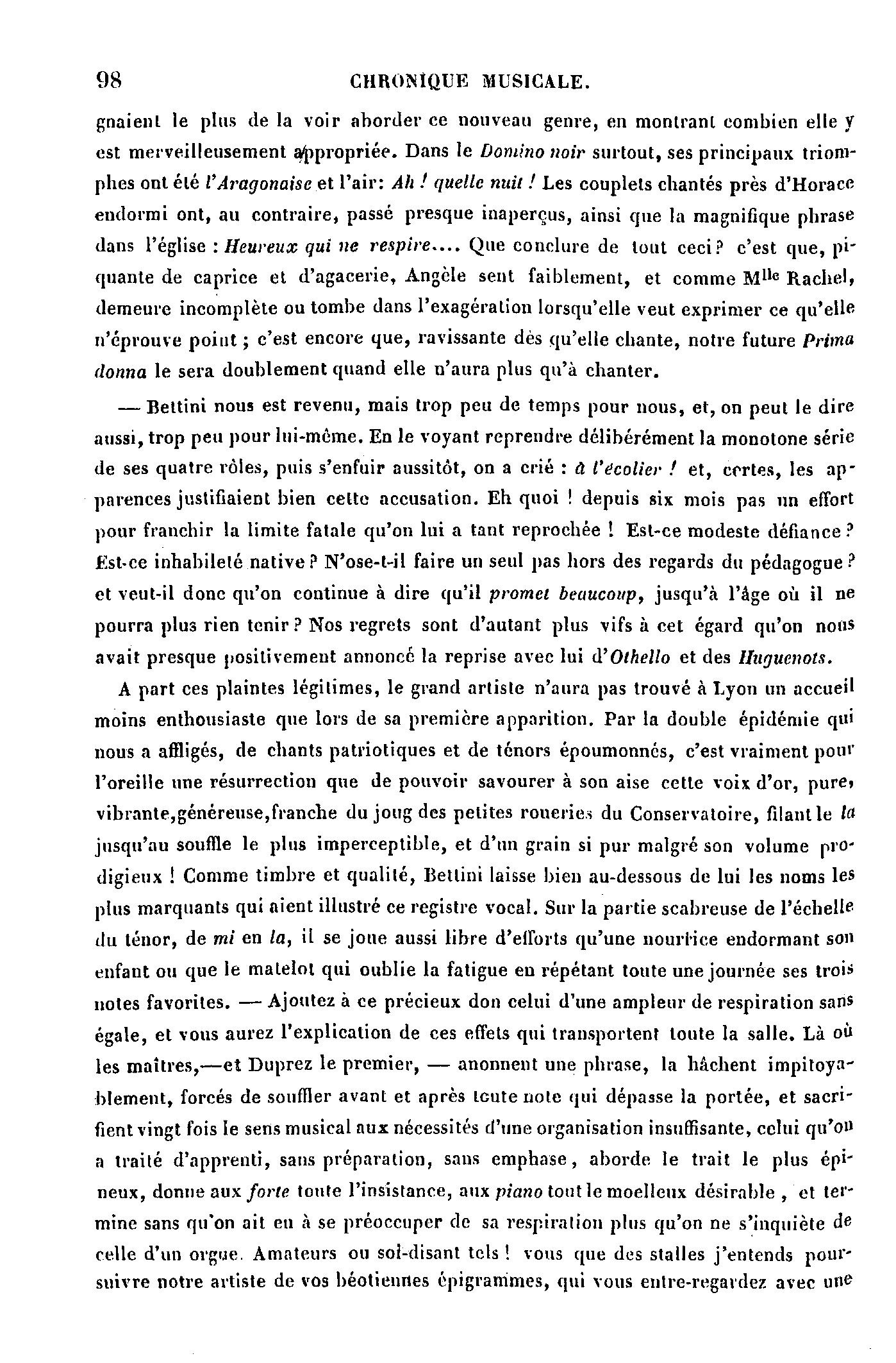 98 CHRONIQUE MUSICALE. gnaienl le plus de la voir ahorder ce nouveau genre, en montrant combien elle V est merveilleusement appropriée. Dans le Domino noir surtout, ses principaux triom- phes ont été l'Aragonaise et l'air: Ah ! quelle nuil ! Les couplets chantés près d'Horace endormi ont, au contraire, passé presque inaperçus, ainsi que la magnifique phrase dans l'église '.Heureux qui ne respire.... Que conclure de tout ceci? c'est que, pi- quante de caprice et d'agacerie, Angèle sent faiblement, et comme M lle Rachel, demeure incomplète ou tombe dans l'exagération lorsqu'elle veut exprimer ce qu'elle n'éprouve point ; c'est encore que, ravissante dès qu'elle chante, notre future Prima donna le sera doublement quand elle n'aura plus qu'à chanter. — Bettini nous est revenu, mais trop peu de temps pour nous, et, on peut le dire aussi, trop peu pour lui-même. En le voyant reprendre délibérément la monotone série de ses quatre rôles, puis s'enfuir aussitôt, on a crié : à l'écolier ! et, certes, les ap- parences justifiaient bien cette accusation. Eh quoi ! depuis six mois pas un effort pour franchir la limite fatale qu'on lui a tant reprochée ! Est-ce modeste défiance ? Est-ce inhabileté native? N'ose-t-il faire un seul pas hors des regards du pédagogue? et veut-il donc qu'on continue à dire qu'il promet beaucoup, jusqu'à l'âge où il ne pourra plus rien tenir? Nos regrets sont d'autant plus vifs à cet égard qu'on nous avait presque positivement annoncé la reprise avec lui d'Othello et des Huguenots. A part ces plaintes légitimes, le grand artiste n'aura pas trouvé à Lyon un accueil moins enthousiaste que lors de sa première apparition. Par la double épidémie qu' nous a affligés, de chants patriotiques et de ténors époumonnés, c'est vraiment pour l'oreille une résurrection que de pouvoir savourer à son aise cette voix d'or, pure> vibrante,généreuse,franche du joug des petites roueries du Conservatoire, filant le la jusqu'au souffle le plus imperceptible, et d'un grain si pur malgré son volume pro- digieux ! Comme timbre et qualité, Bettini laisse bien au-dessous de lui les noms les plus marquants qui nient illustré ce registre vocal. Sur la partie scabreuse de l'échelle du ténor, de mi en la, il se joue aussi libre d'efforts qu'une nourrice endormant son enfant ou que le matelot qui oublie la fatigue en répétant toute une journée ses trois notes favorites. — Ajoutez à ce précieux don celui d'une ampleur de respiration sans égale, et vous aurez l'explication de ces effets qui transportent toute la salle. Là où les maîtres,—et Duprez le premier, — anonnent une phrase, la hachent impitoya- blement, forcés de souffler avant et après leute note qui dépasse la portée, et sacri- fient vingt fois le sens musical aux nécessités d'une organisation insuffisante, celui qu'on a traité d'apprenti, sans préparation, sans emphase, aborde le trait le plus épi- neux, donne aux forte toute l'insistance, aux piano tout le moelleux désirable , et ter- mine sans qu'on ait en à se préoccuper de sa respiration plus qu'on ne s'inquiète de celle d'un orgue. Amateurs ou soi-disant tels ! vous que des stalles j'entends pour- suivre notre artiste de vos béotiennes 6pigrairim.es, qui vous entre-regardez avec une