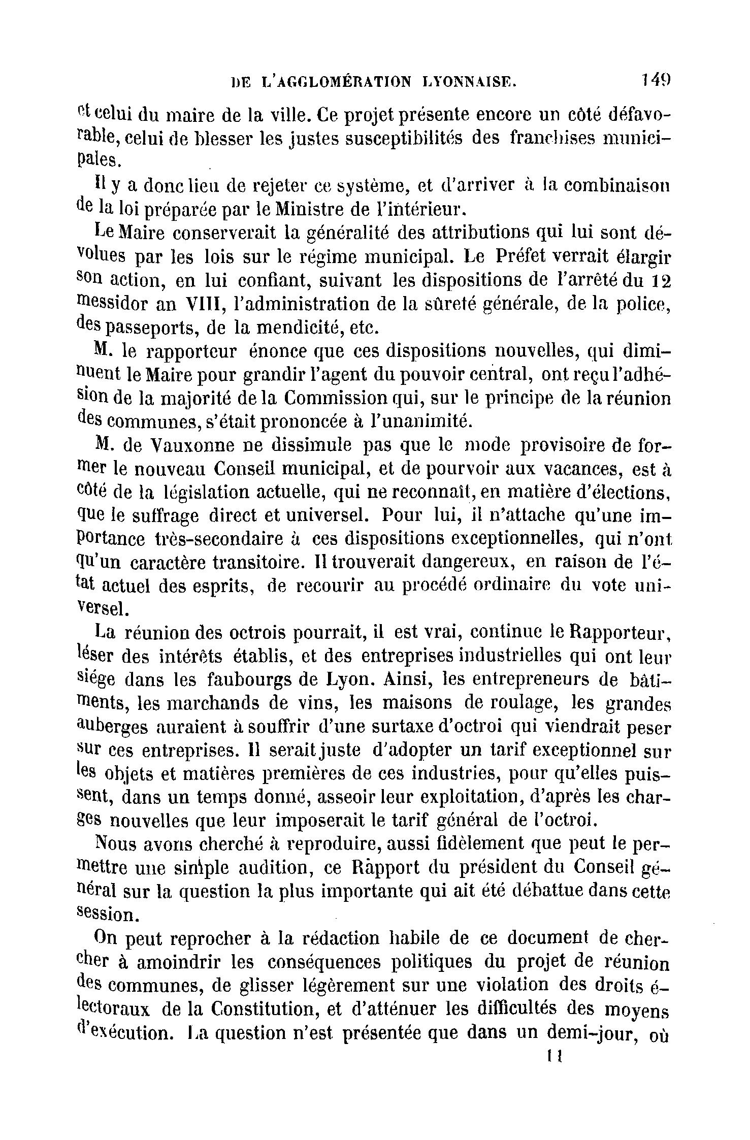 DE L'AGGLOMÉRATION LYONNAISE. 149 et celui du maire de la ville. Ce projet présente encore un côté défavo- rable, celui de blesser les justes susceptibilités des franchises munici- pales. '1 y a donc lieu de rejeter ce système, et d'arriver à la combinaison de la loi préparée par le Ministre de l'intérieur. Le Maire conserverait la généralité des attributions qui lui sont dé- volues par les lois sur le régime municipal. Le Préfet verrait élargir s on action, en lui confiant, suivant les dispositions de l'arrêté du 12 Messidor an VIII, l'administration de la sûreté générale, de la police, ^ s passeports, de la mendicité, etc. M. le rapporteur énonce que ces dispositions nouvelles, qui dimi- nuent le Maire pour grandir l'agent du pouvoir central, ont reçul'adhé- s 'on de la majorité de la Commission qui, sur le principe de la réunion des communes, s'était prononcée à l'unanimité. M. de Vauxonne ne dissimule pas que le mode provisoire de for- m er le nouveau Conseil municipal, et de pourvoir aux vacances, est à eoté de la législation actuelle, qui ne reconnaît, en matière d'élections, lue le suffrage direct et universel. Pour lui, il n'attache qu'une im- portance très-secondaire à ces dispositions exceptionnelles, qui n'ont lu'un caractère transitoire. Il trouverait dangereux, en raison de l'é- tat actuel des esprits, de recourir au procédé ordinaire du vote uni- versel. La réunion des octrois pourrait, il est vrai, continue le Rapporteur, léser des intérêts établis, et des entreprises industrielles qui ont leur siège dans les faubourgs de Lyon. Ainsi, les entrepreneurs de bâti— m ents, les marchands de vins, les maisons de roulage, les grandes auberges auraient à souffrir d'une surtaxe d'octroi qui viendrait peser s ur ces entreprises. Il serait juste d'adopter un tarif exceptionnel sur 'es objets et matières premières de ces industries, pour qu'elles puis- sent, dans un temps donné, asseoir leur exploitation, d'après les char- 8es nouvelles que leur imposerait le tarif général de l'octroi. Nous avons cherché à reproduire, aussi fidèlement que peut le per- mettre une siniple audition, ce Rapport du président du Conseil gé- néral sur la question la plus importante qui ait été débattue dans cette s ession. On peut reprocher à la rédaction habile de ce document de cher- cher à amoindrir les conséquences politiques du projet de réunion des communes, de glisser légèrement sur une violation des droits é- 'ectoraux de la Constitution, et d'atténuer les difficultés des moyens d'exécution. La question n'est présentée que dans un demi-jour, où 11