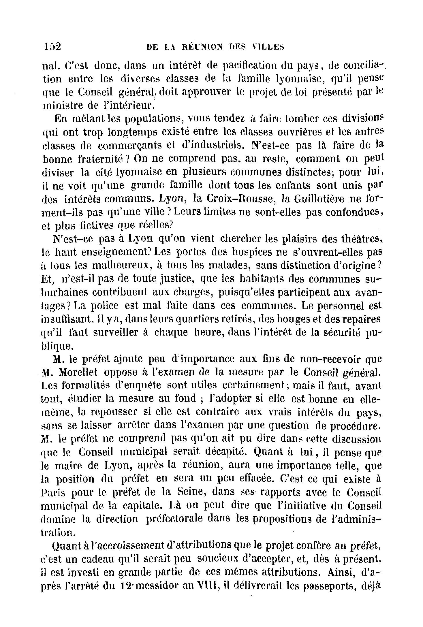 152 DE LA RÉUNION DES VILLES nal. C'est donc, dans un intérêt de pacification du pays, de concilia- tion entre les diverses classes de la famille lyonnaise, qu'il pense que le Conseil général, doit approuver le projet de loi présenté par le ministre de l'intérieur. En mêlant les populations, vous tendez à faire tomber ces division* qui ont trop longtemps existé entre les classes ouvrières et les autres classes de commerçants et d'industriels. N'est-ce pas là faire de la bonne fraternité ? On ne comprend pas, au reste, comment on peut diviser la cité lyonnaise en plusieurs communes distinctes; pour lui, il ne voit qu'une grande famille dont tous les enfants sont unis par des intérêts communs. Lyon, la Croix-Rousse, la Guillotière ne for- ment-ils pas qu'une ville ? Leurs limites ne sont-elles pas confondues, et plus fictives que réelles? N'est-ce pas à Lyon qu'on vient chercher les plaisirs des théâtres, le haut enseignement? Les portes des hospices ne s'ouvrent-elles pas à tous les malheureux, à tous les malades, sans distinction d'origine ? Et, n'est-il pas de toute justice, que les habitants des communes su- burbaines contribuent aux charges, puisqu'elles participent aux avan- tages? La police est mal faite dans ces communes. Le personnel est insuffisant, il y a, dans leurs quartiers retirés, des bouges et des repaires qu'il faut surveiller à chaque heure, dans l'intérêt de la sécurité pu- blique. M. le préfet ajoute peu d'importance aux fins de non-recevoir que M. Morellet oppose à l'examen de la mesure par le Conseil général. Les formalités d'enquête sont utiles certainement; mais il faut, avant tout, étudier la mesure au fond ; l'adopter si elle est bonne en elle- même, la repousser si elle est contraire aux vrais intérêts du pays, sans se laisser arrêter dans l'examen par une question de procédure. M. le préfet ne comprend pas qu'on ait pu dire dans cette discussion que le Conseil municipal serait décapité. Quant à lui, il pense que le maire de Lyon, après la réunion, aura une importance telle, que la position du préfet en sera un peu effacée. C'est ce qui existe à Paris pour le préfet de la Seine, dans ses- rapports avec le Conseil municipal de la capitale. Là on peut dire que l'initiative du Conseil domine la direction préfectorale dans les propositions de l'adminis- tration. Quant à l'accroissement d'attributions que le projet confère au préfet, c'est un cadeau qu'il serait peu soucieux d'accepter, et, dès à présent, il est investi en grande partie de ces mêmes attributions. Ainsi, d'a- près l'arrêté du 12'messidor an VUI, il délivrerait les passeports, déjÃ