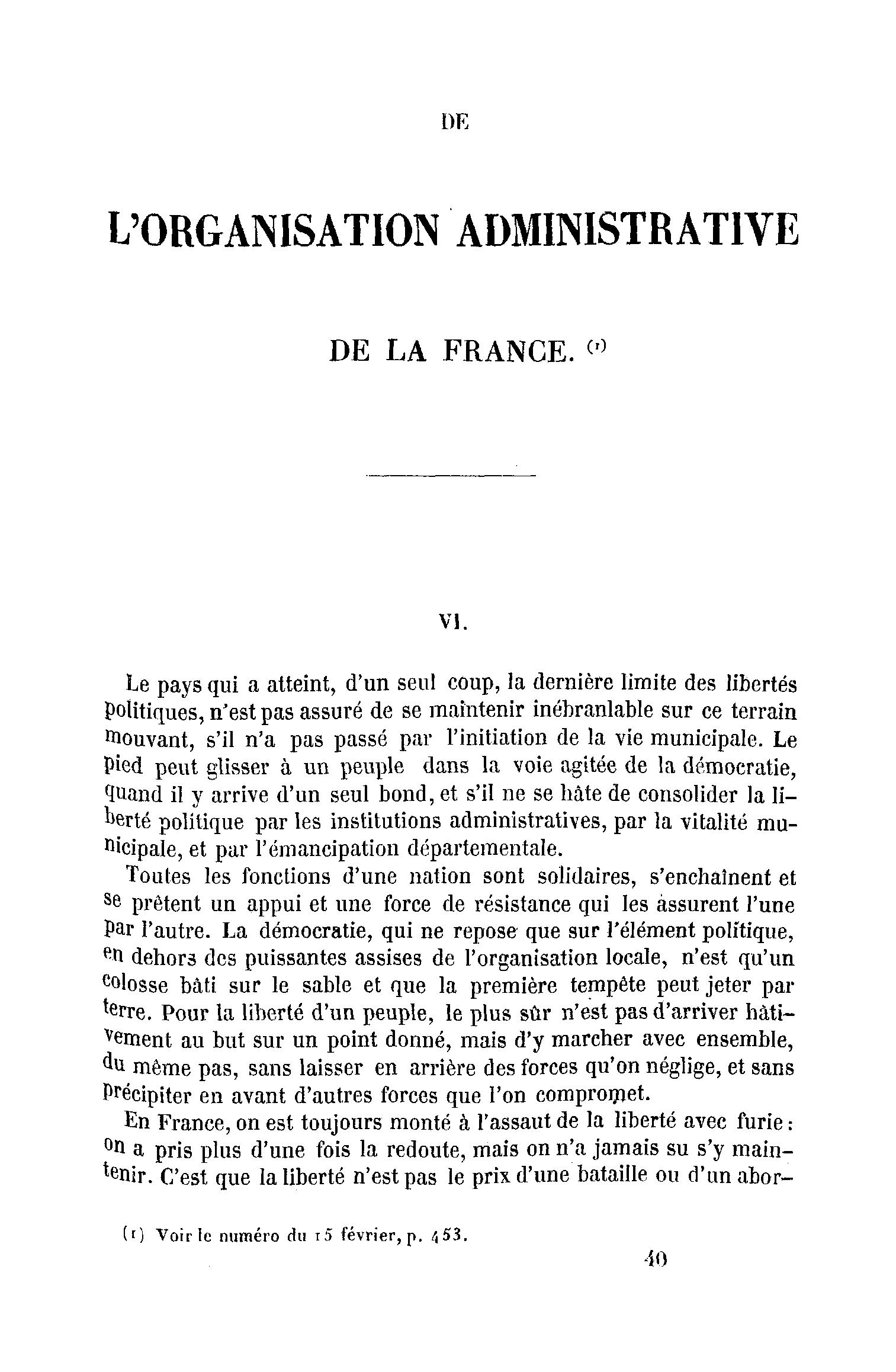 DE L'ORGANISATION ADMINISTRATIVE DE LA FRANCE. <° VI. Le pays qui a atteint, d'un seul coup, la dernière limite des libertés politiques, n'est pas assuré de se maintenir inébranlable sur ce terrain mouvant, s'il n'a pas passé par l'initiation de la vie municipale. Le Pied peut glisser à un peuple dans la voie agitée de la démocratie, luand il y arrive d'un seul bond, et s'il ne se hâte de consolider la li- berté politique par les institutions administratives, par la vitalité mu- nicipale, et par l'émancipation départementale. Toutes les fonctions d'une nation sont solidaires, s'enchaînent et Se prêtent un appui et une force de résistance qui les assurent l'une Par l'autre. La démocratie, qui ne repose que sur l'élément politique, e l dehors des puissantes assises de l'organisation locale, n'est qu'un c olosse bâti sur le sable et que la première tempête peut jeter par terre. Pour la liberté d'un peuple, le plus sûr n'est pas d'arriver hâti- vement au but sur un point donné, mais d'y marcher avec ensemble,