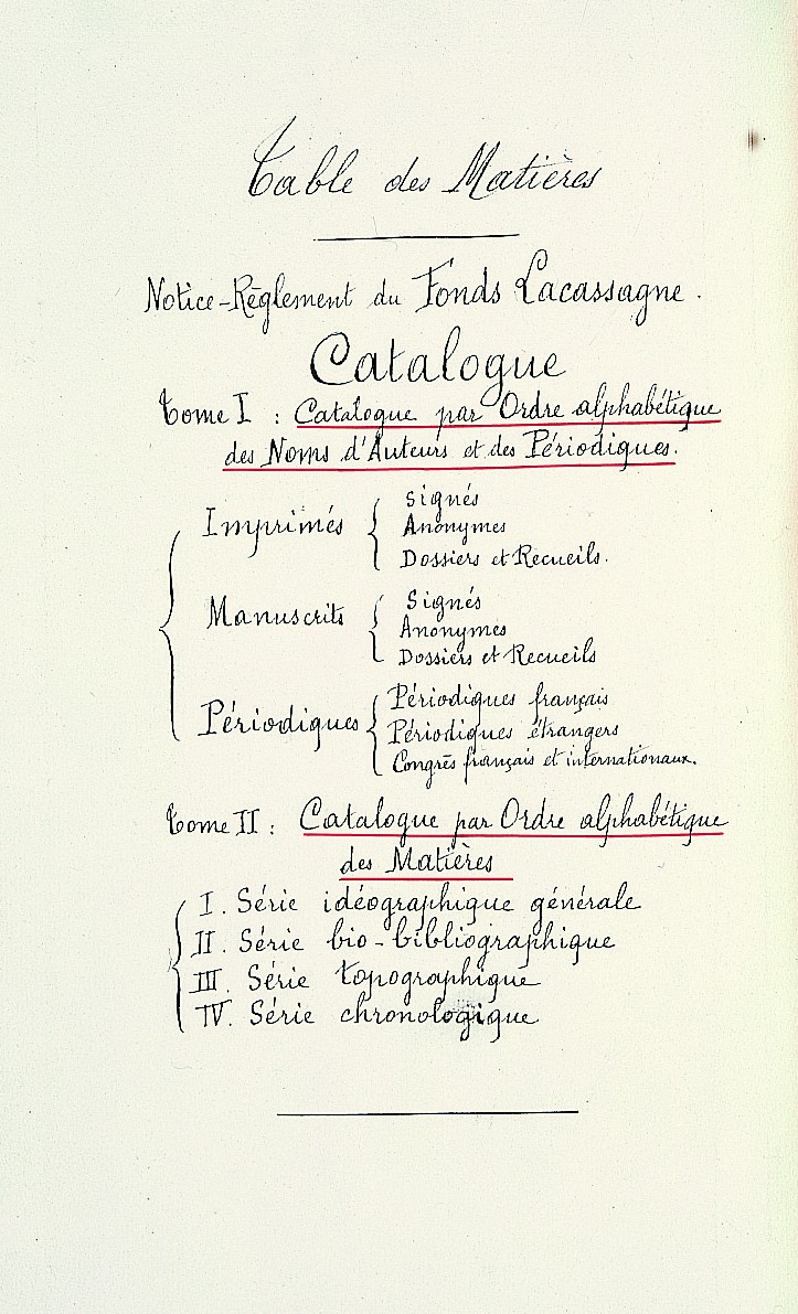 La collection de documents qui a été offerte le 28 février 1921, à la Bibliothèque de la Ville de Lyon, par M. le Professeur Jean-Alexandre-Eugène Lacassagne, et qui compte plus de 12.000 pièces (volumes, brochures, dossiers et manuscrits) [note]II importe de faire observer, à ce propos, que le Fonds Lacassagne a été amputé d'environ 1.500 à 2.000 ouvrages, la plupart très importants et très intéressants, qui ont été rendus au donateur comme étant déjà représentés dans le Fonds général de la Bibliothèque de la Ville, et qui par conséquent ne figurent pas dans le présent Catalogue., traduit et concrète fidèlement la pensée directrice de toute la carrière scientifique de son fondateur, à savoir : l'étude et la connaissance de l'Homme aux points de vue de l'Anthropologie normale et criminelle, de la Jurisprudence médicale, de la Psychologie normale et morbide, de la Pathologie médico-légale, de la Sociologie, de l'Hygiène et de la Statistique.