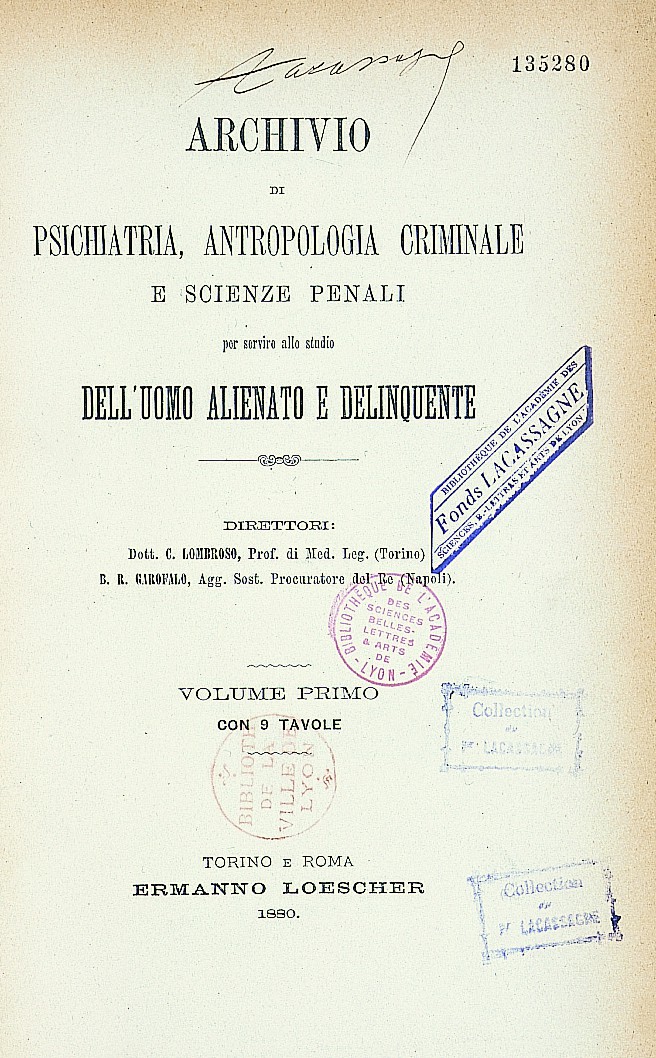 La revue se veut, dès le début, le parfait organe d'expression du mouvement d'anthropologie criminelle français, ou plus exactement « lyonnais ». Car tout se passe à Lyon, loin de la capitale. C'est dans cette ville que Lacassagne crée les Archives de l'anthropologie criminelle en 1886, revue qui veut incontestablement se positionner parallèlement à celle de Lombroso [note]Rappelons que Lombroso avait fondé l'Archivio di psichiatria e scienza penali en 1880, avec Ferri et Garofalo., et l'égaler. Et plus que l'égaler, la contrecarrer, voire la surpasser. La revue a plusieurs objectifs, un objectif politique, d'abord, en menant un débat avec Lombroso, un objectif scientifique, ensuite : Lacassagne est avant tout le promoteur ambitieux de cette idée qui ne l'est pas moins, créer ce qui manquait alors aux chercheurs français dispersés, un lieu d'expression ; enfin, un objectif « humain », puisque cette revue rassemble autour d'elle curieux, érudits, hommes de la profession ou autres... Une sorte d'organe de liaison, donc, de correspondance, un intermédiaire pour les médecins de province souvent isolés et sans autres ressources documentaires que leur bibliothèque.